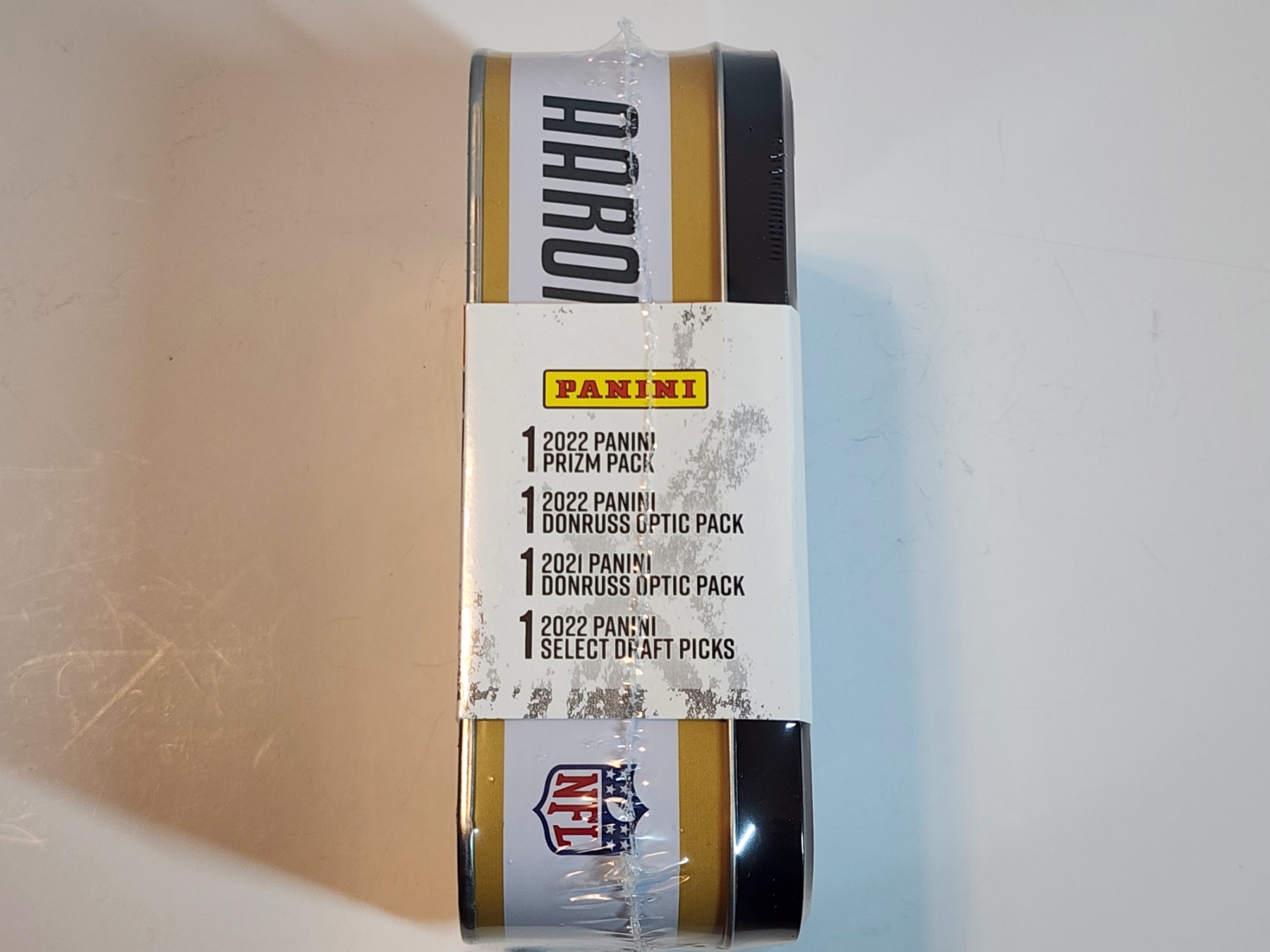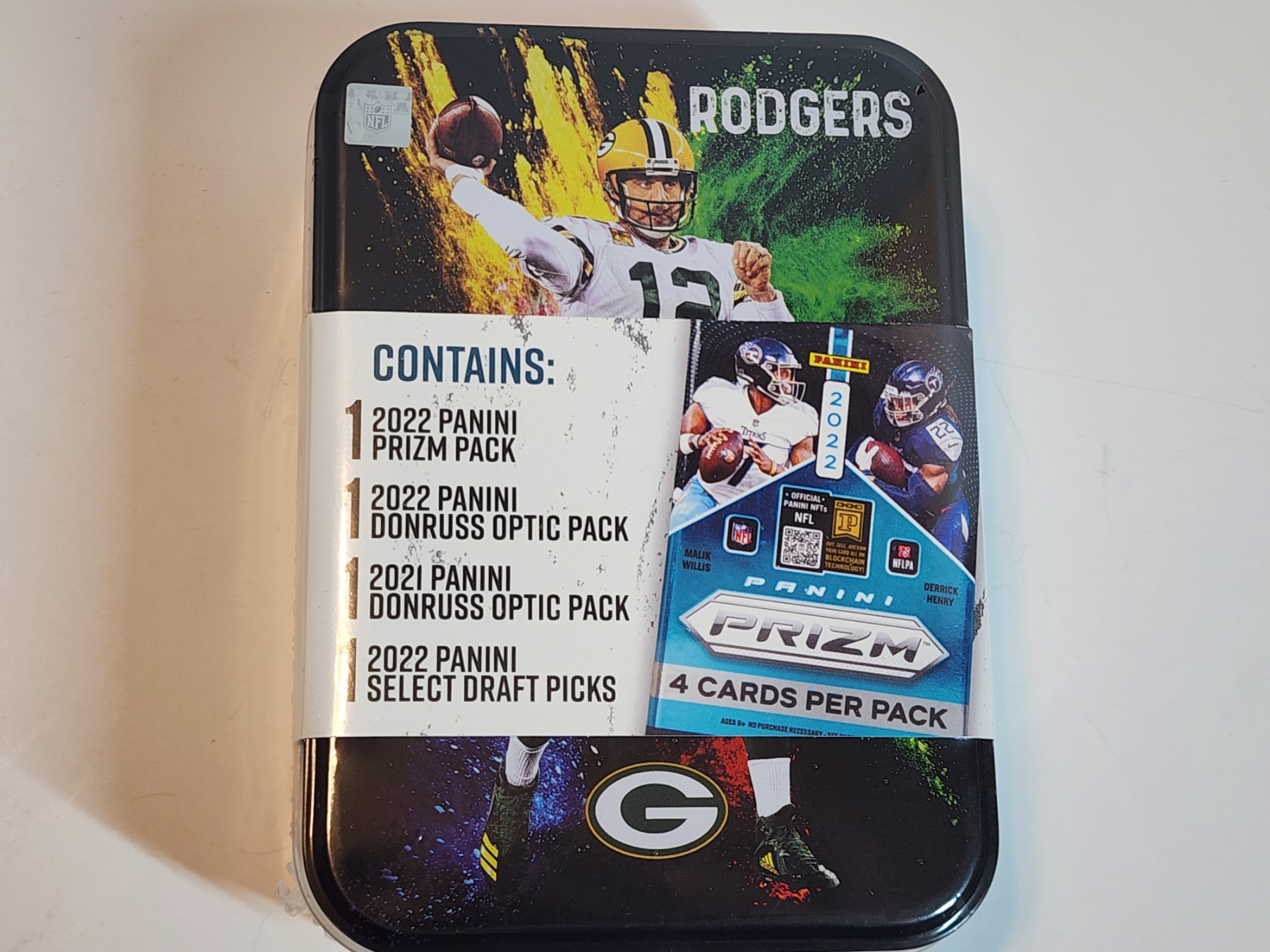 2022 Panini Prizm Aaron Rodgers NFL Collector's Tin Ft. Four Sealed Packs of Football Cards in Tin