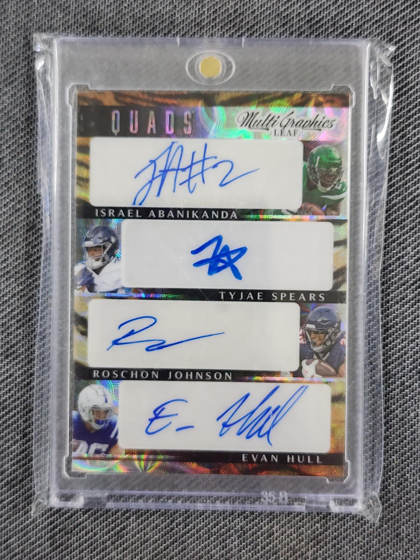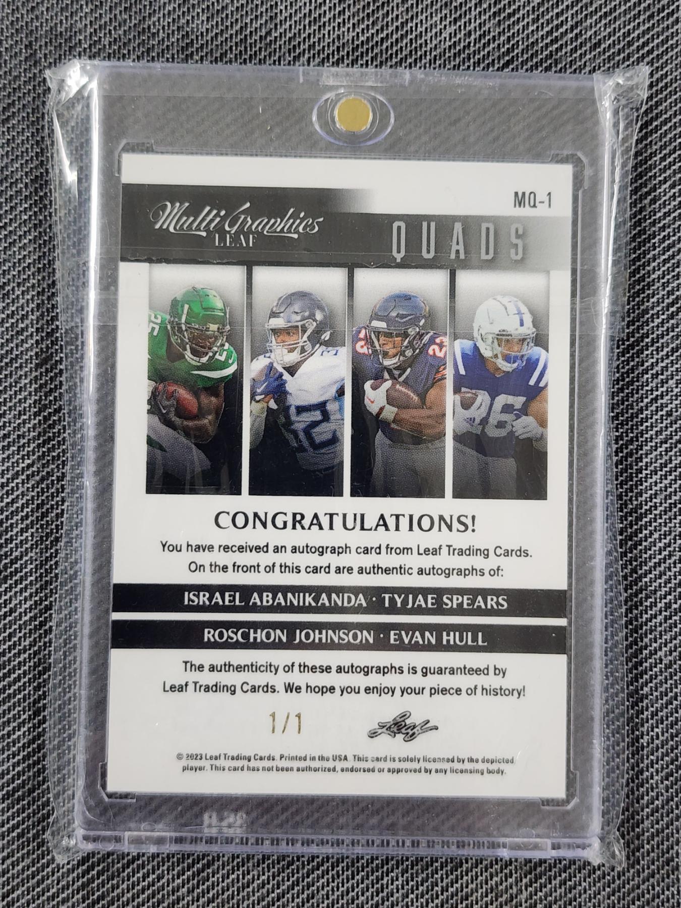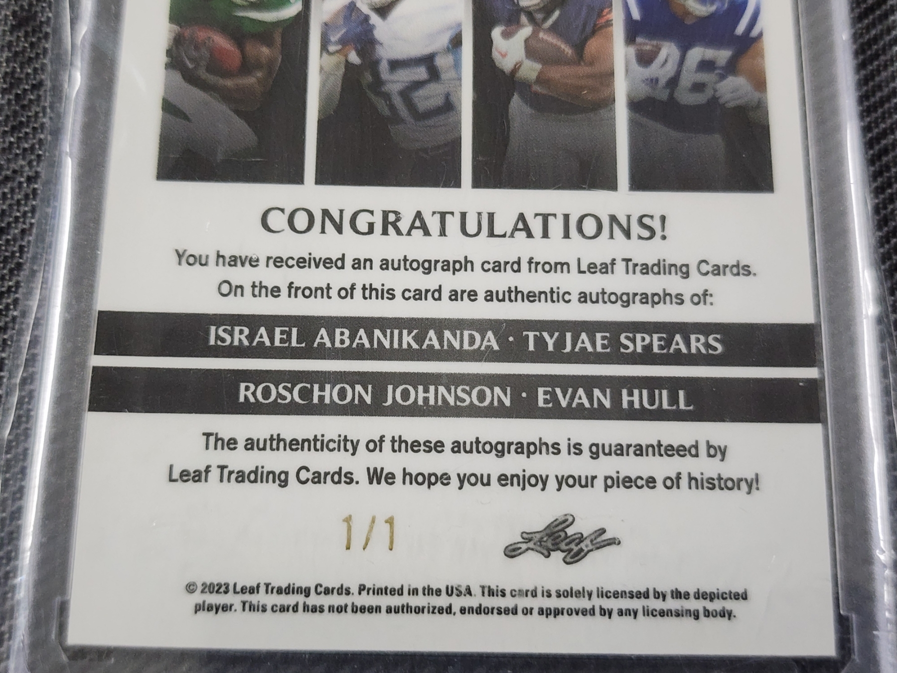 2023 Leaf 1 OF 1 MQ-1 Quads - Four Player Signed Trading Cards Ft. Tyjae Spears, Evan Hull & More!