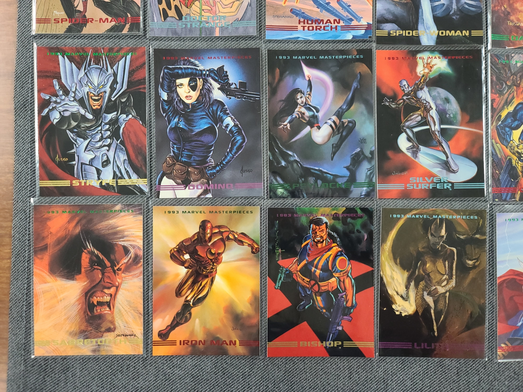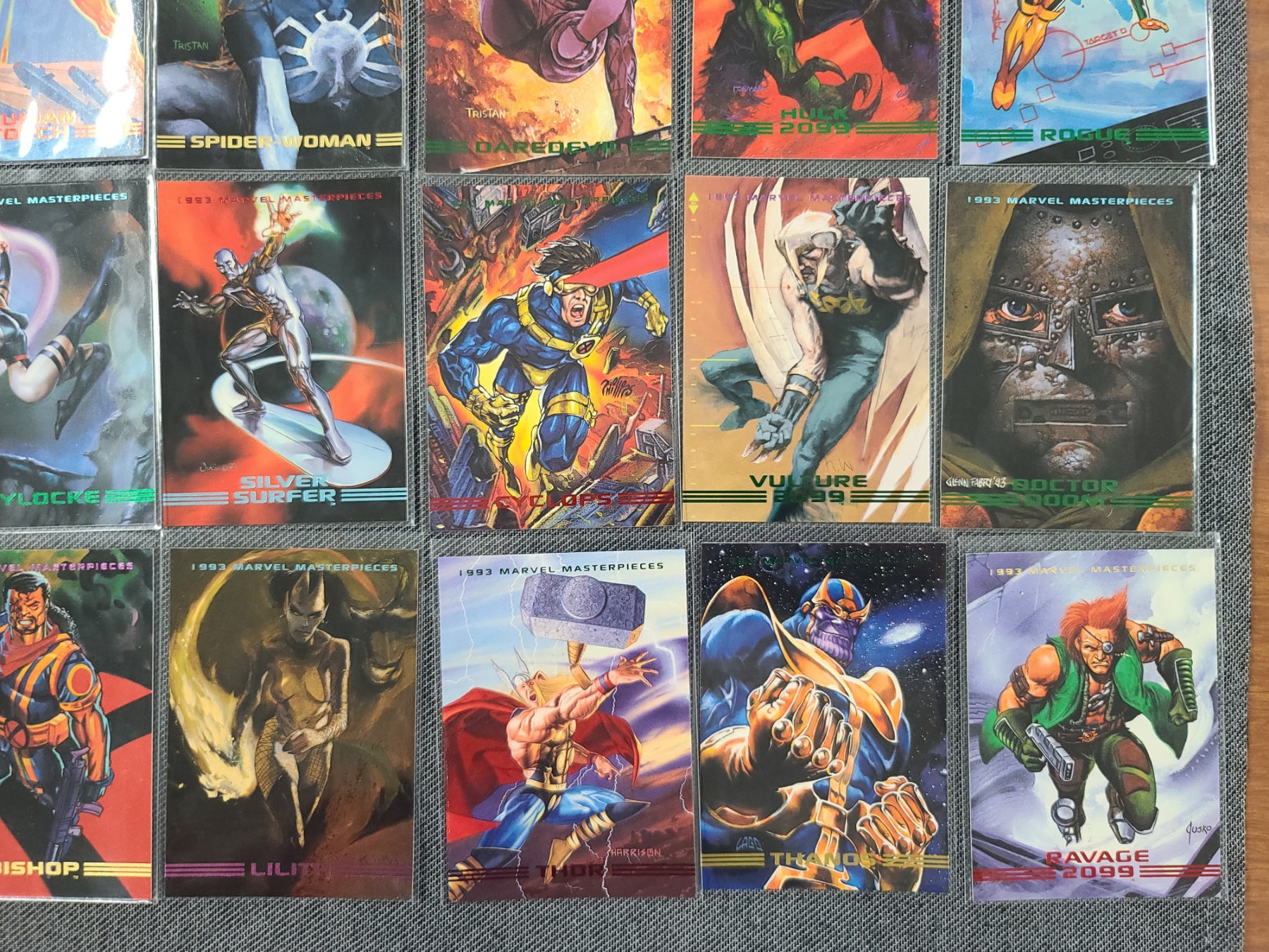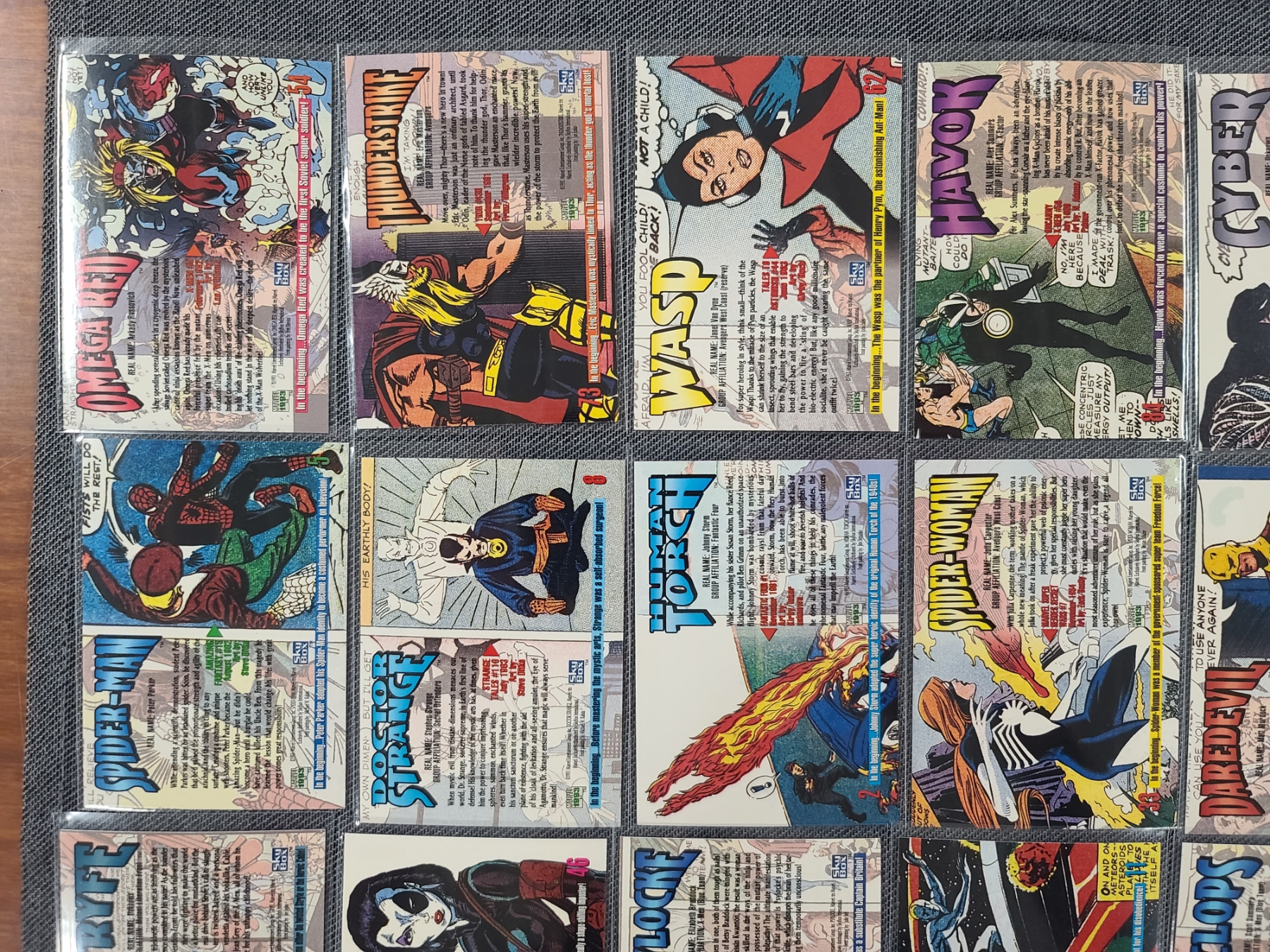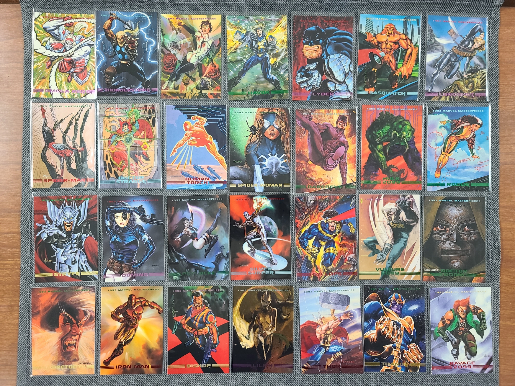28 Assorted 1993 Marvel Trading Cards - Near Mint - Including Spider-Man, Doctor Strange, Thanos & More