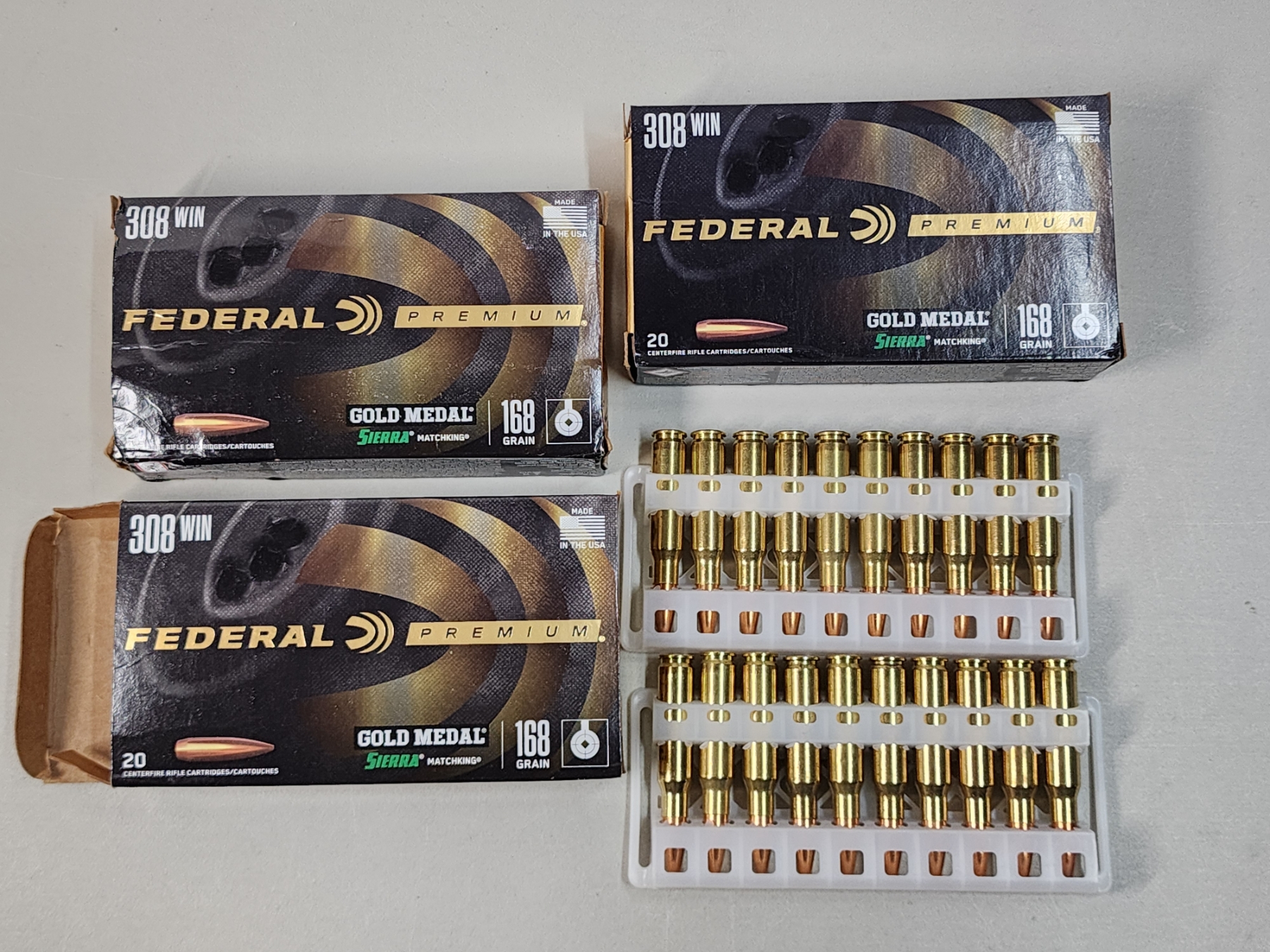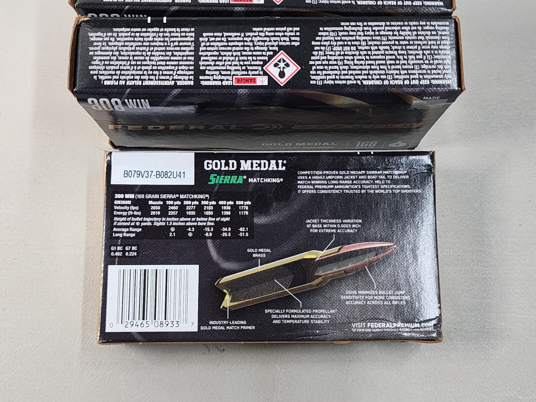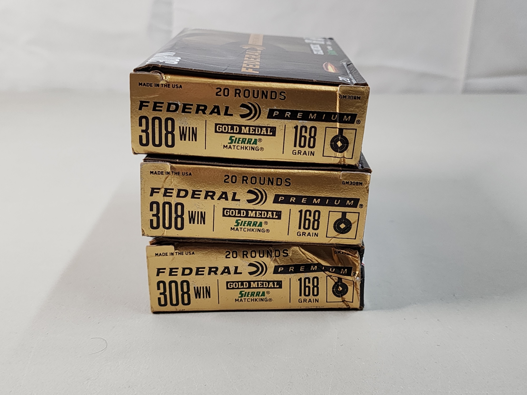 3 Full Boxes of Federal Premium Gold Medal 308 Winchester Ammunition - 60 Rounds Total
