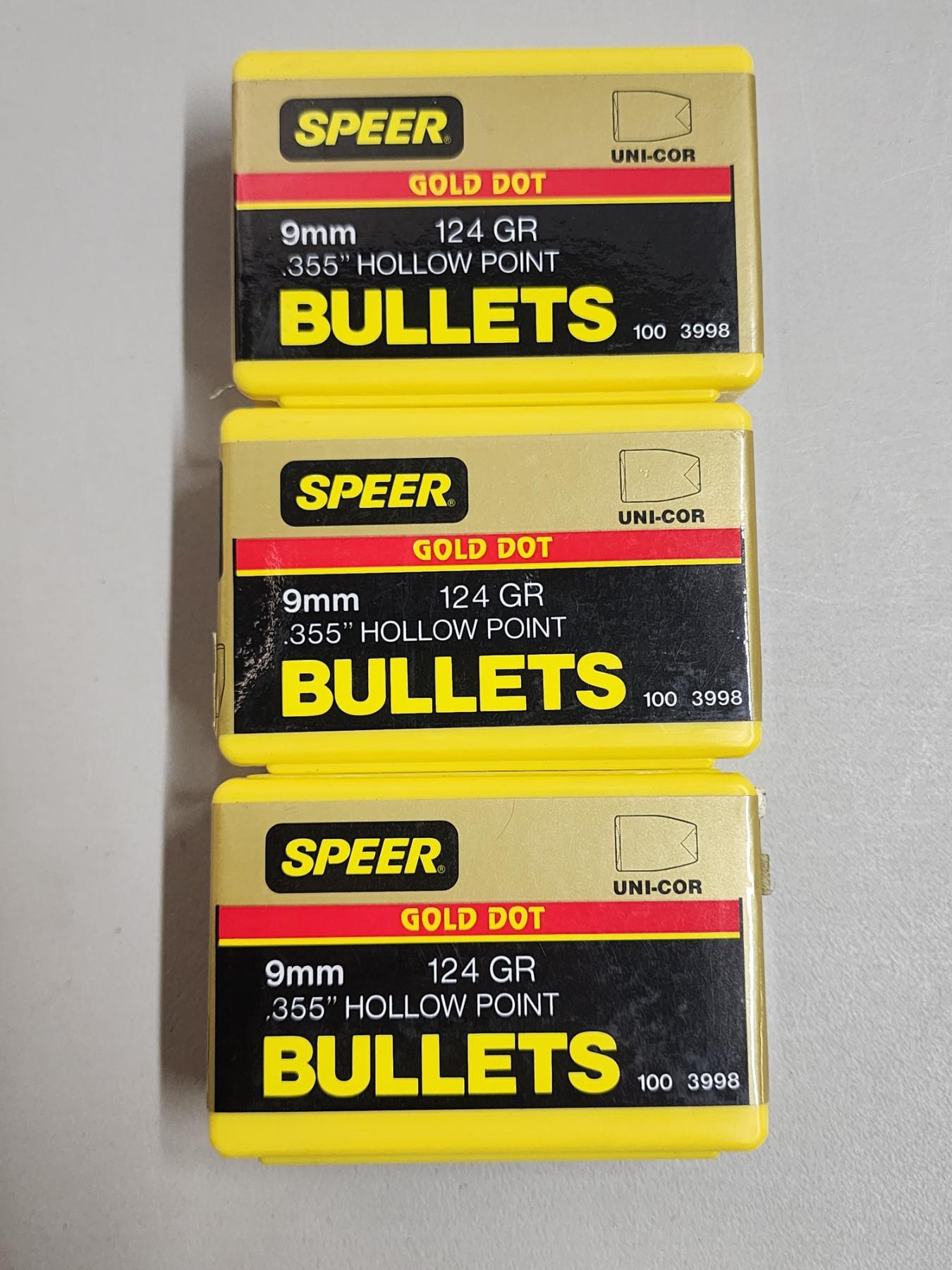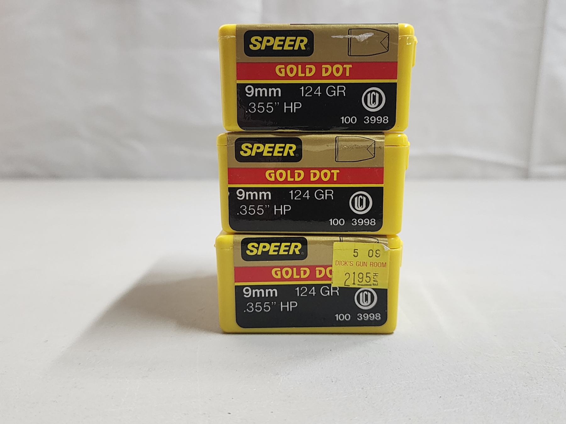 3 Full Boxes of Speer Gold Dot 9mm 124 GR .355 HP Bullets - 300 Total