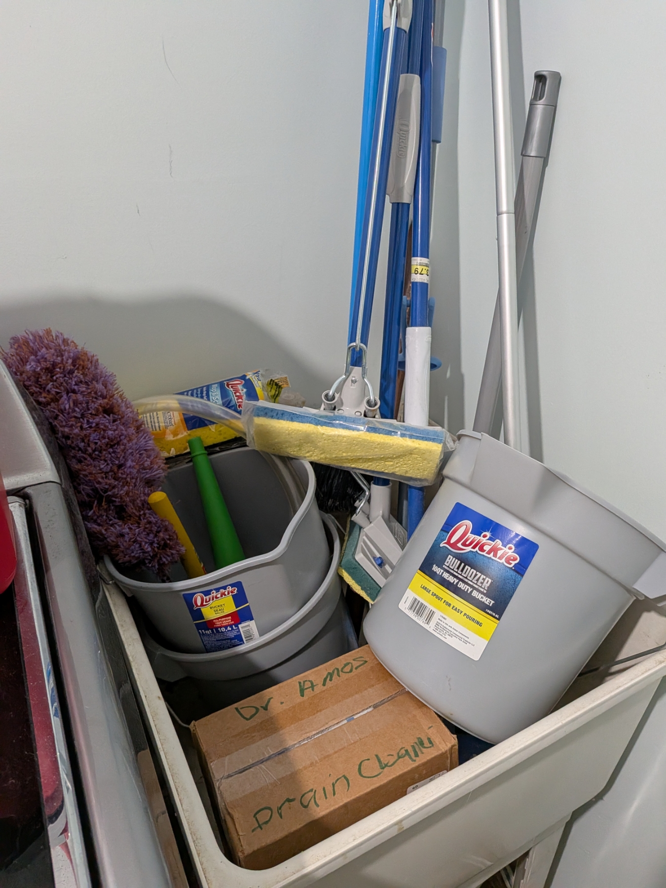 3 New Quickee Buckets, New Large Mop Bucket, Swiffer & Pads, Duster, Case Of Dr.Amos Drain Cleaner, Mops, Brooms & More