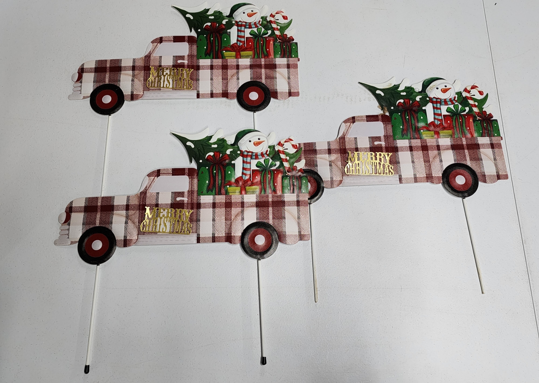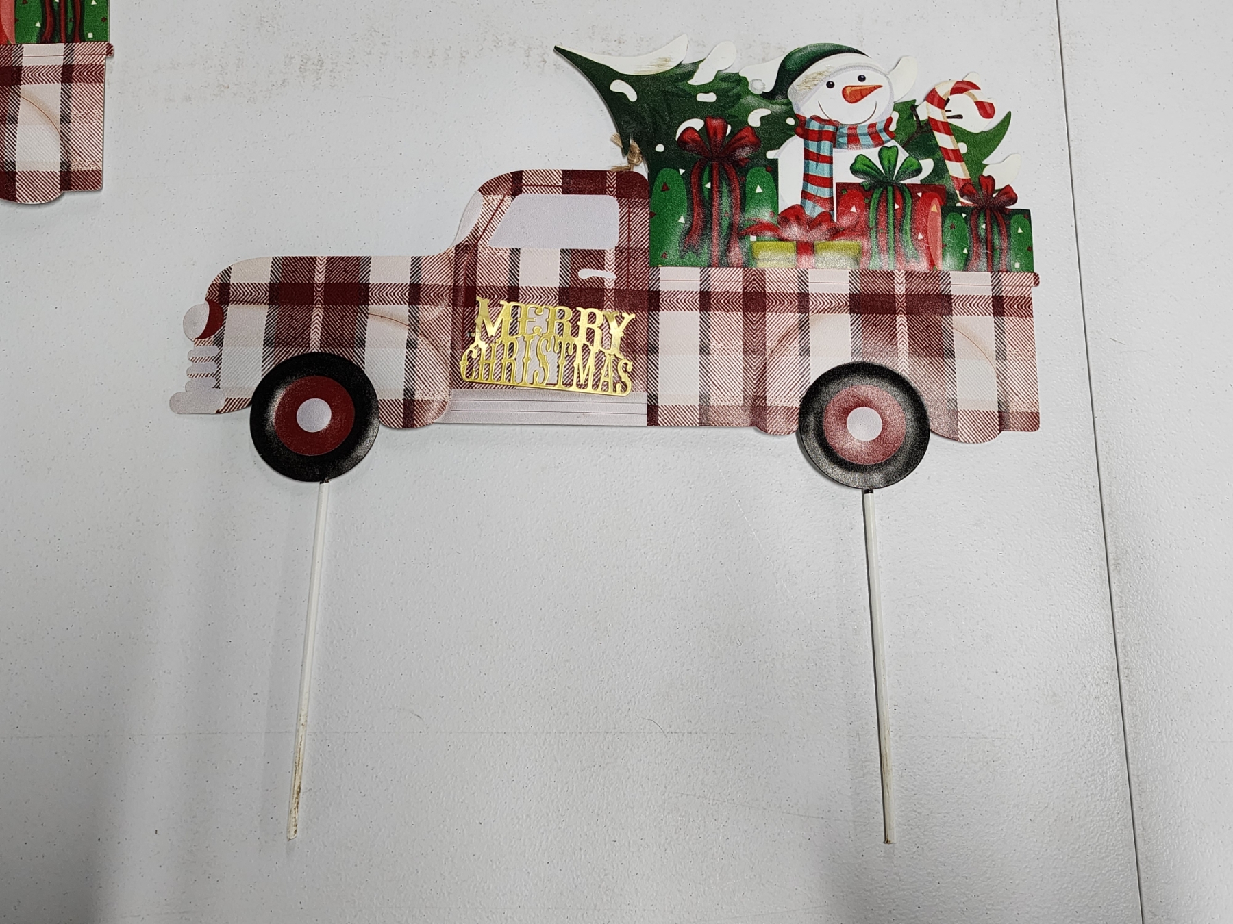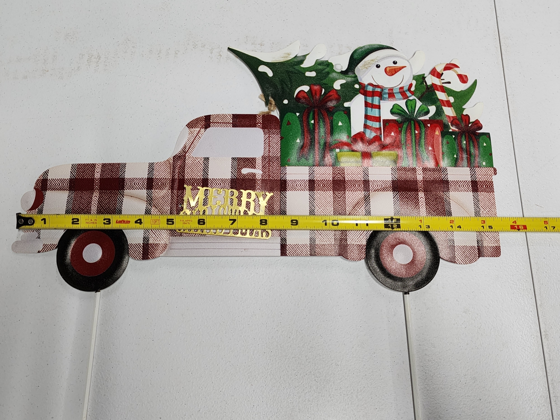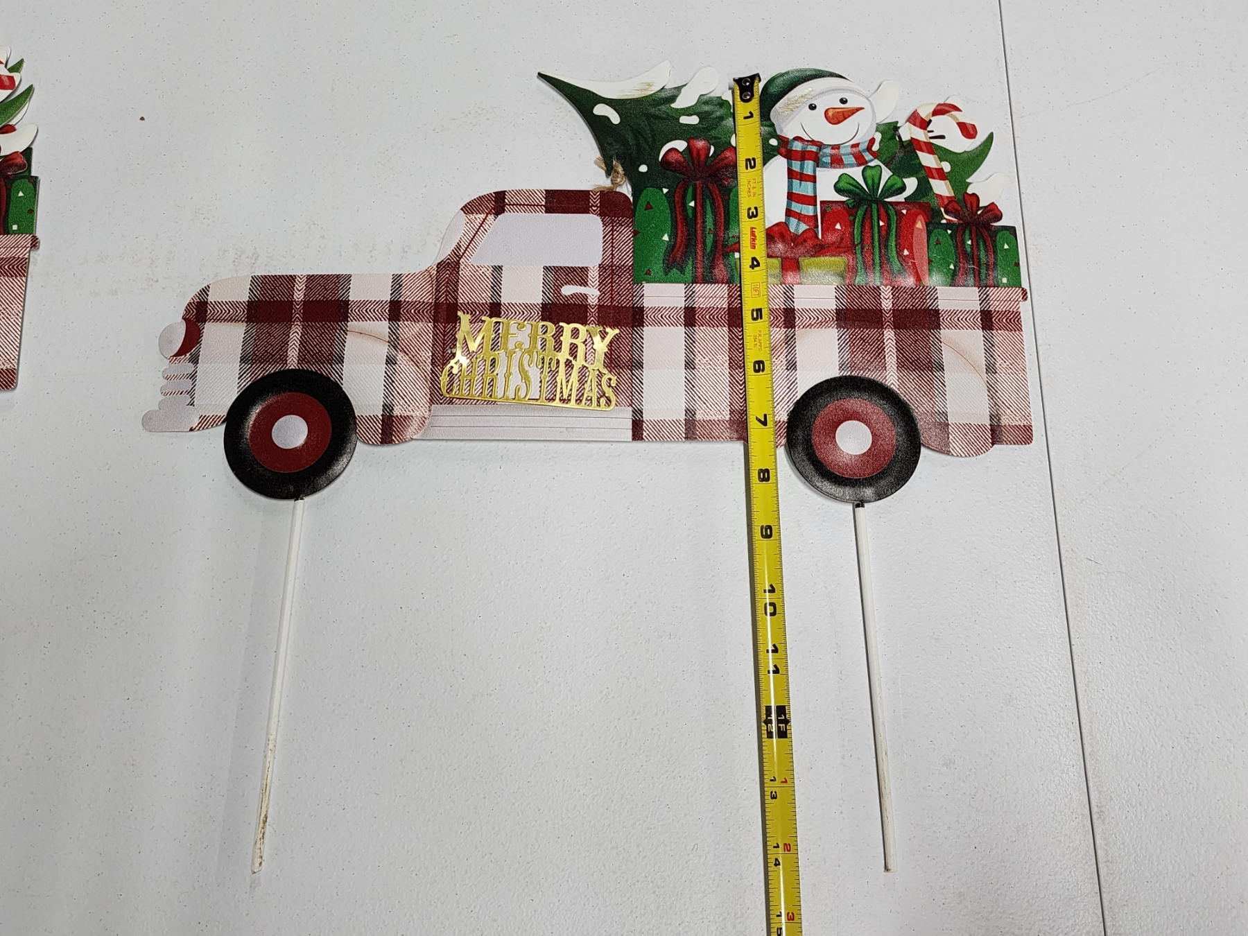3 Outdoor Metal Christmas/Holiday Red Plaid Truck and Tree Stakes - Approx. 16in Tall