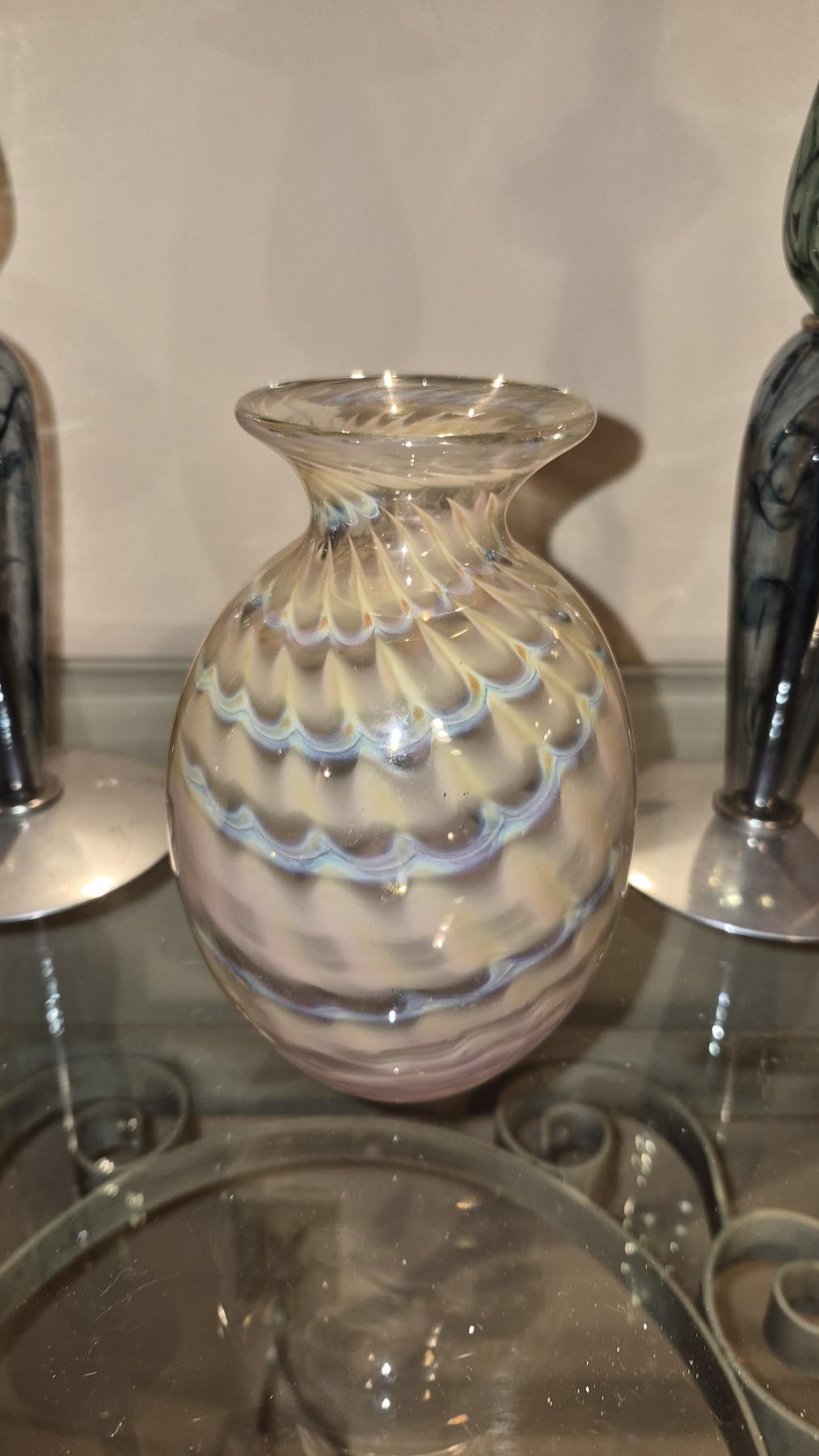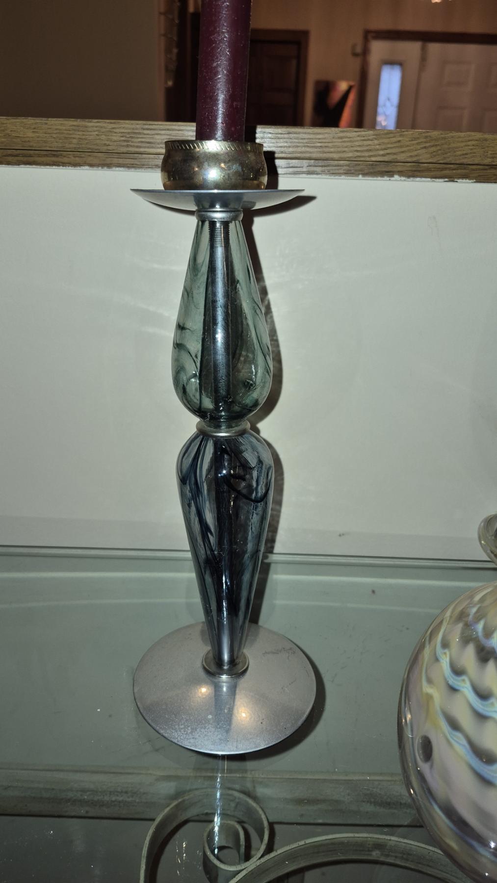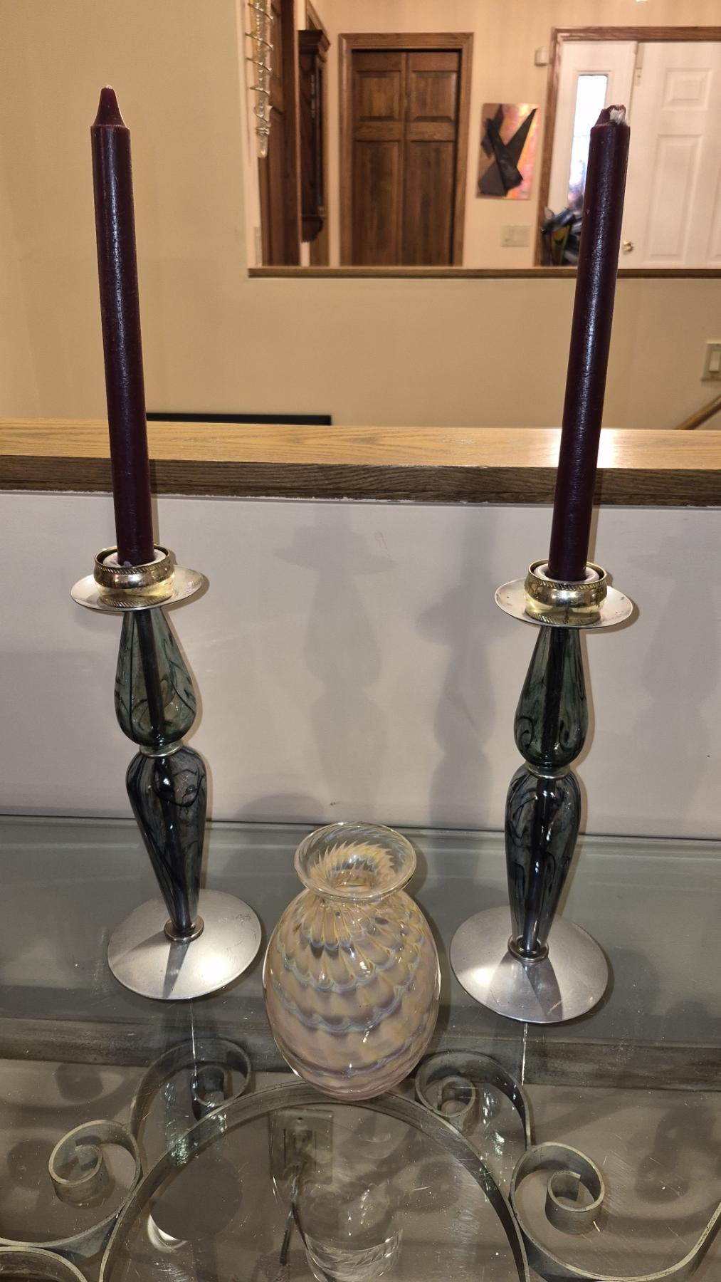 3 Pcs - Pair Of Art Glass & SS Candlesticks & Art Glass Vase - See Pics