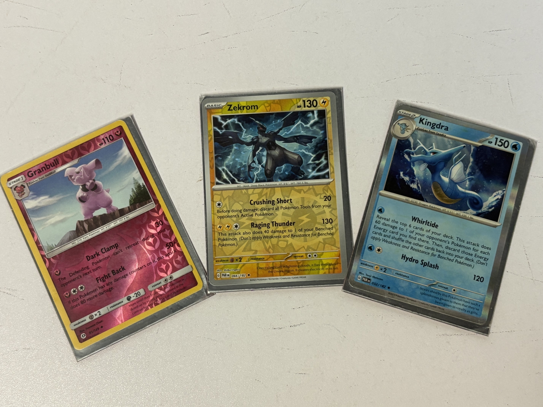 3 Pokémon Trading Cards - Kingdra 032/182 Rare Holo - Zekrom 066/182 Rare Holo - Granbull 91/149 Rare