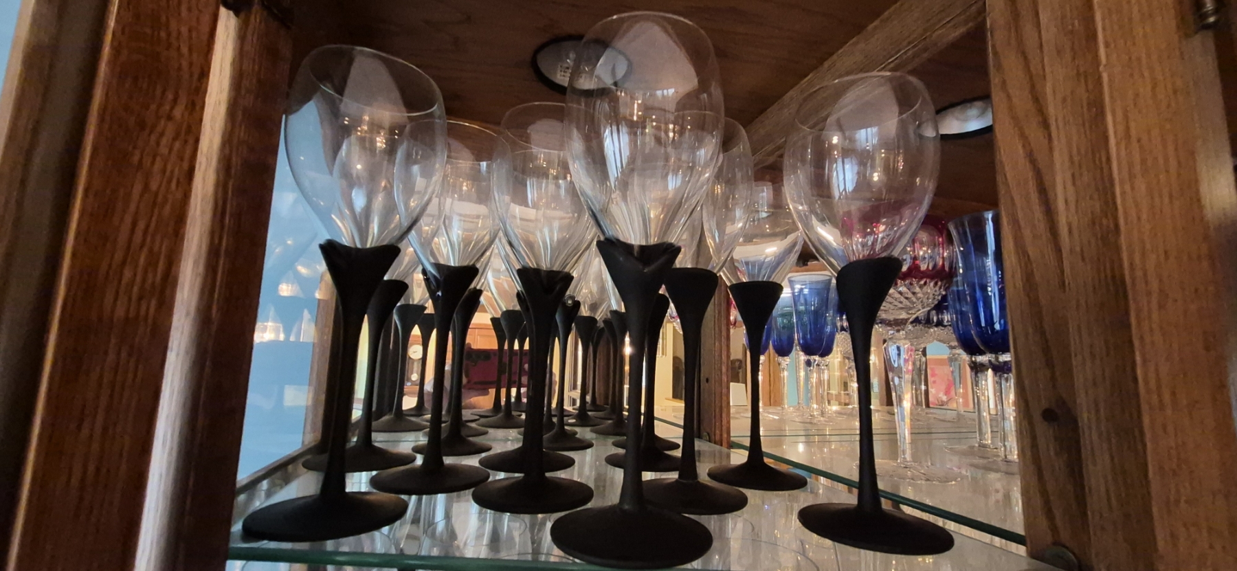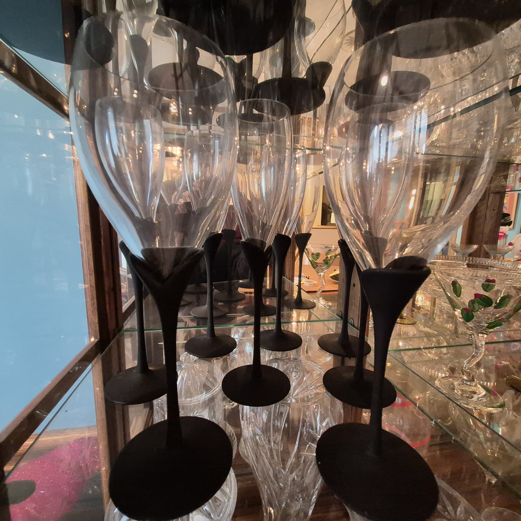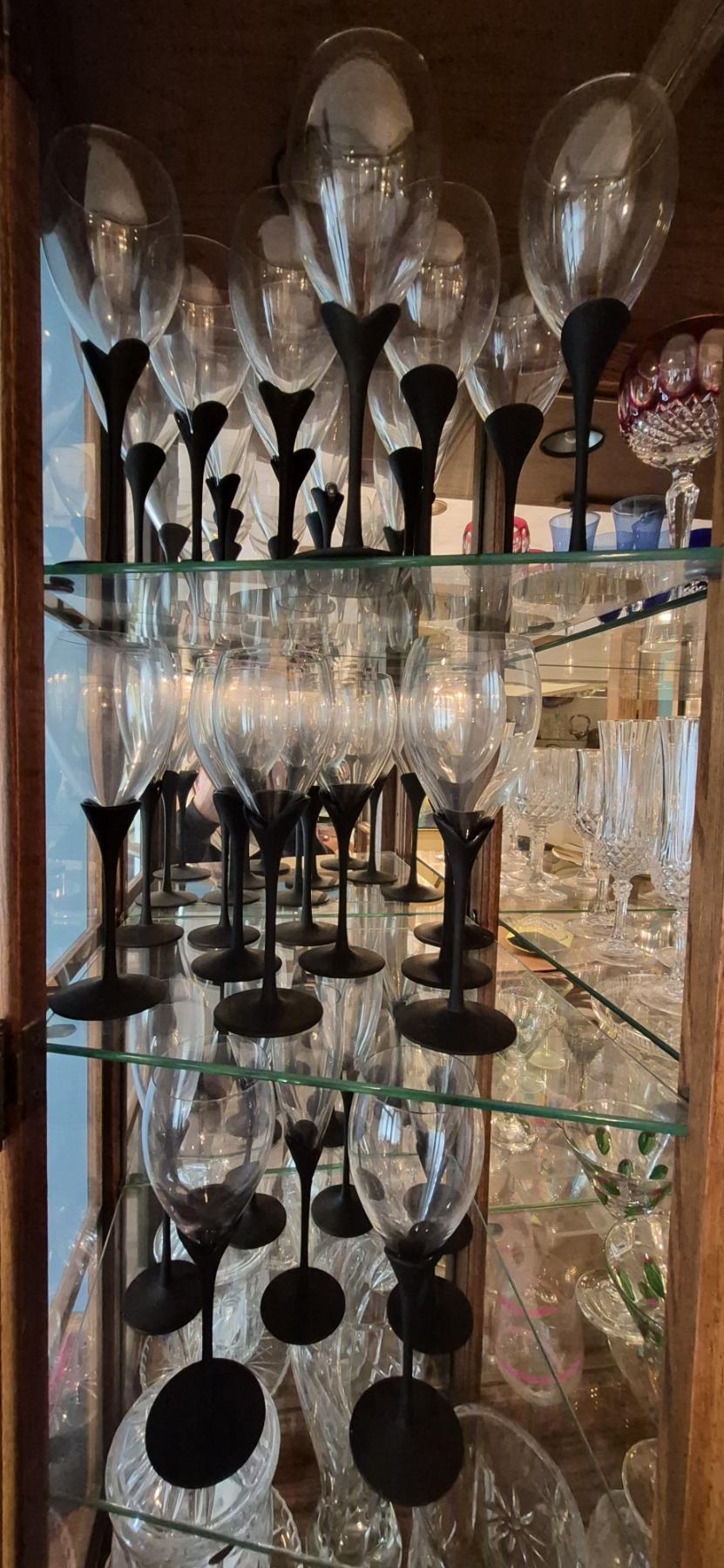 3 Shelves In Curio Cabinet With Elegant Black Stemmed Goblets - Assorted Sizes