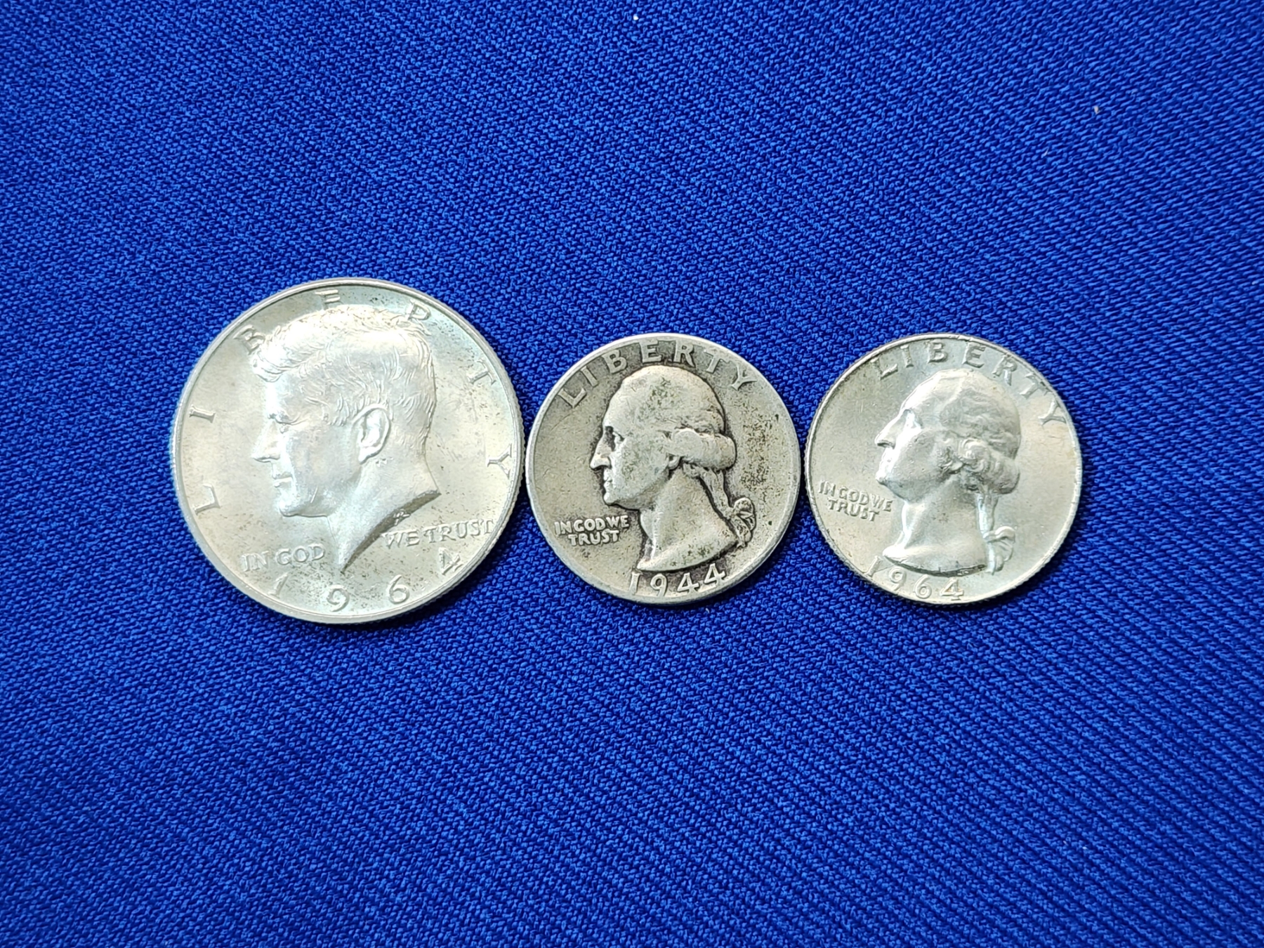 (3) U.S. Silver Coins: 1964 Kennedy Half Dollar, 1944 & 1964 Washington Quarters