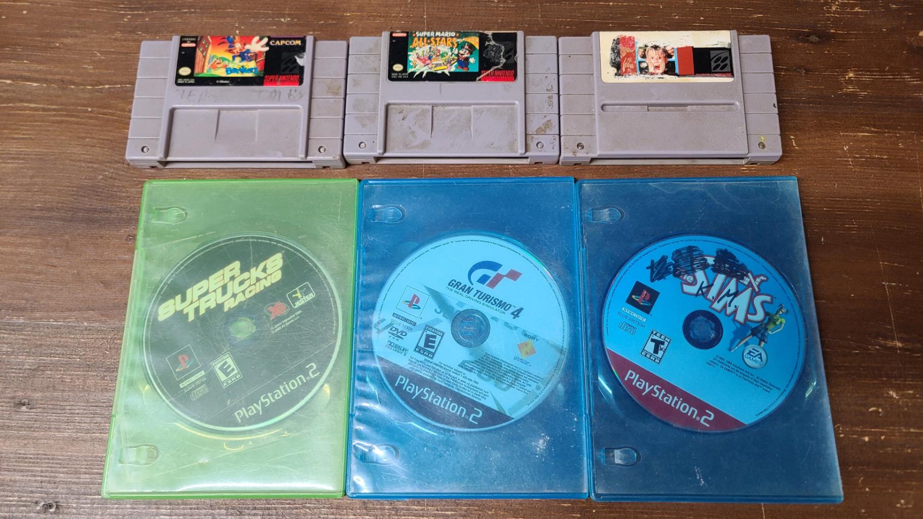 (3) 90's Super Nintendo Cartridges Super Mario All-Stars, Bonkers, Home Alone & (3) PlayStation2 Games The Sims, Gran Turismo 4 & Super Trucks Racing. All Have Not Been Tested.