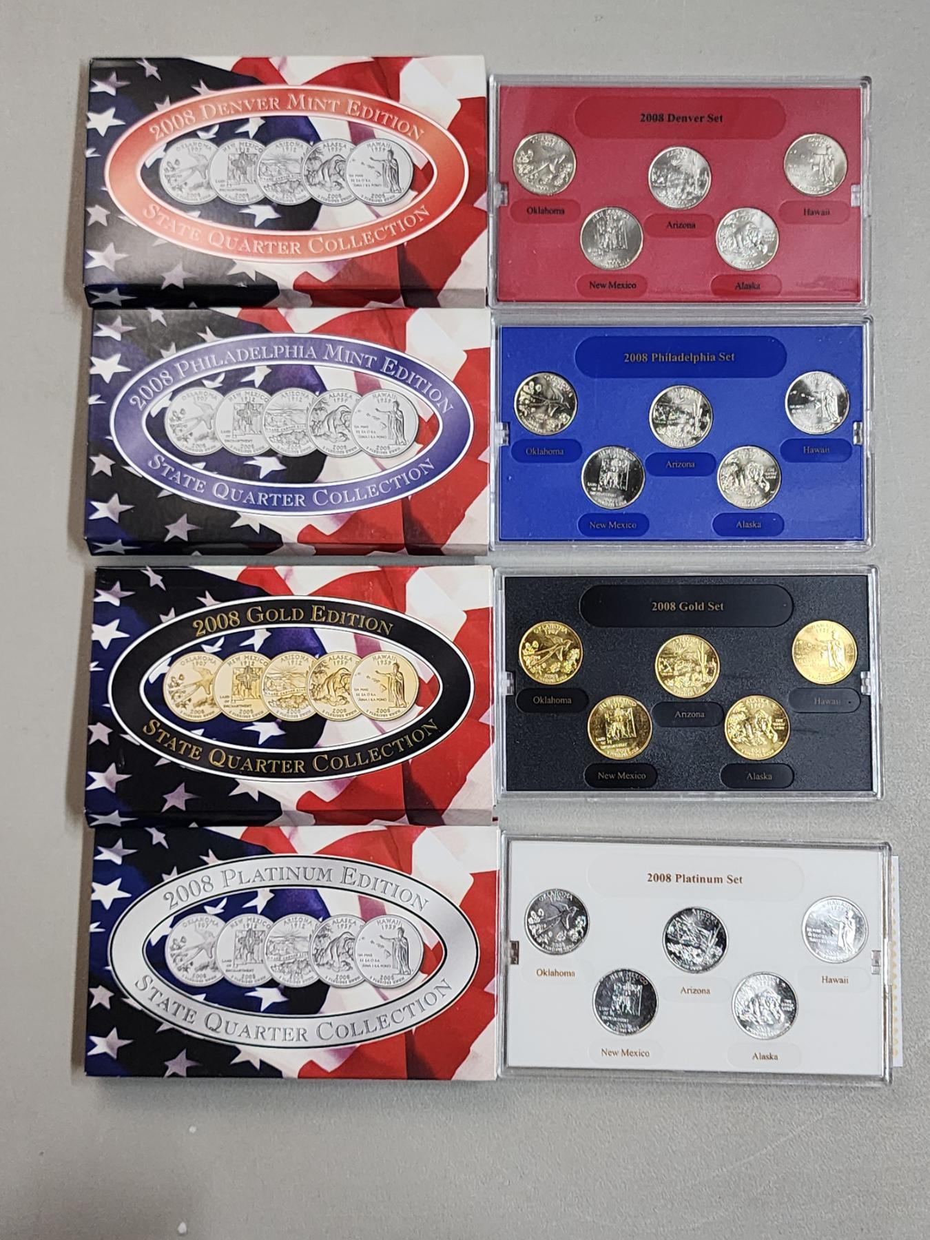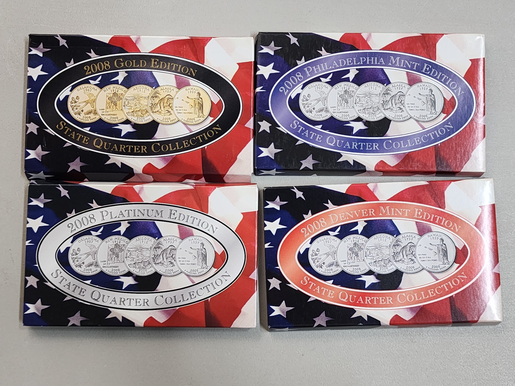 (4) 2008 State Quarter Collection Sets: Gold Edition/Platinum Edition/Philadelphia Mint/Denver Mint