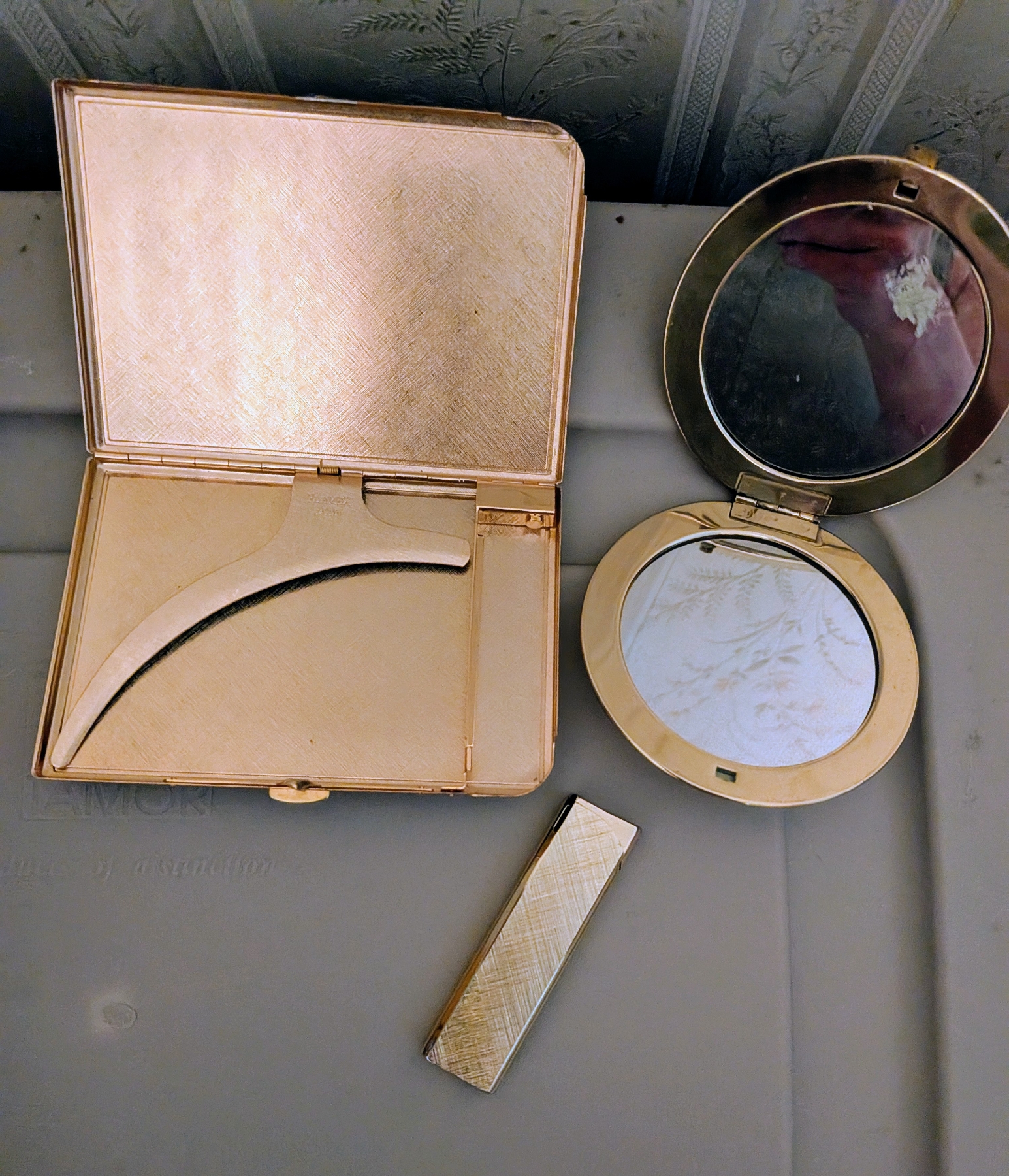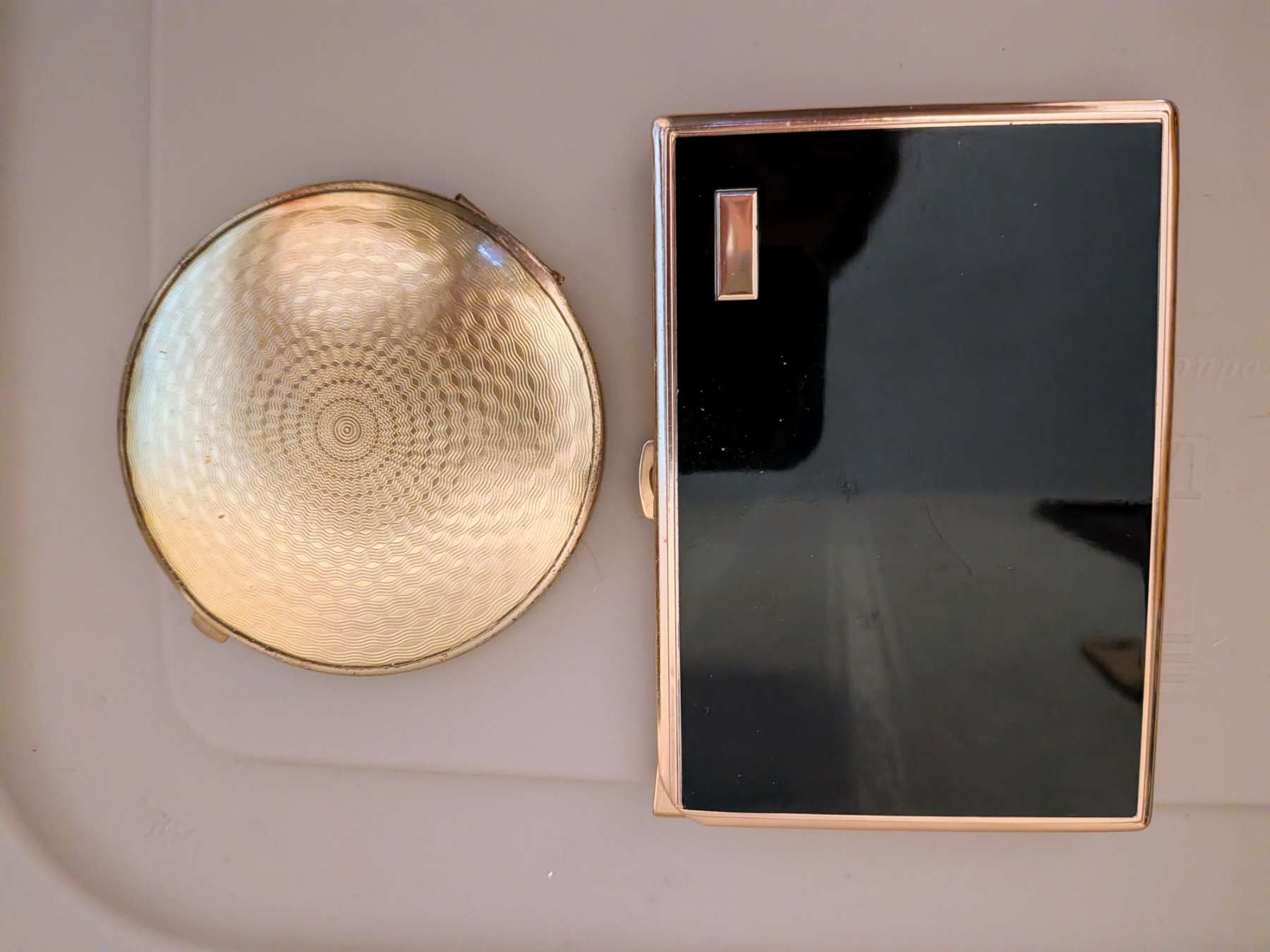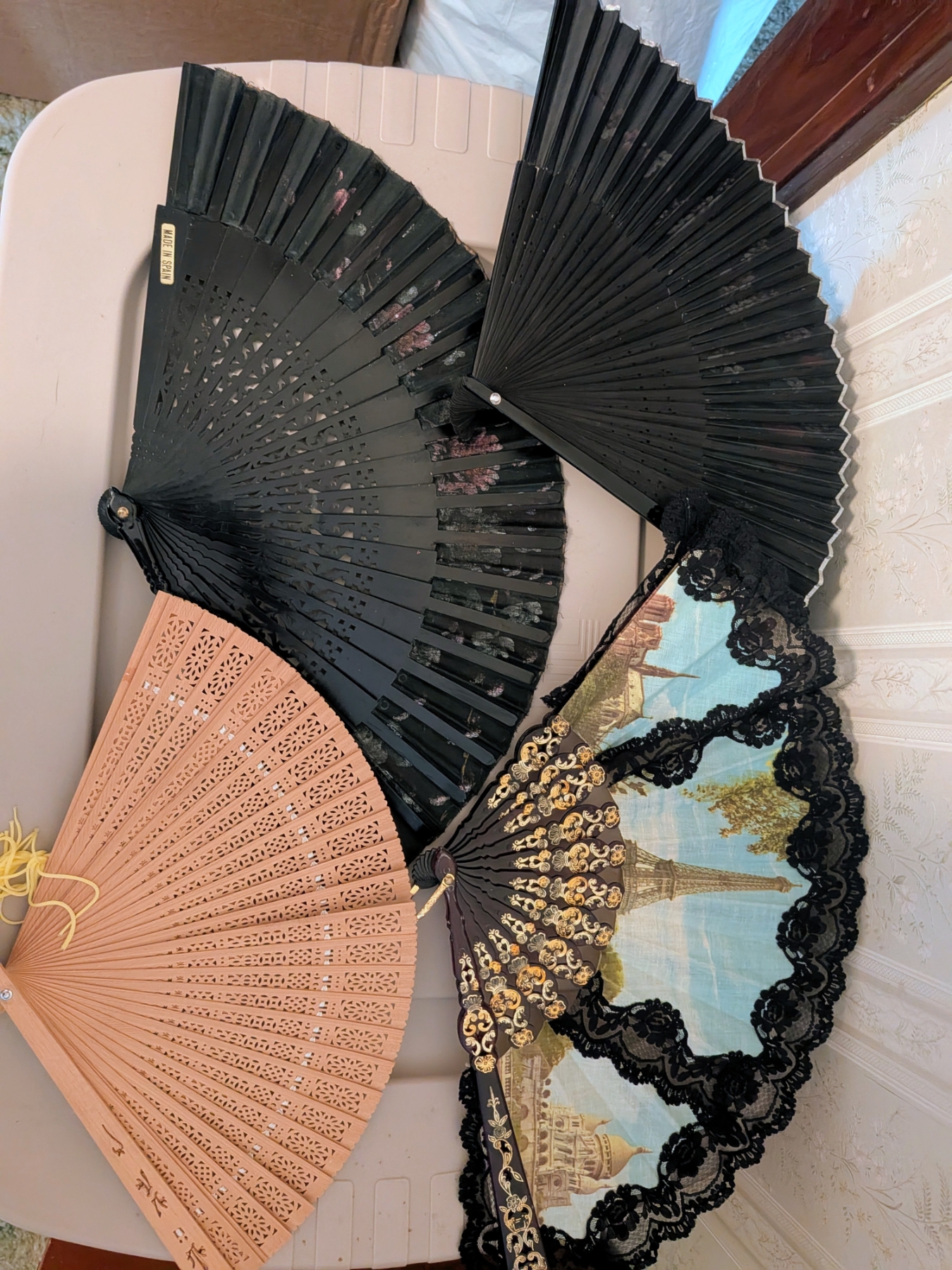 4 Folding Fans, Vintage Gold Tone And Black Enamel Compact Mirror, & Cigarette Case With Lighter.