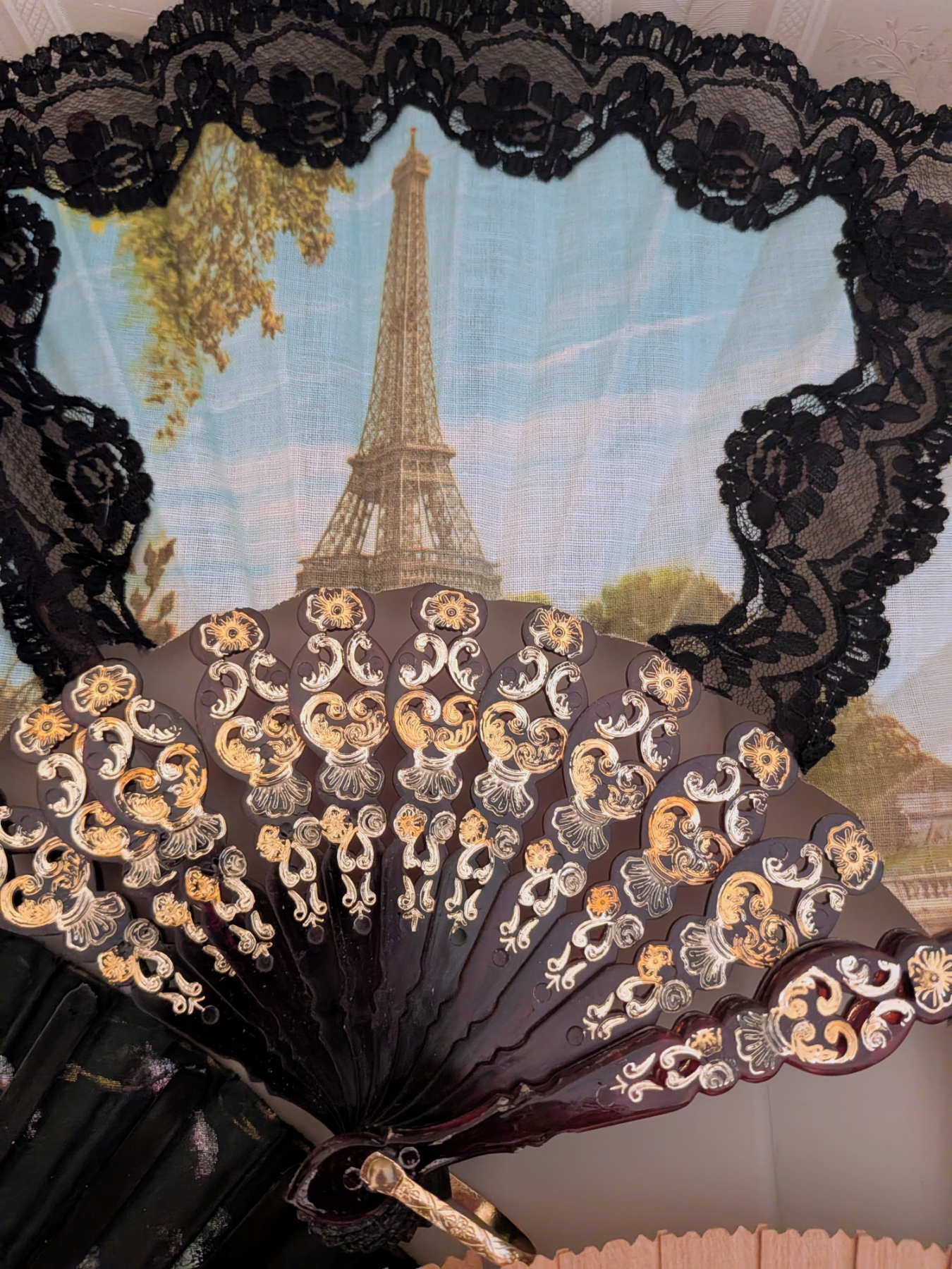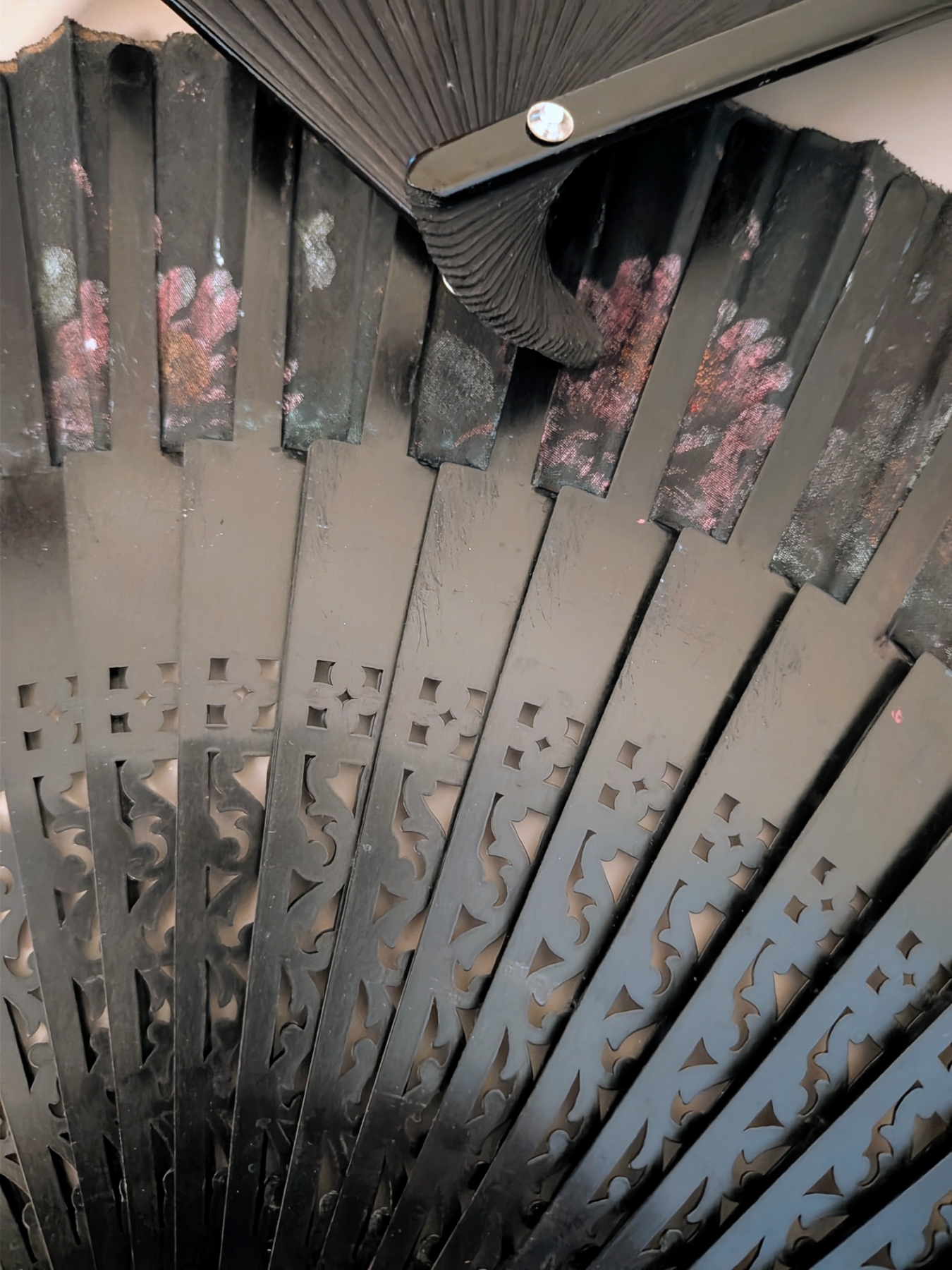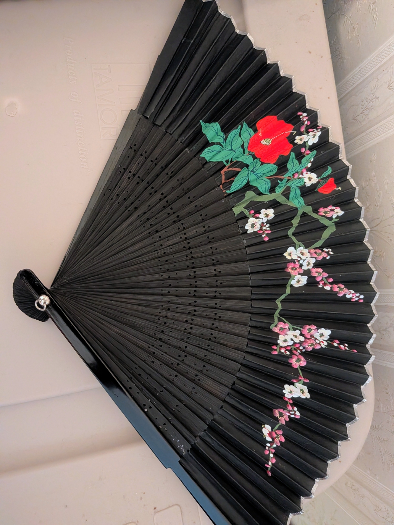 4 Folding Fans, Vintage Gold Tone And Black Enamel Compact Mirror, & Cigarette Case With Lighter.