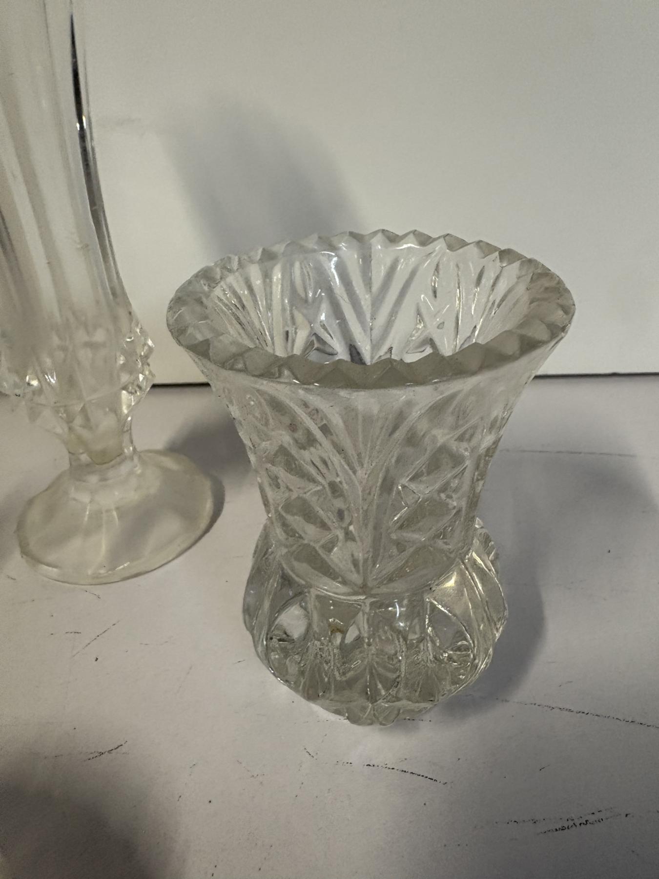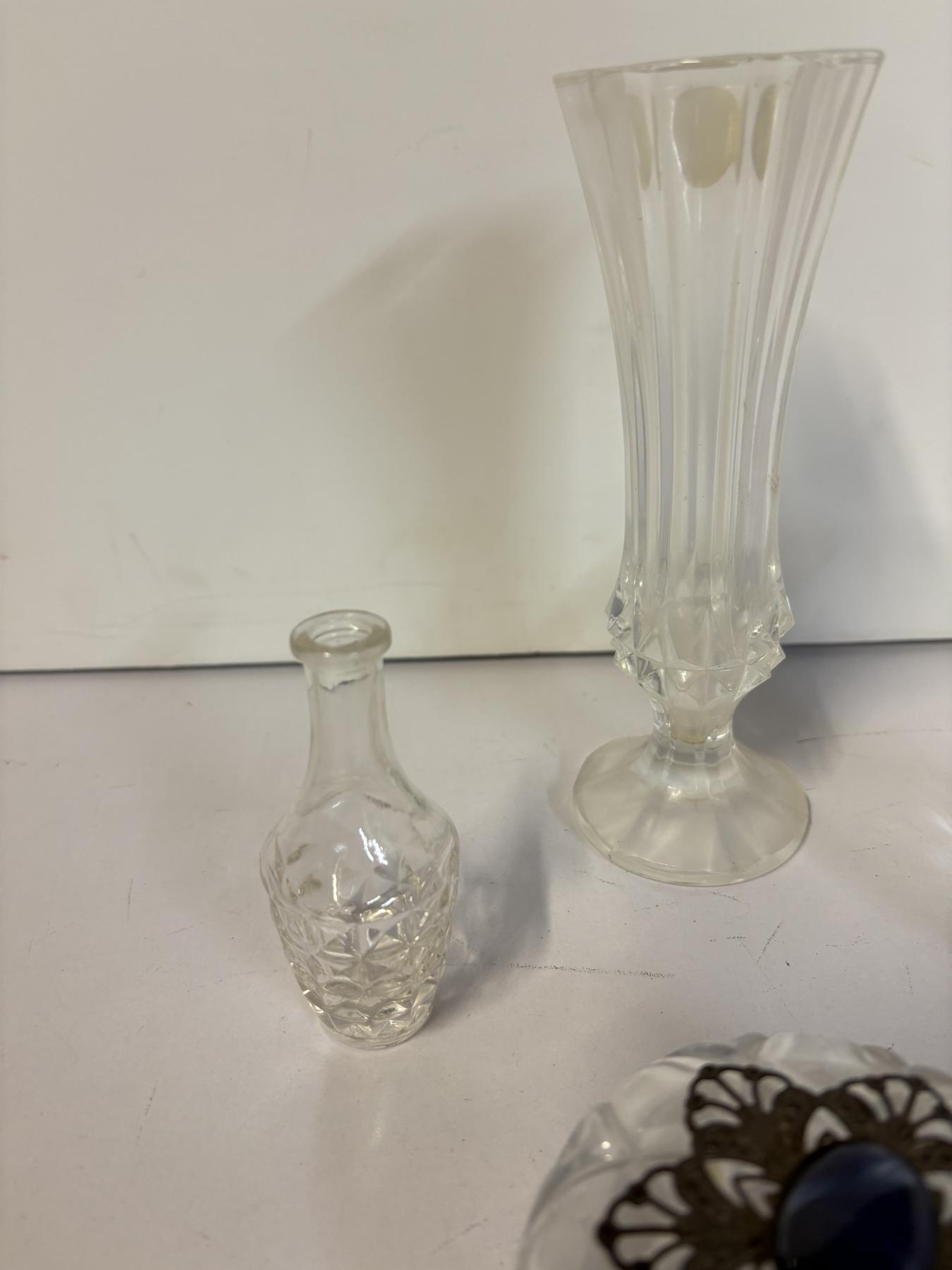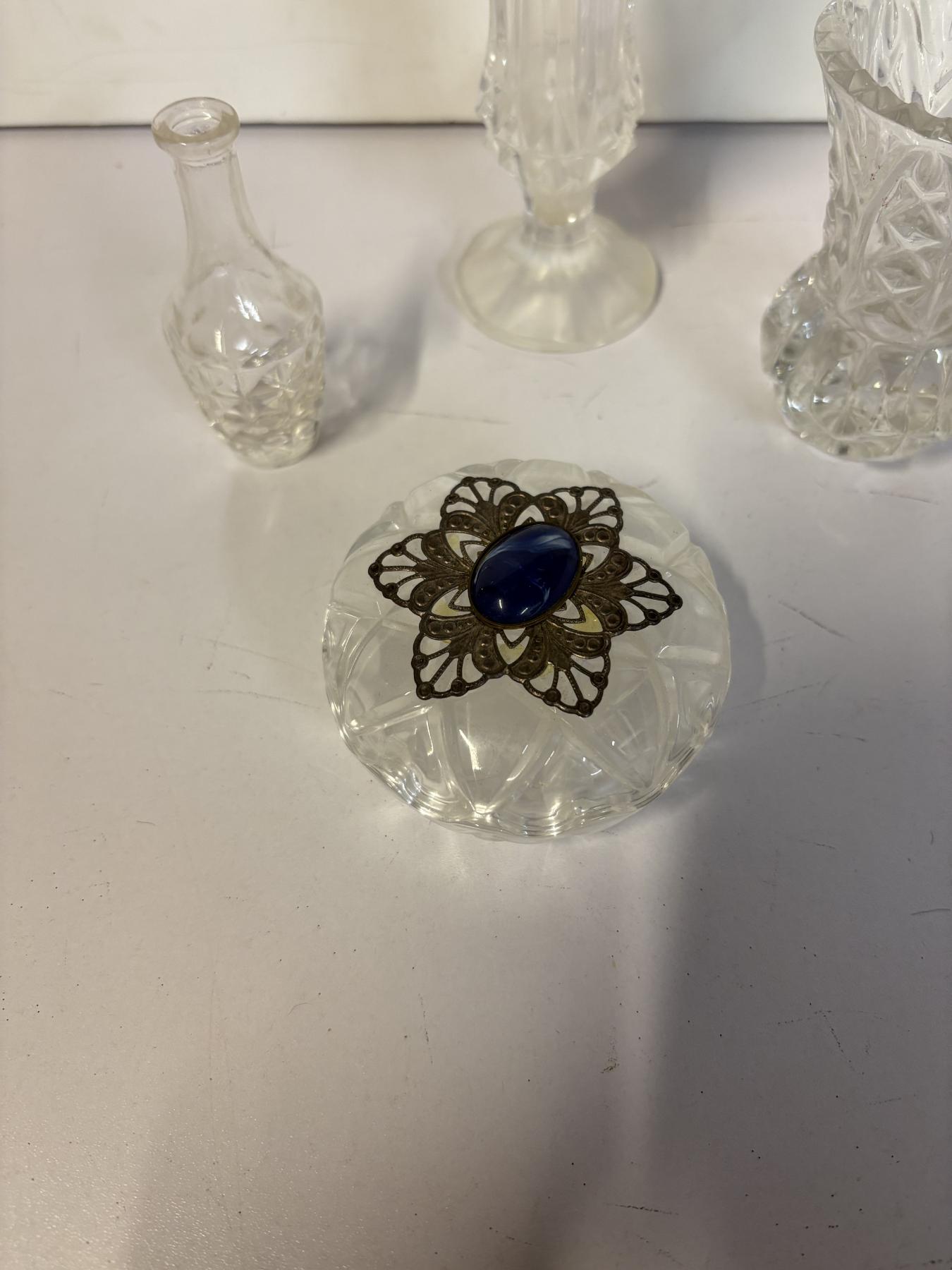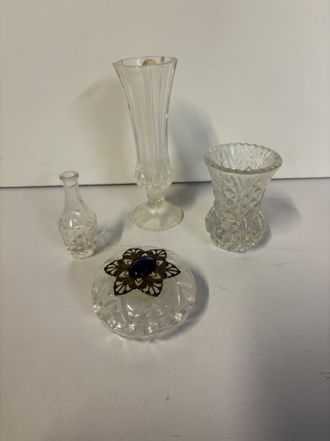 4 Glass Items - 1 Dish with Star and Blue Gem - 3 Vases