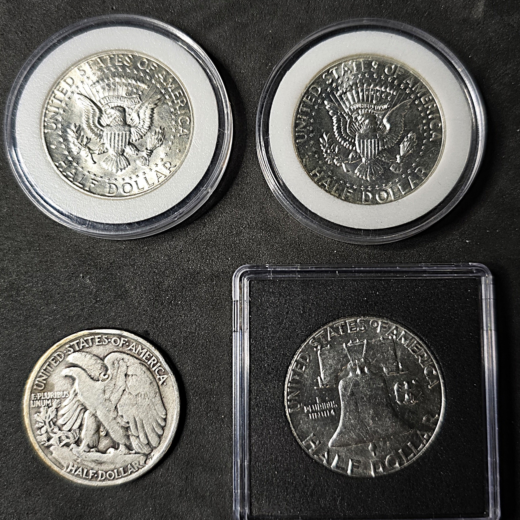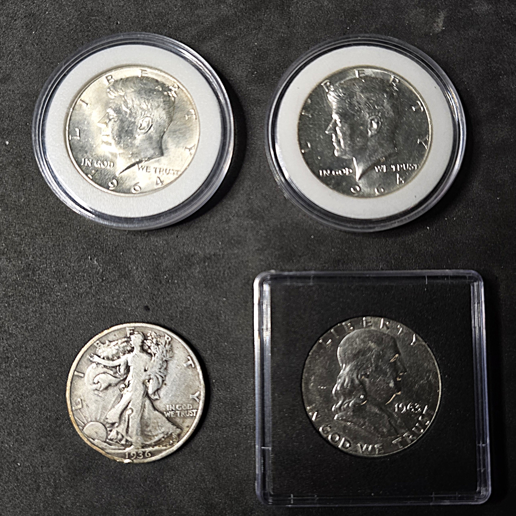(4) Silver Half Dollars - (2) 1964 Kennedy, (1) 1936 Walking Liberty & (1) Franklin - 90% Silver