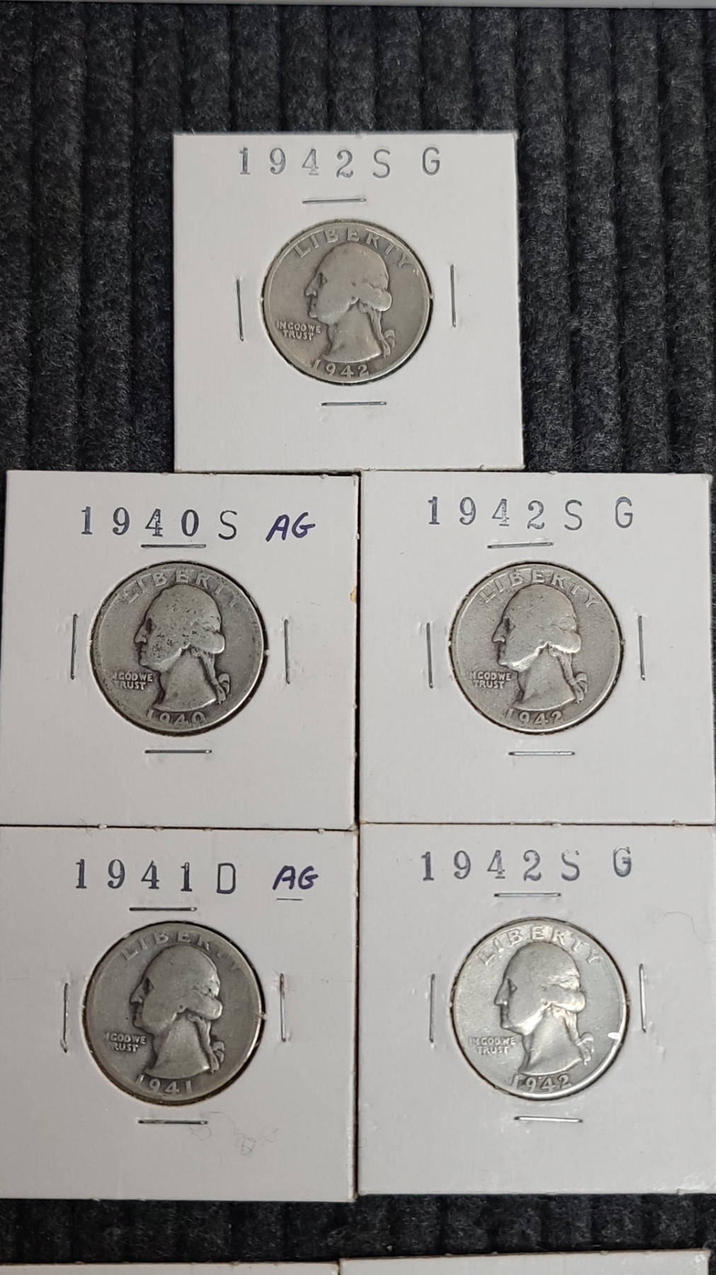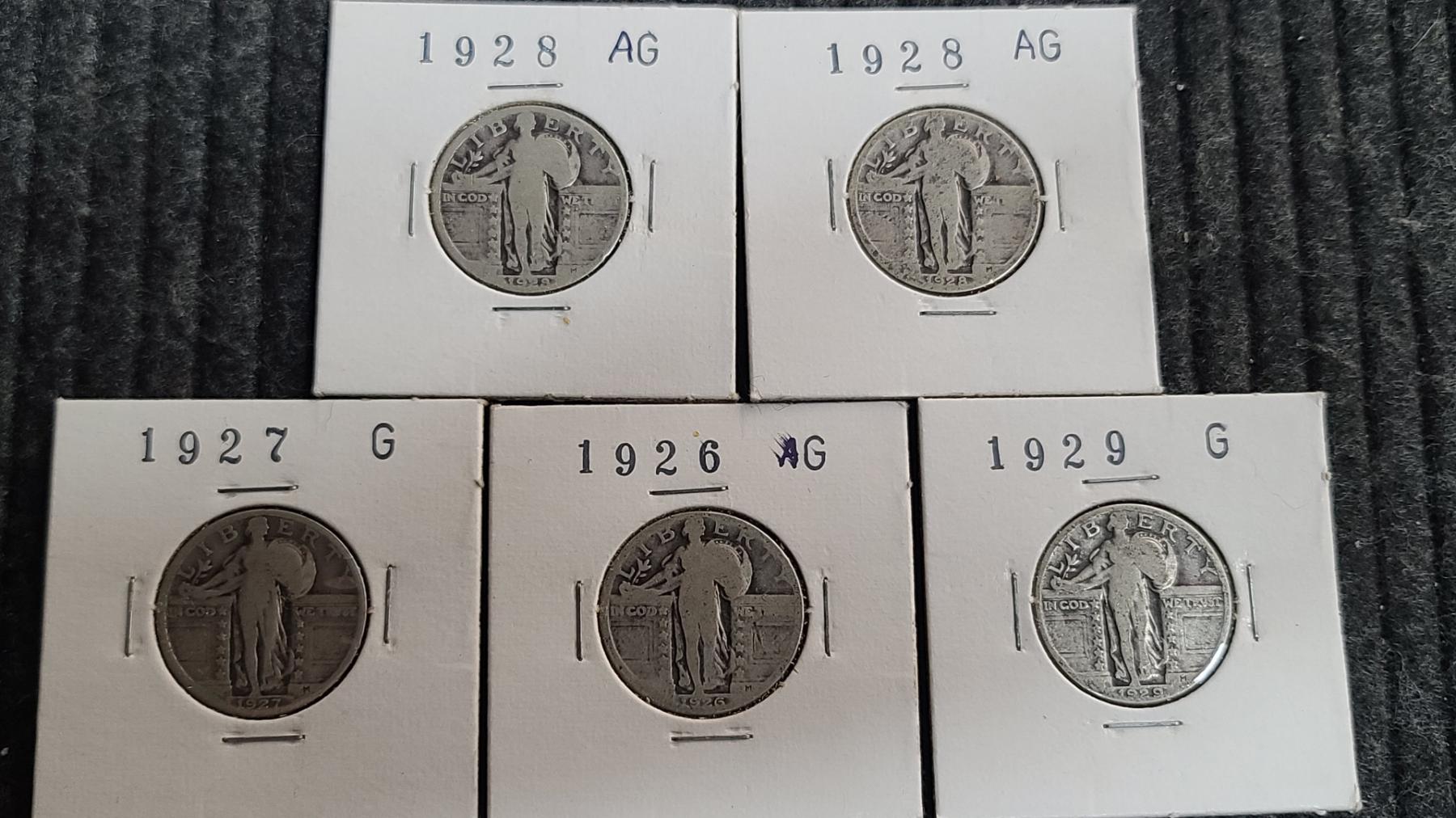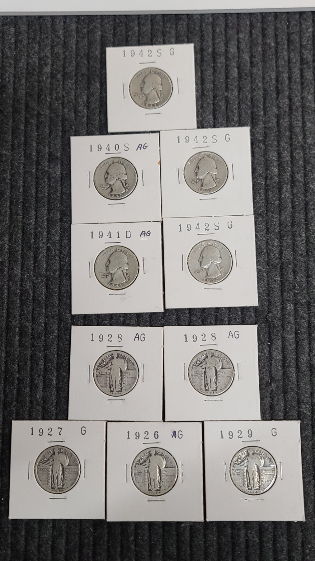 (5) 90% Silver Washington Quarters 1940-S, 1941-D, 1942-S, 1942-S & 1942-S & (5) 90% Silver Standing Liberty Quarters 1926, 1927, 1928, 1928 & 1929