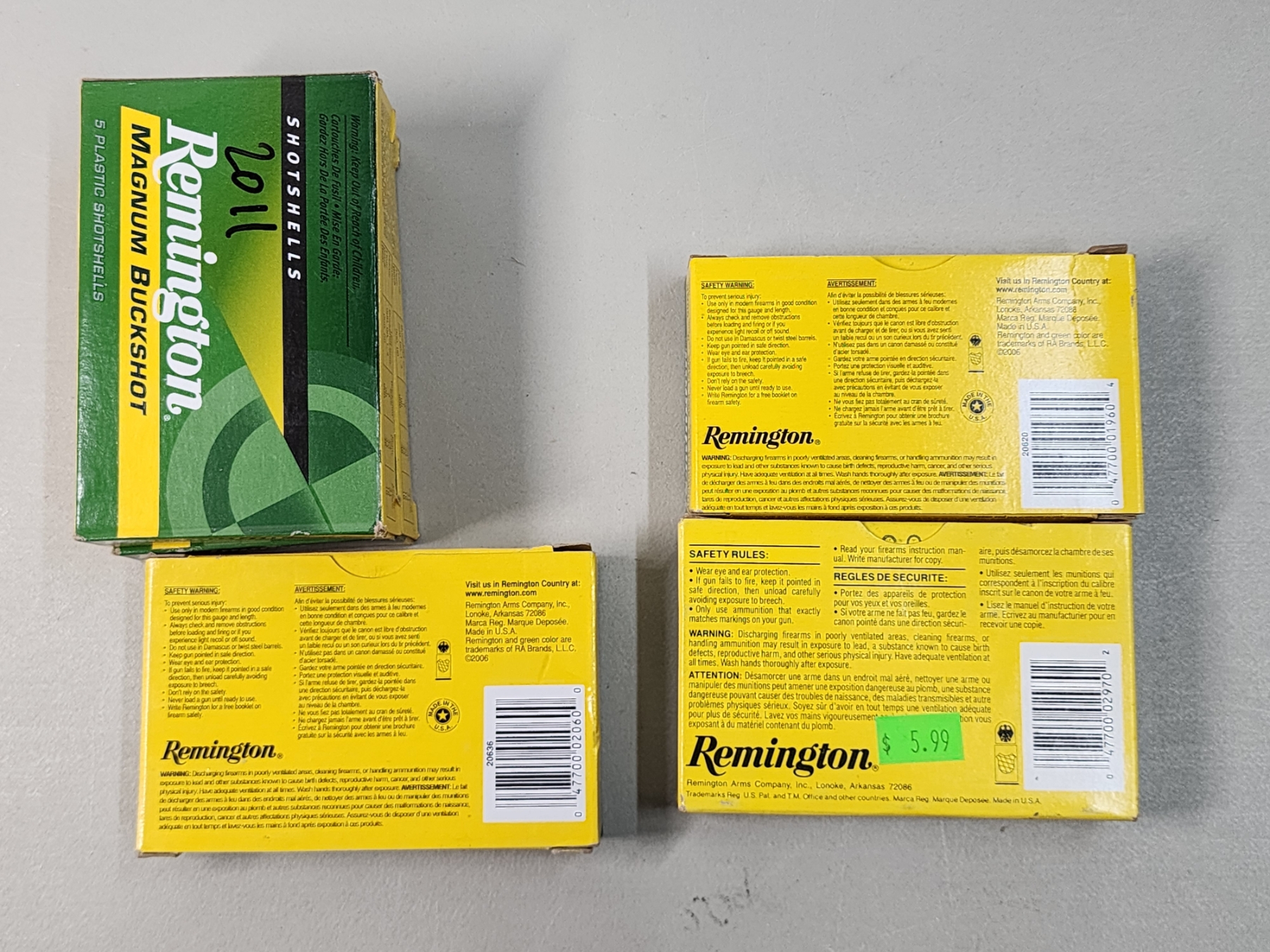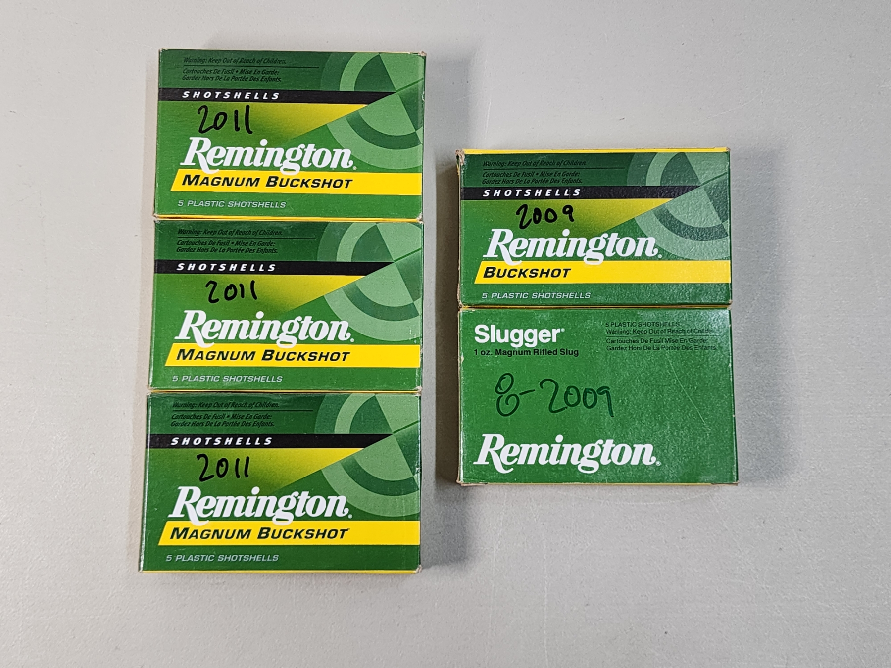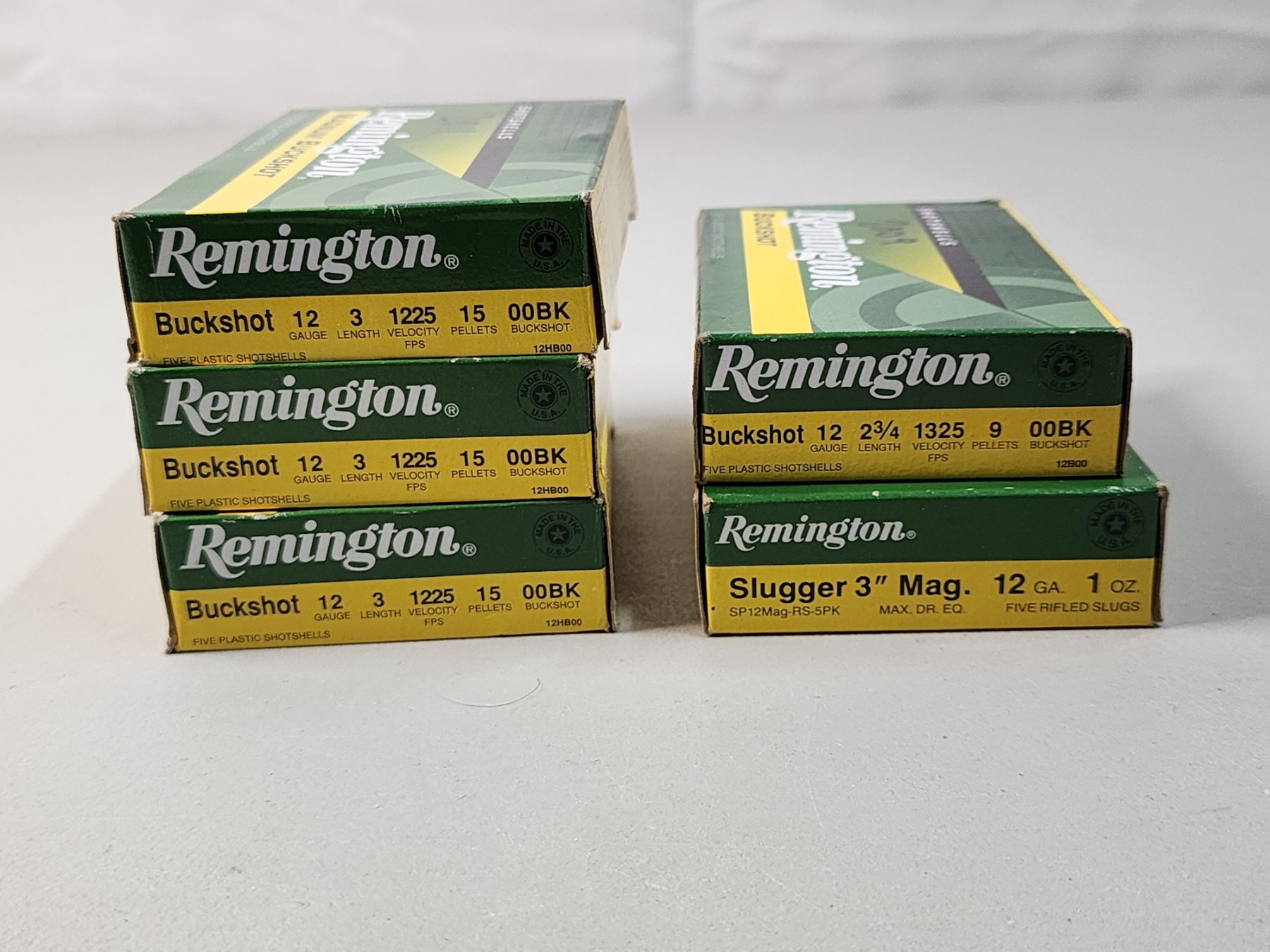 5 Full Boxes of Remington 12 Gauge Ammo - x3 3in Buckshot, x1 2/34in Buckshot, & x1 3in Slugs