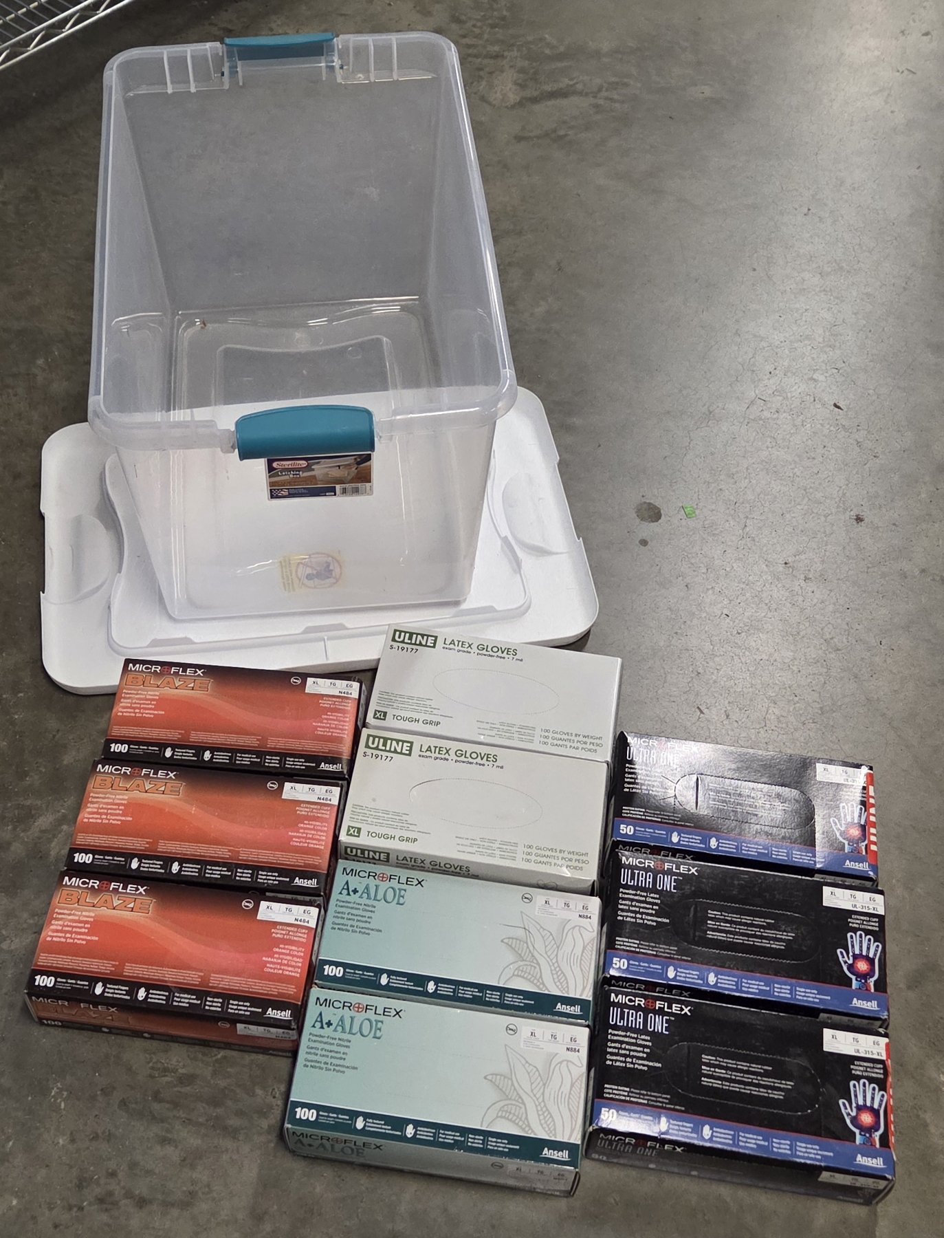 64 Quart Storage Container And 10 Boxes Of Extra Large Disposable Gloves