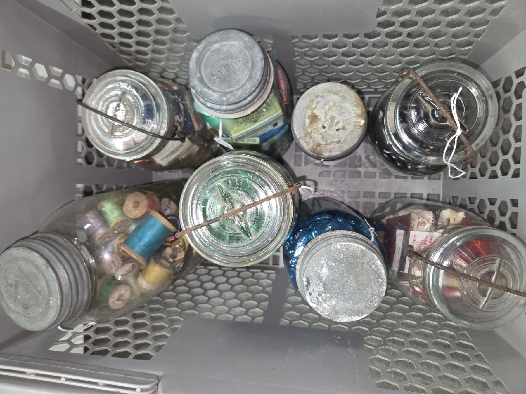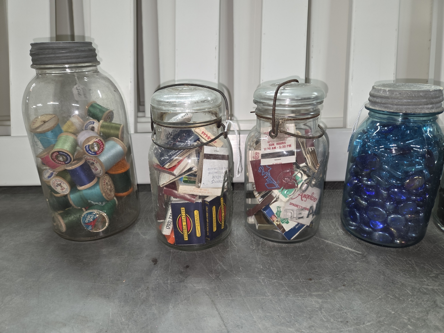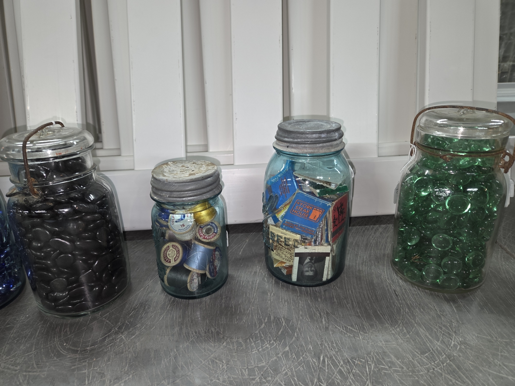 8 Atlas & Ball Vintage Jars With Lids Filled With Collectables