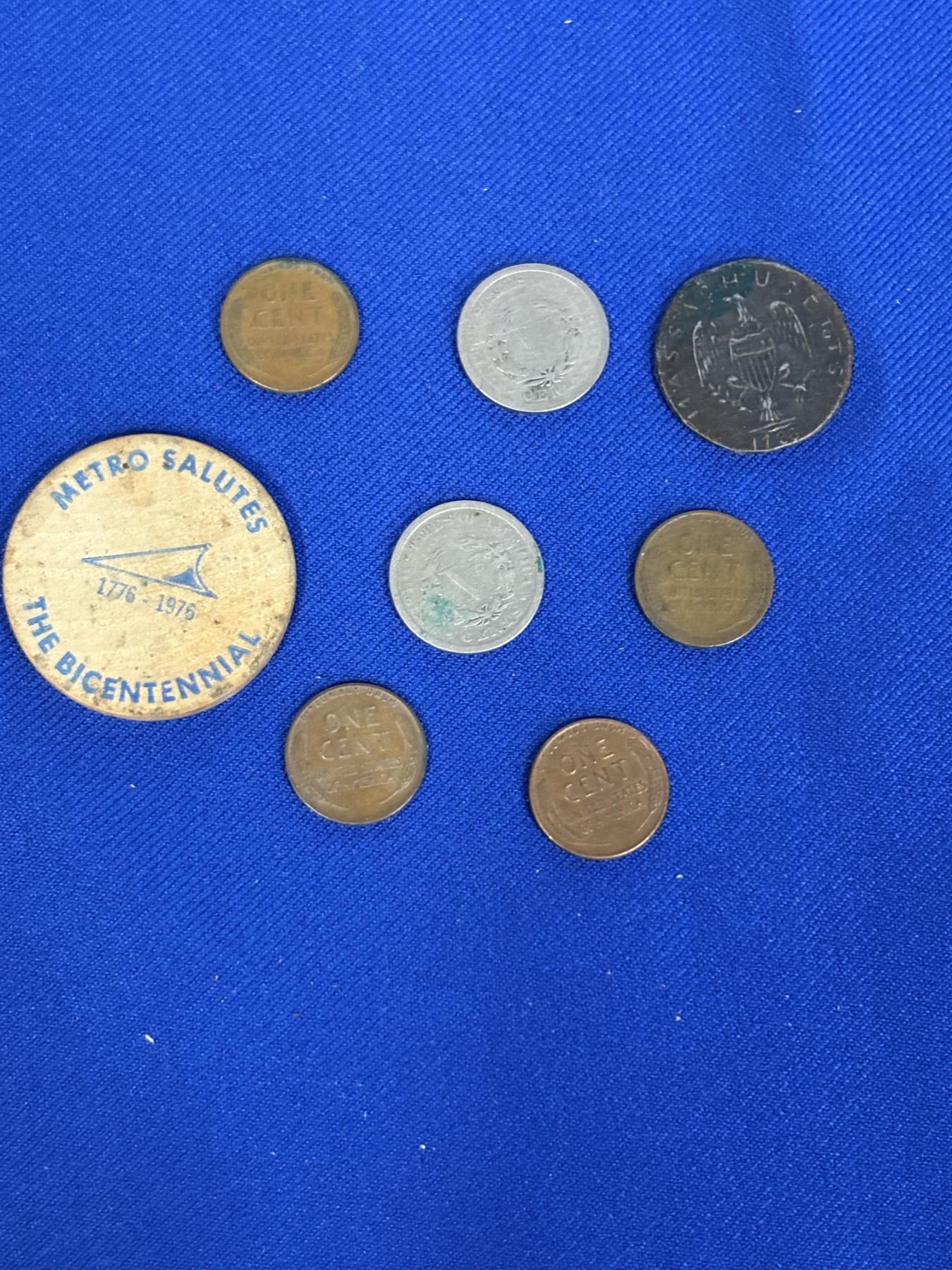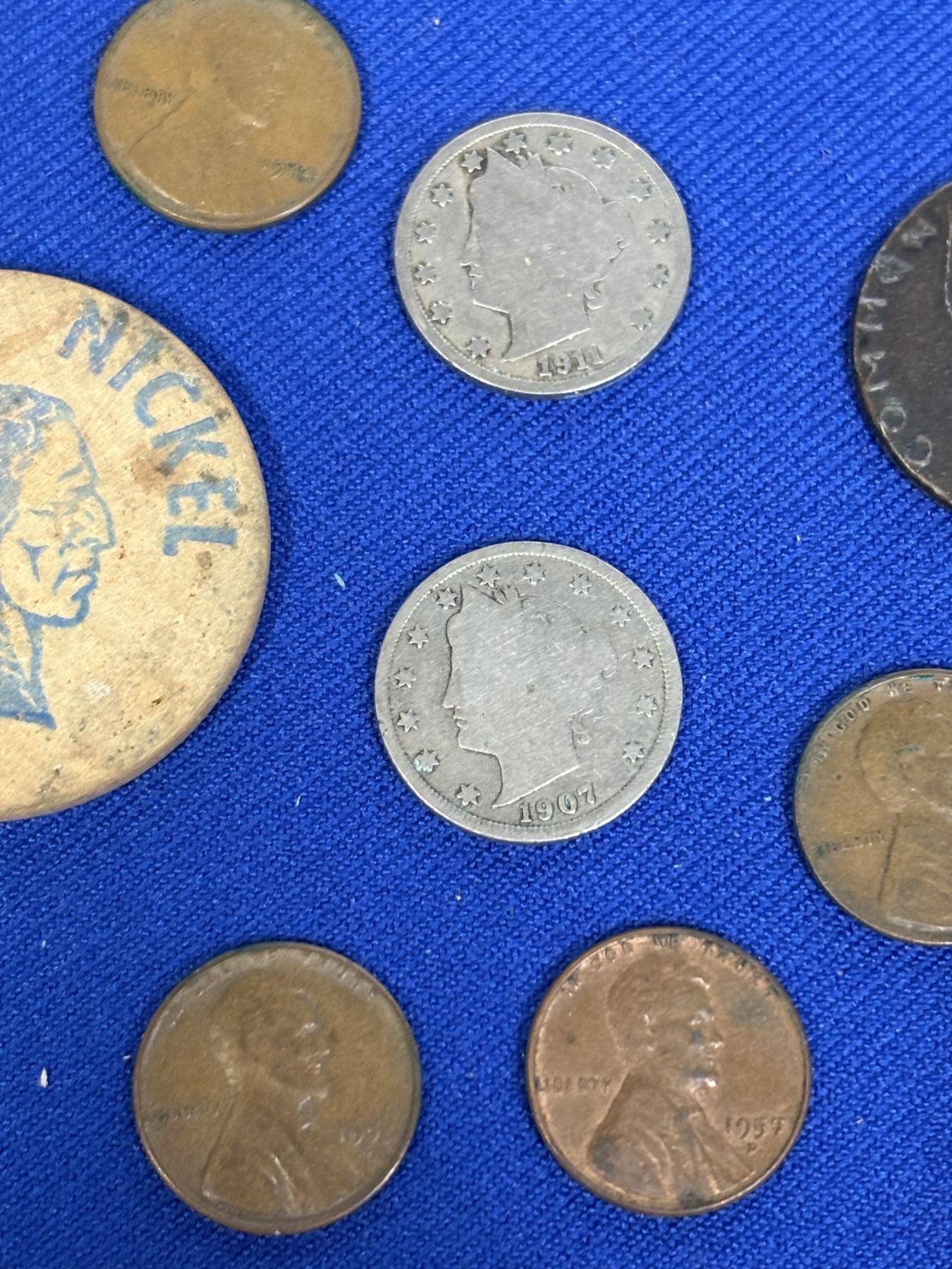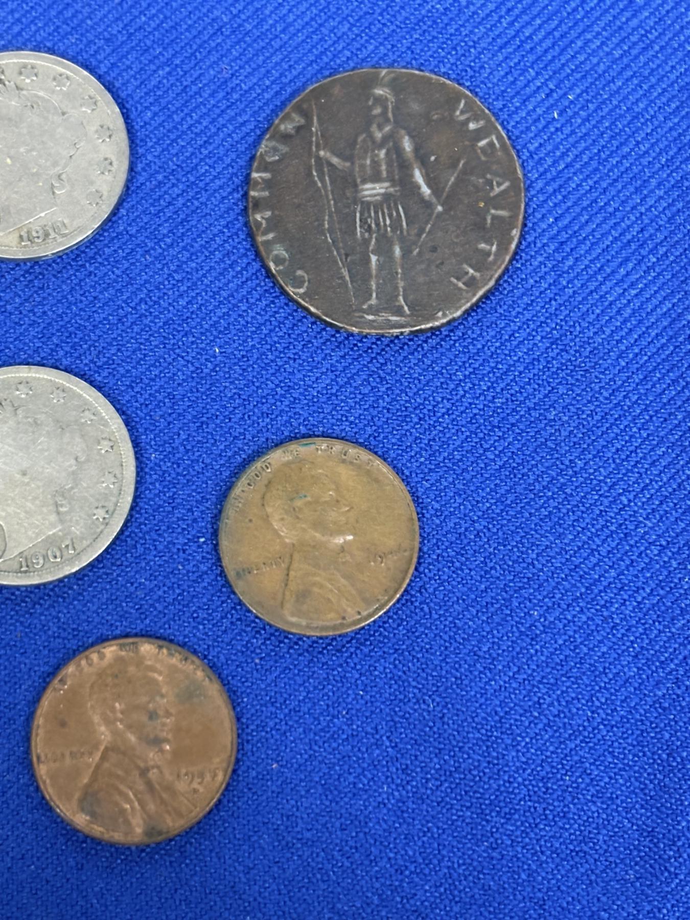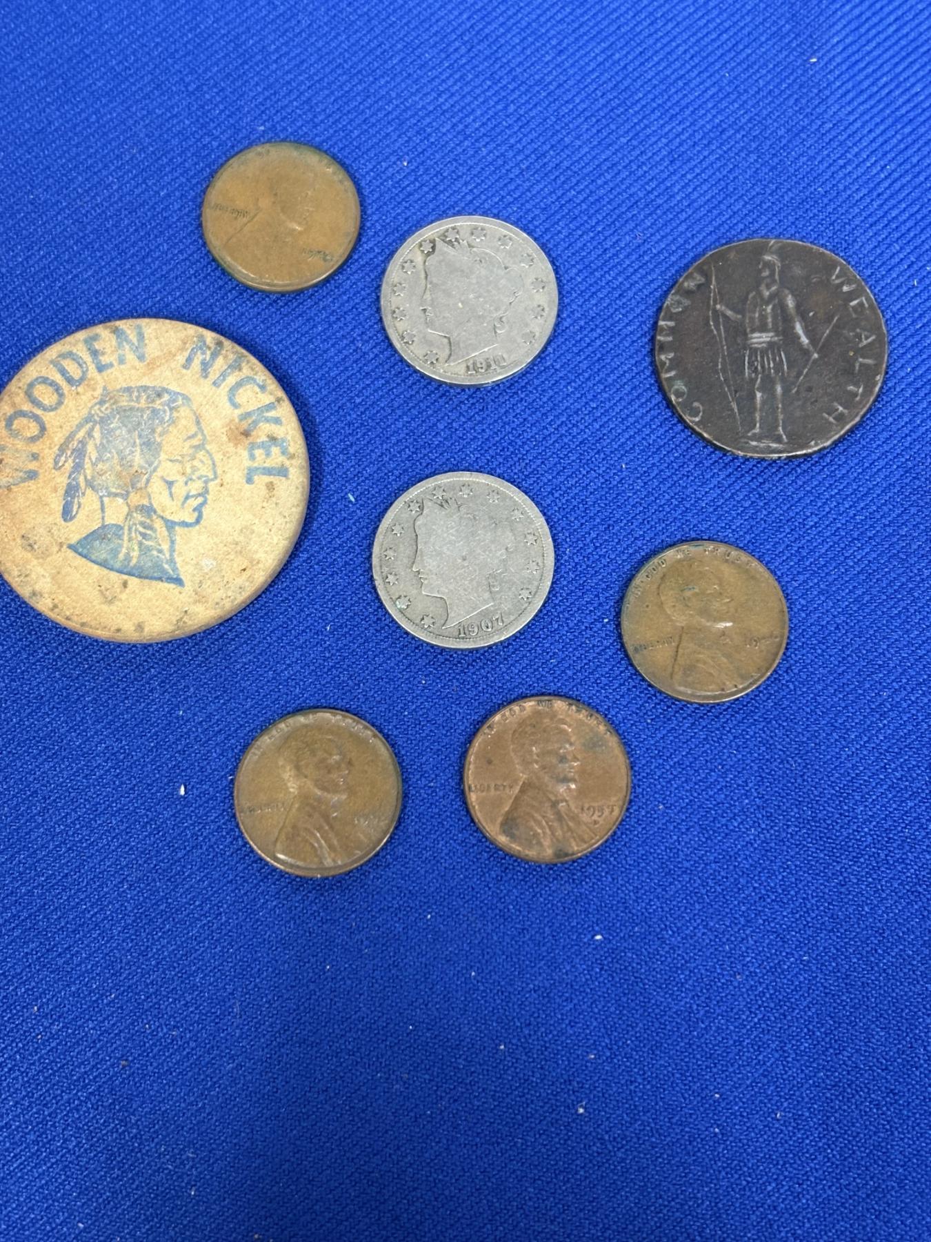 8 Coins - FV $0.20 - Wooden Nickel - (2) V Nickels - 4 Pennies - 1788 Commonwealth Penny