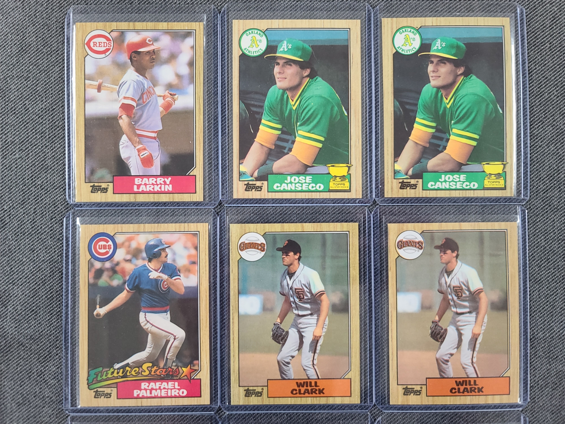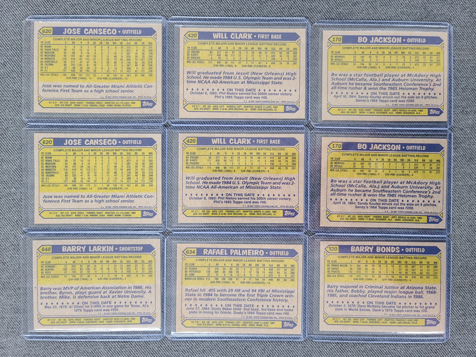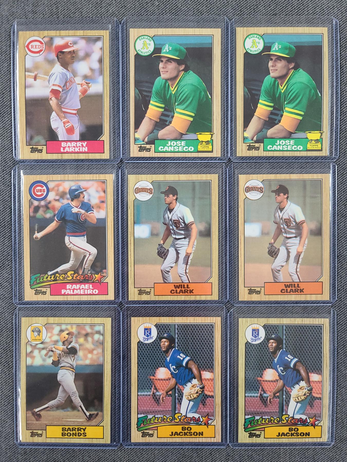 9 Assorted Near Mint 1987 Topps Baseball Trading Cards Including Jose Canseco, Barry Bonds & Bo Jackson!