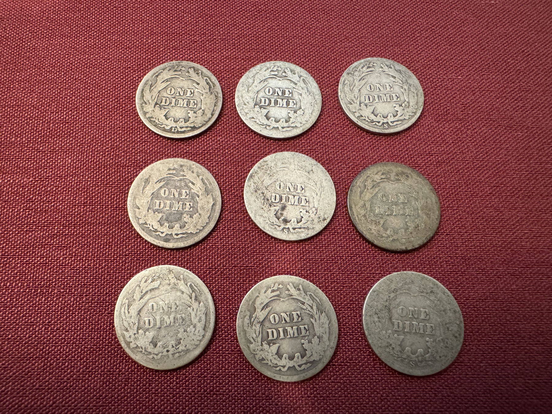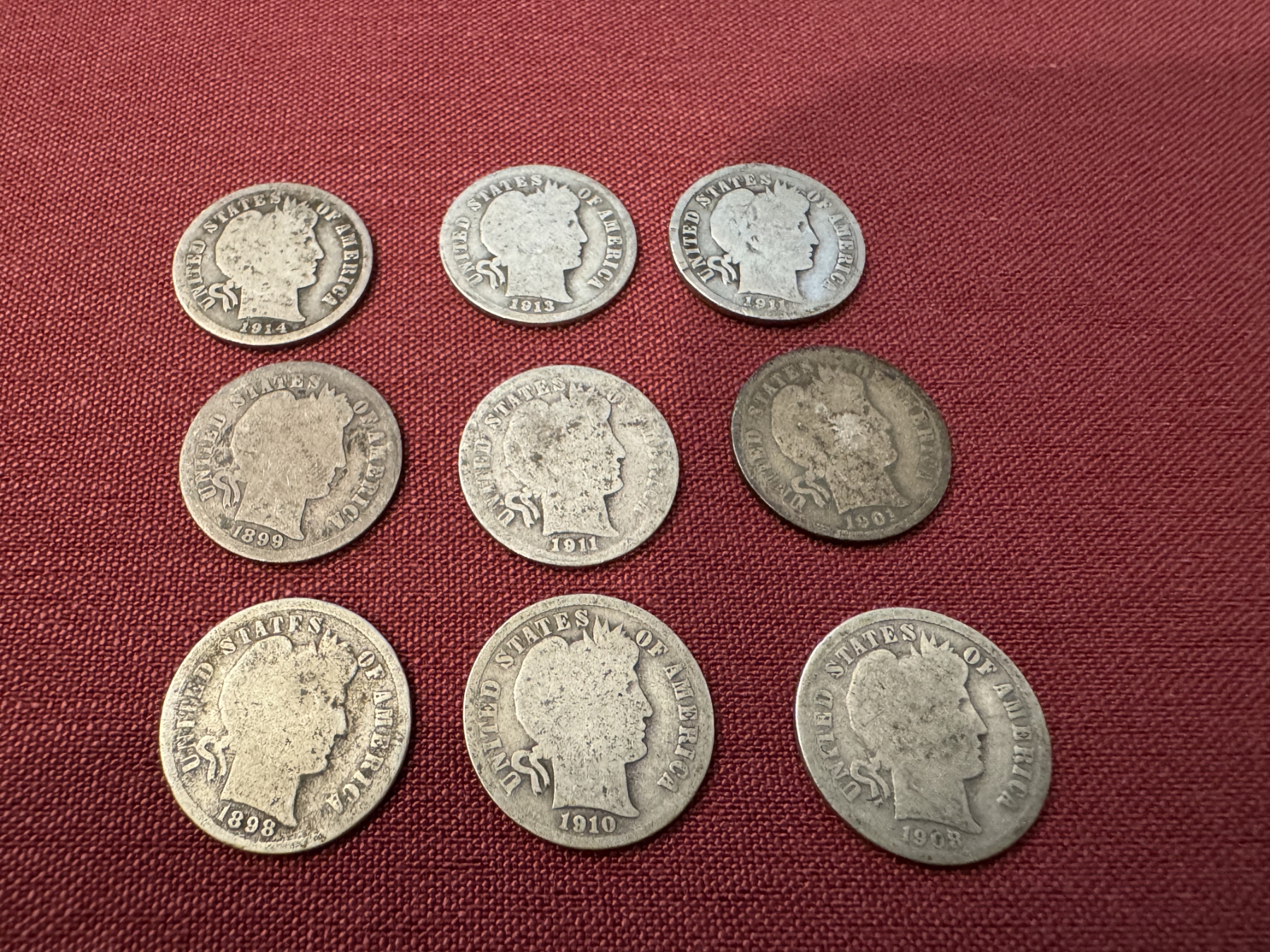 9 - United States Silver Barber Dimes - Rare Constitutional Silver - Authentic US Dimes