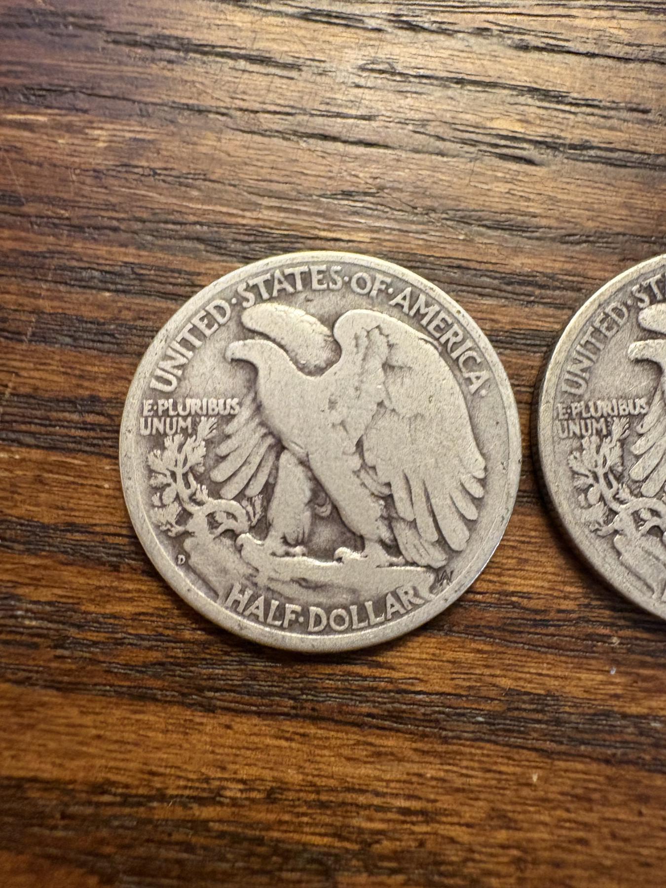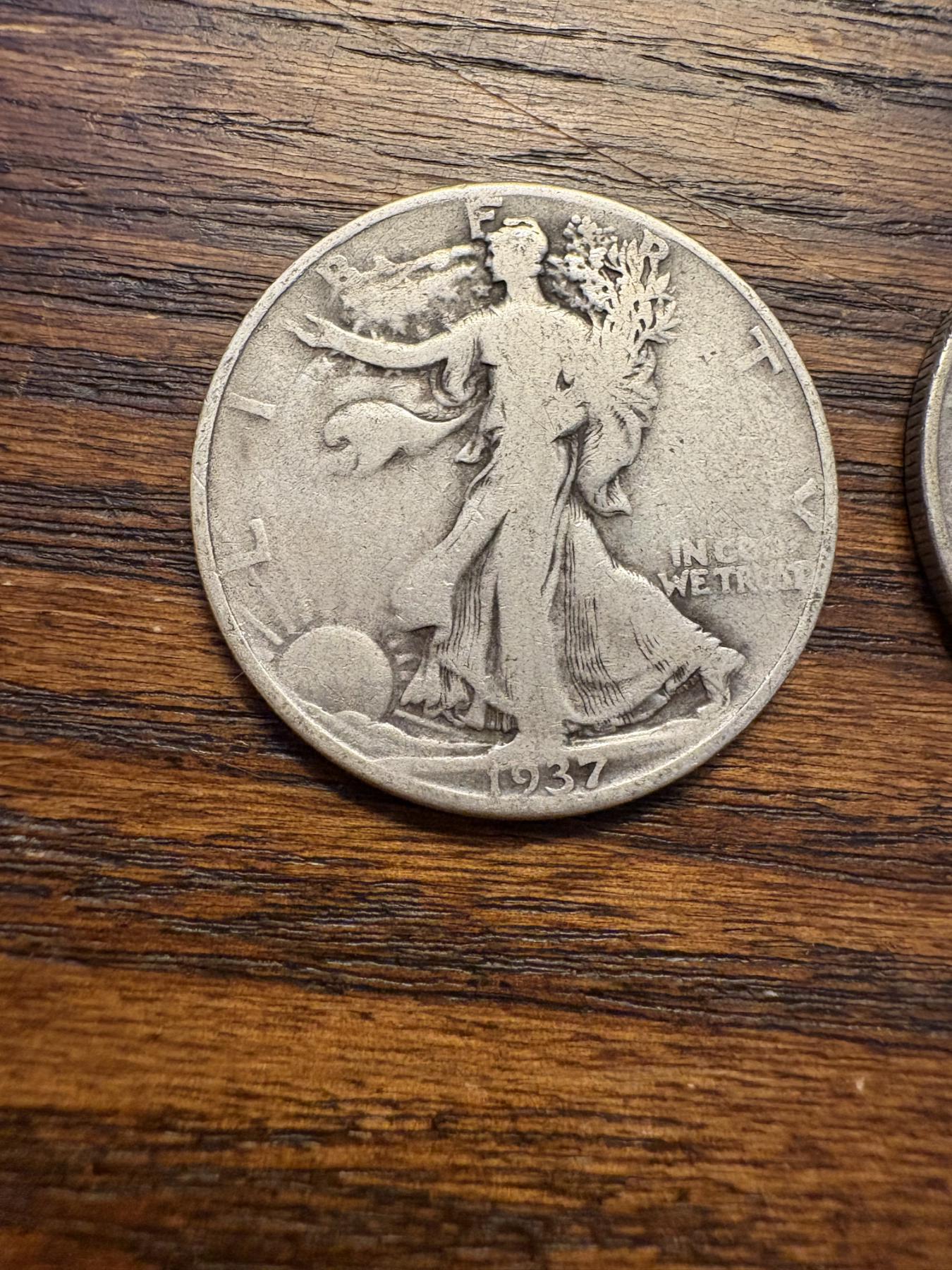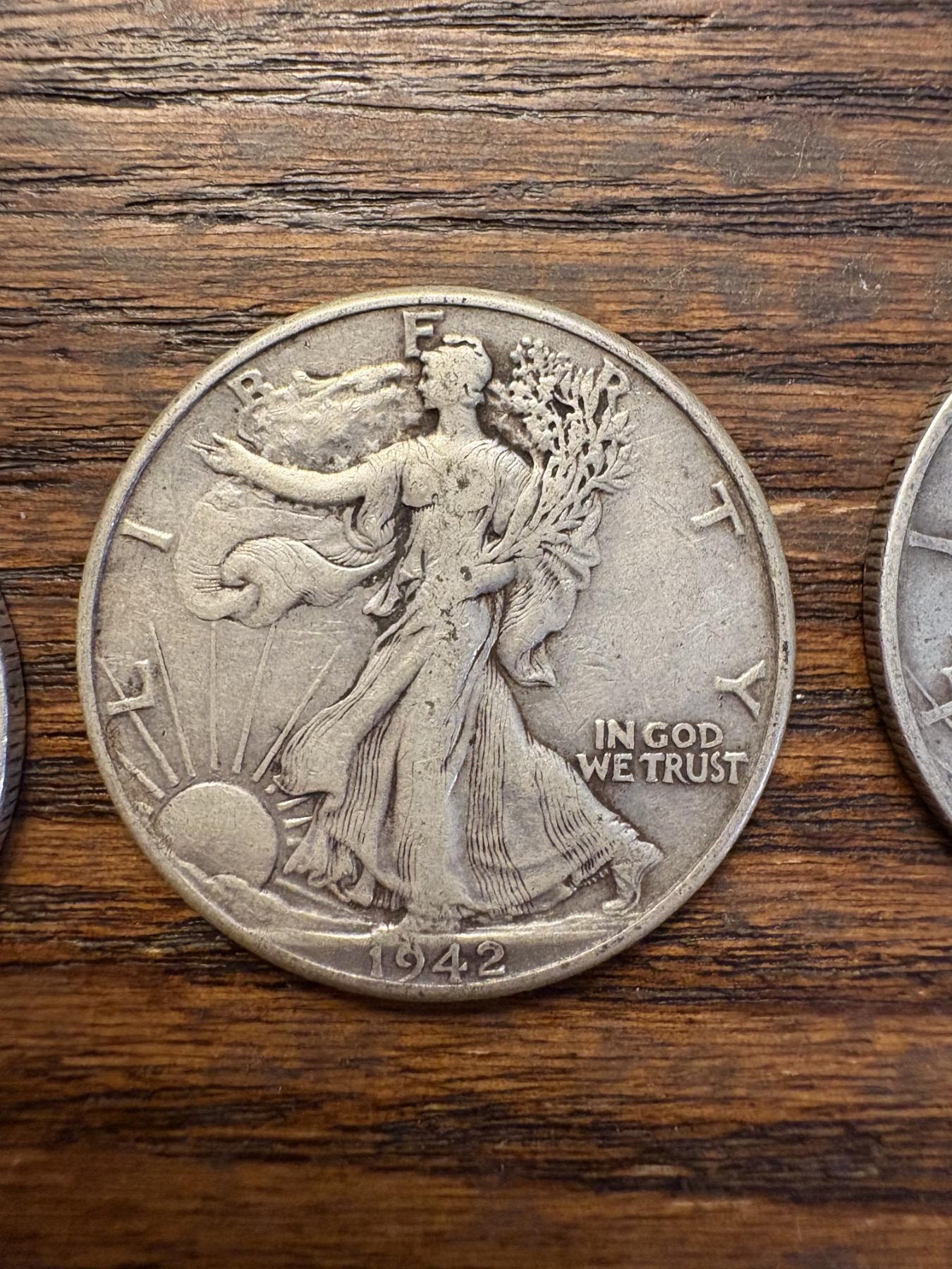 90% Silver - 5 Walking Liberty Silver Half Dollar - FV $2.50 - Years 1937, 1938, 1942, 1941, 1943