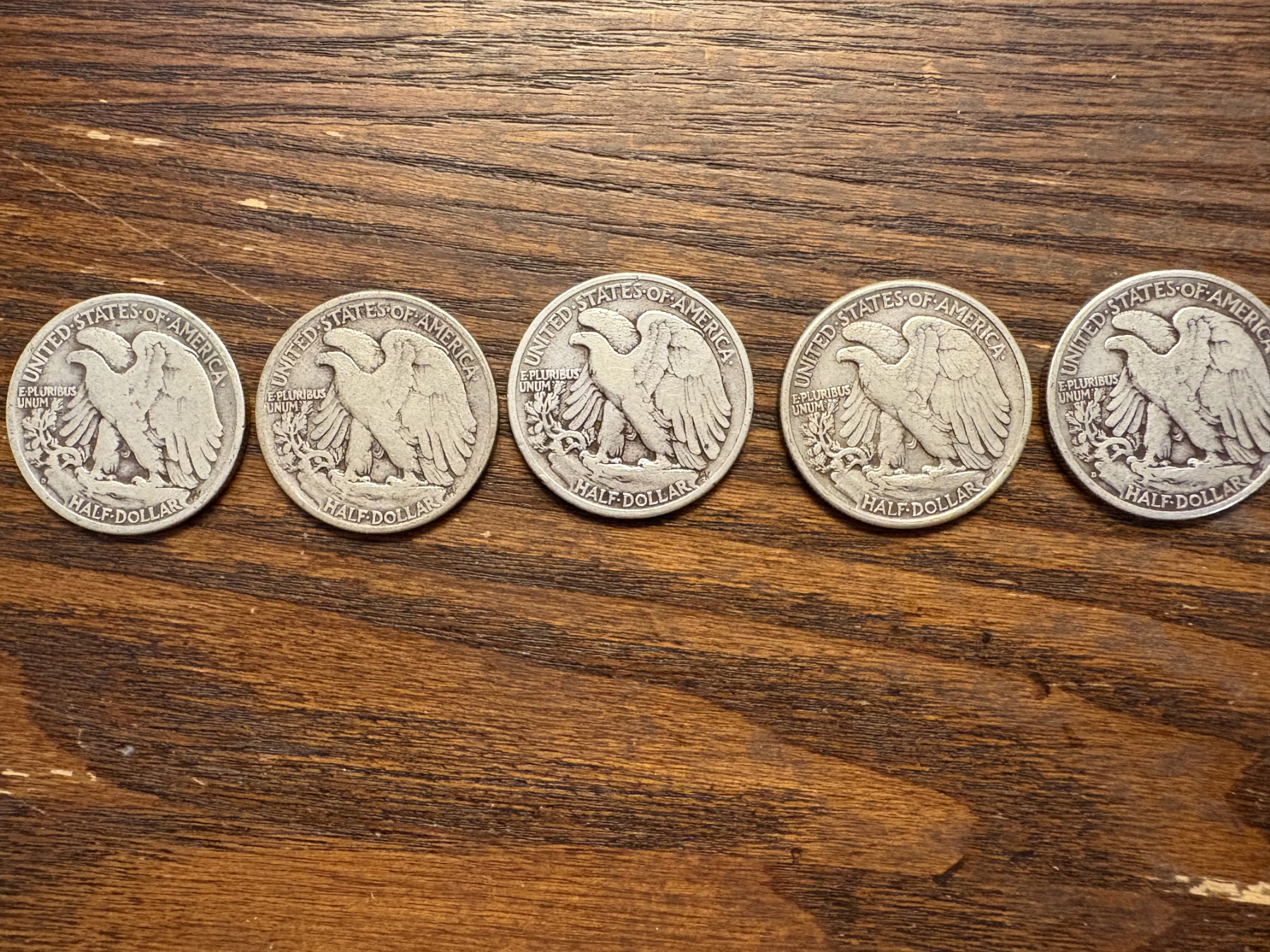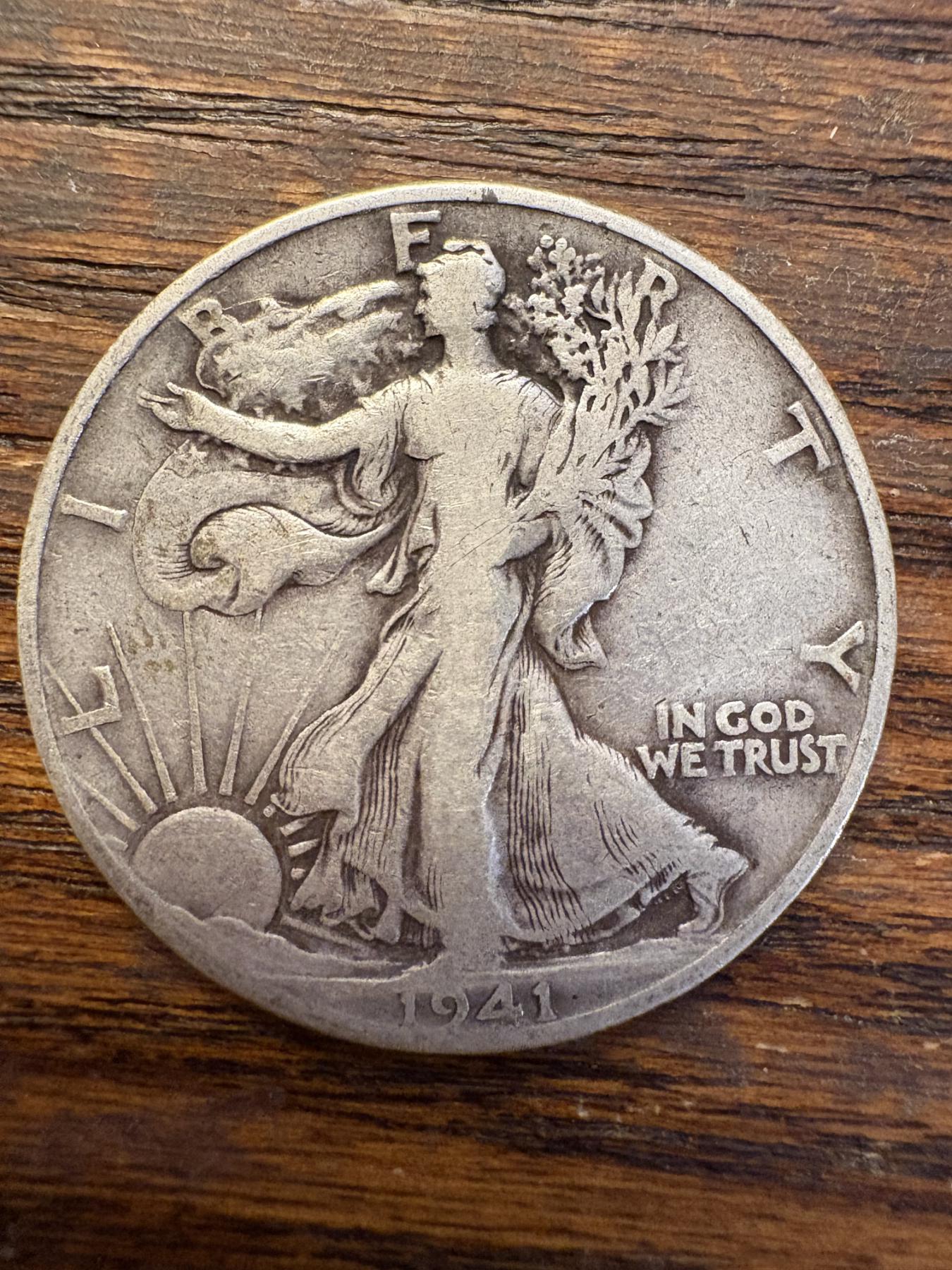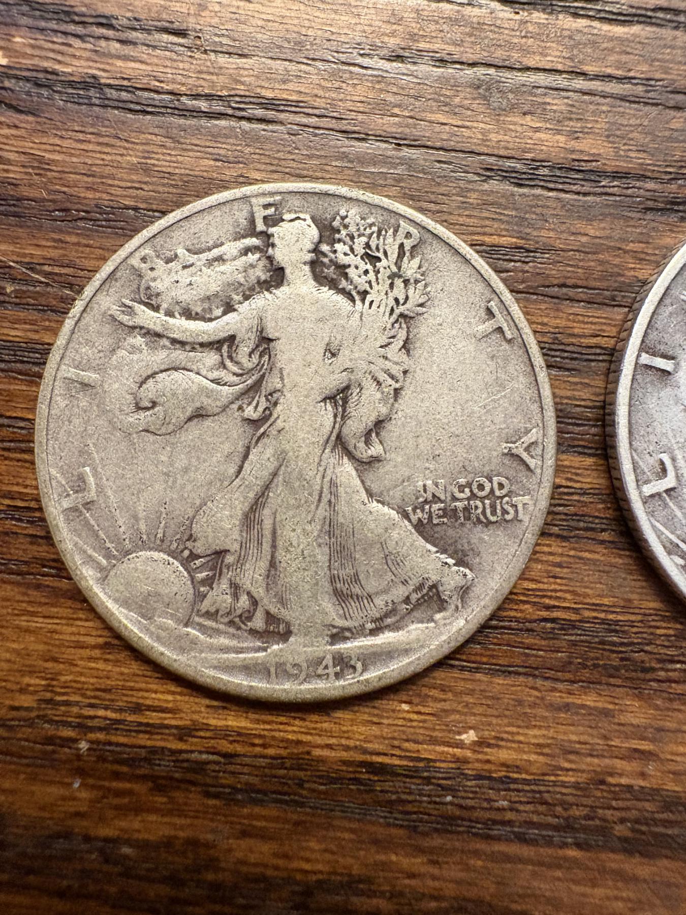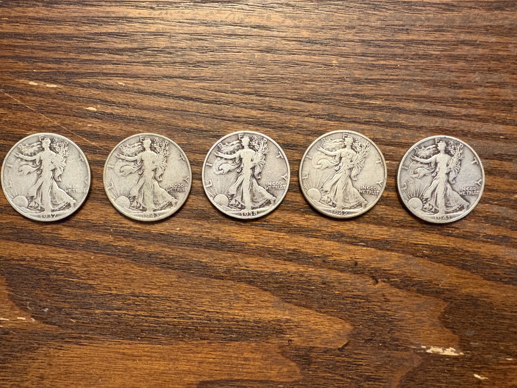 90% Silver - 5 Walking Liberty Silver Half Dollar - FV $2.50 - Years 1937, 1938, 1942, 1941, 1943
