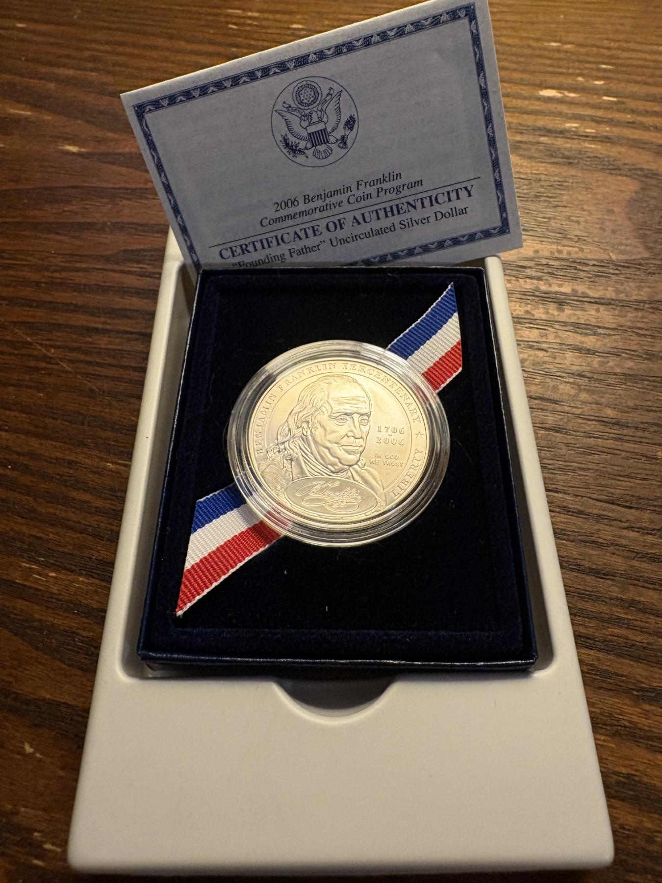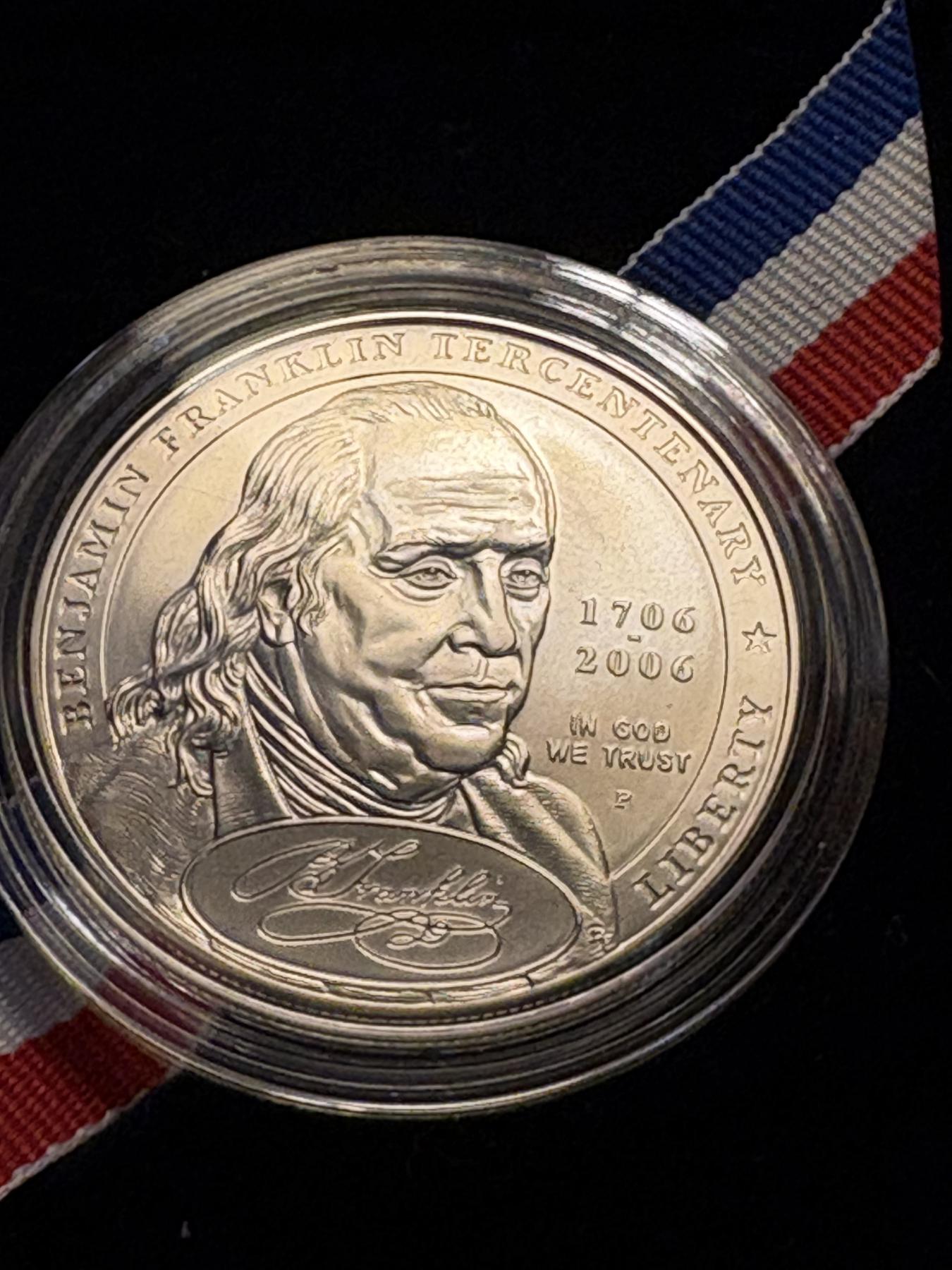 90% UNC Silver Dollar 1706 - 2006 - Benjamin Franklin Commemorative Coin Program - Certificate of Authenticity - Continental Currency