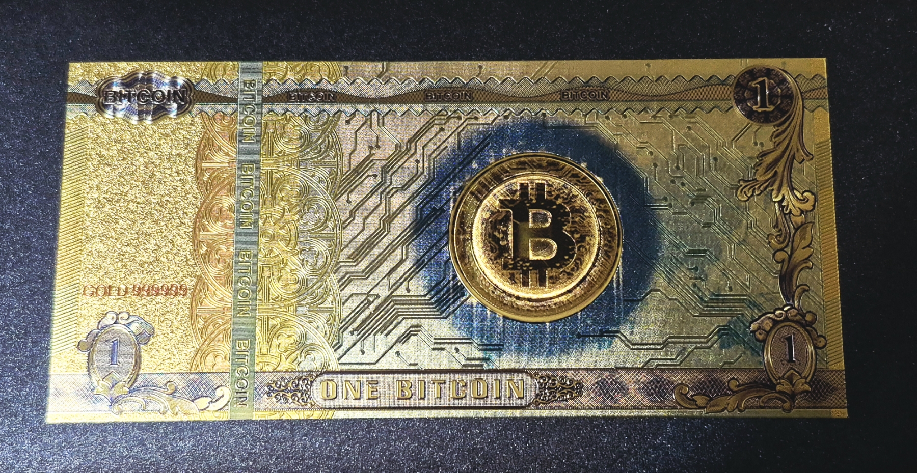 .999 GOLD FOIL 1 BITCOIN NOTE - IN PROTECTIVE SLEEVE - These laminated pure gold foil 24k notes are great collectibles. Weight approx 3 - 4 grams overall.