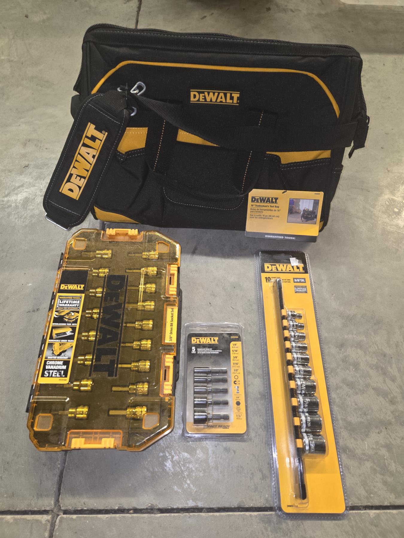 All Brand New! DeWalt 16'' Tradesman Bag, Socket & Driver Sets