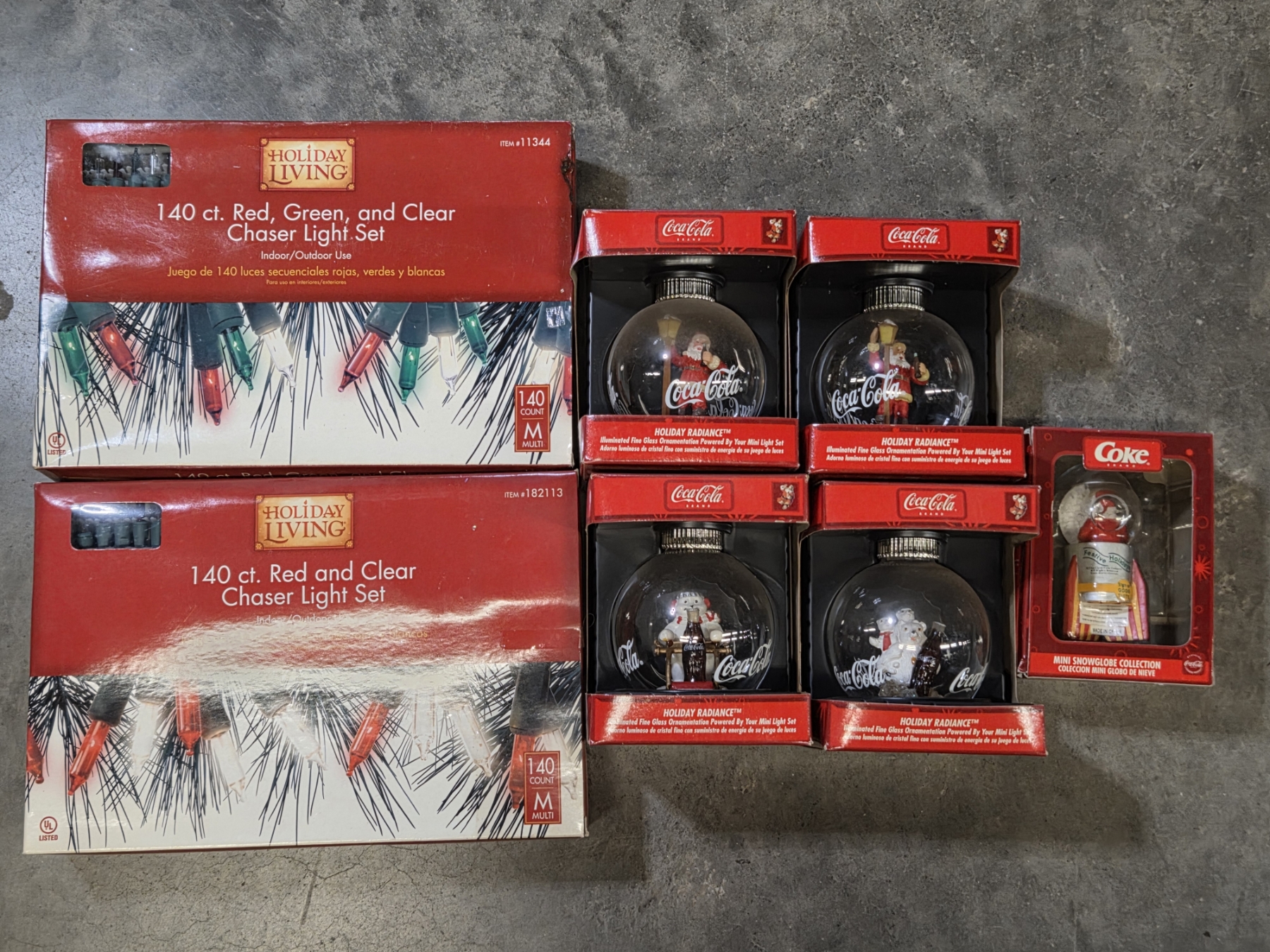 All Brand New- Two 140 Light Sets, And 5 Collectable Coca Cola Ornaments