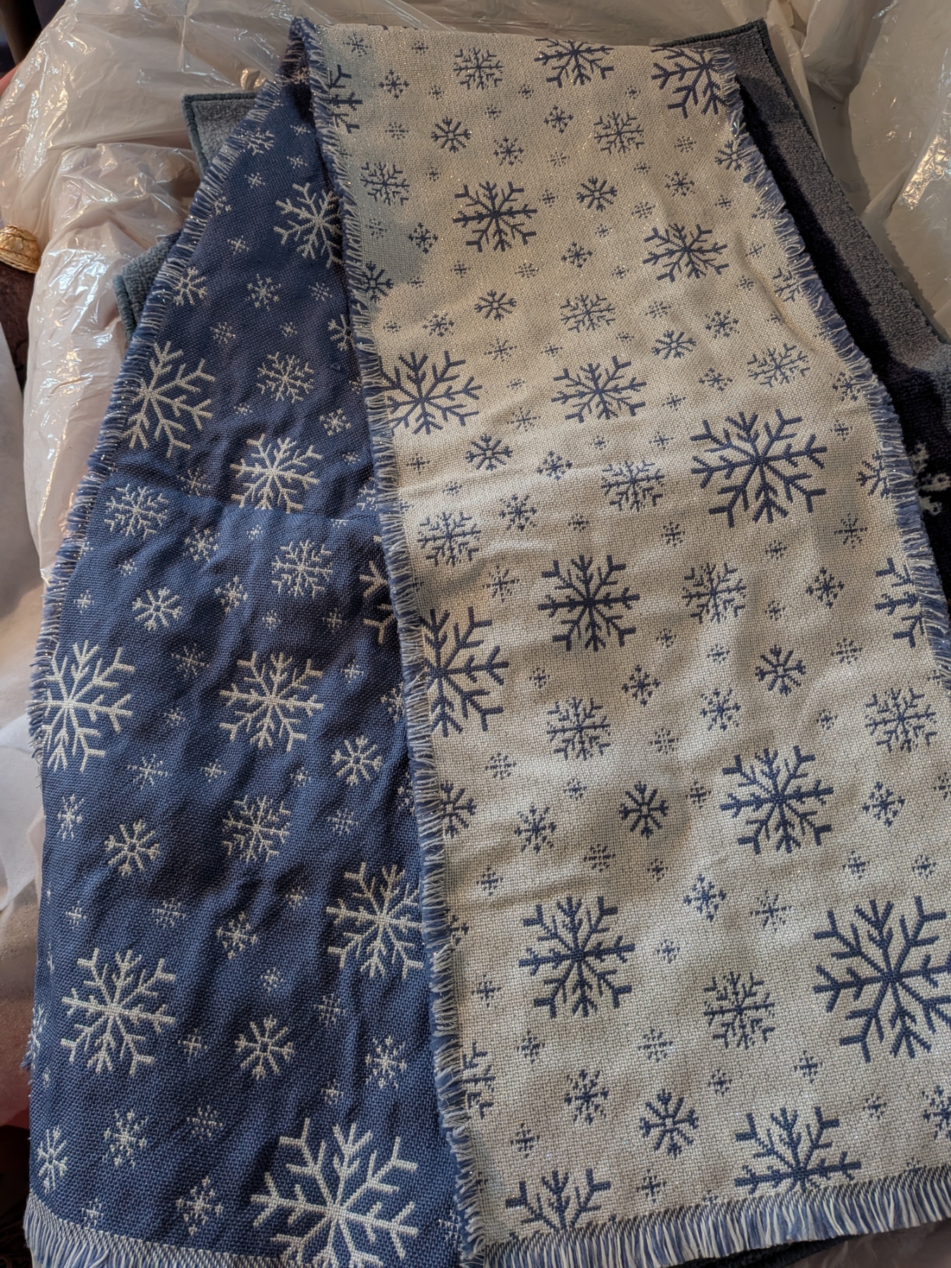 All New! 3 20"x34" Christmas Rugs And 8ft Sparkling Snowflake Reversable Table Runner