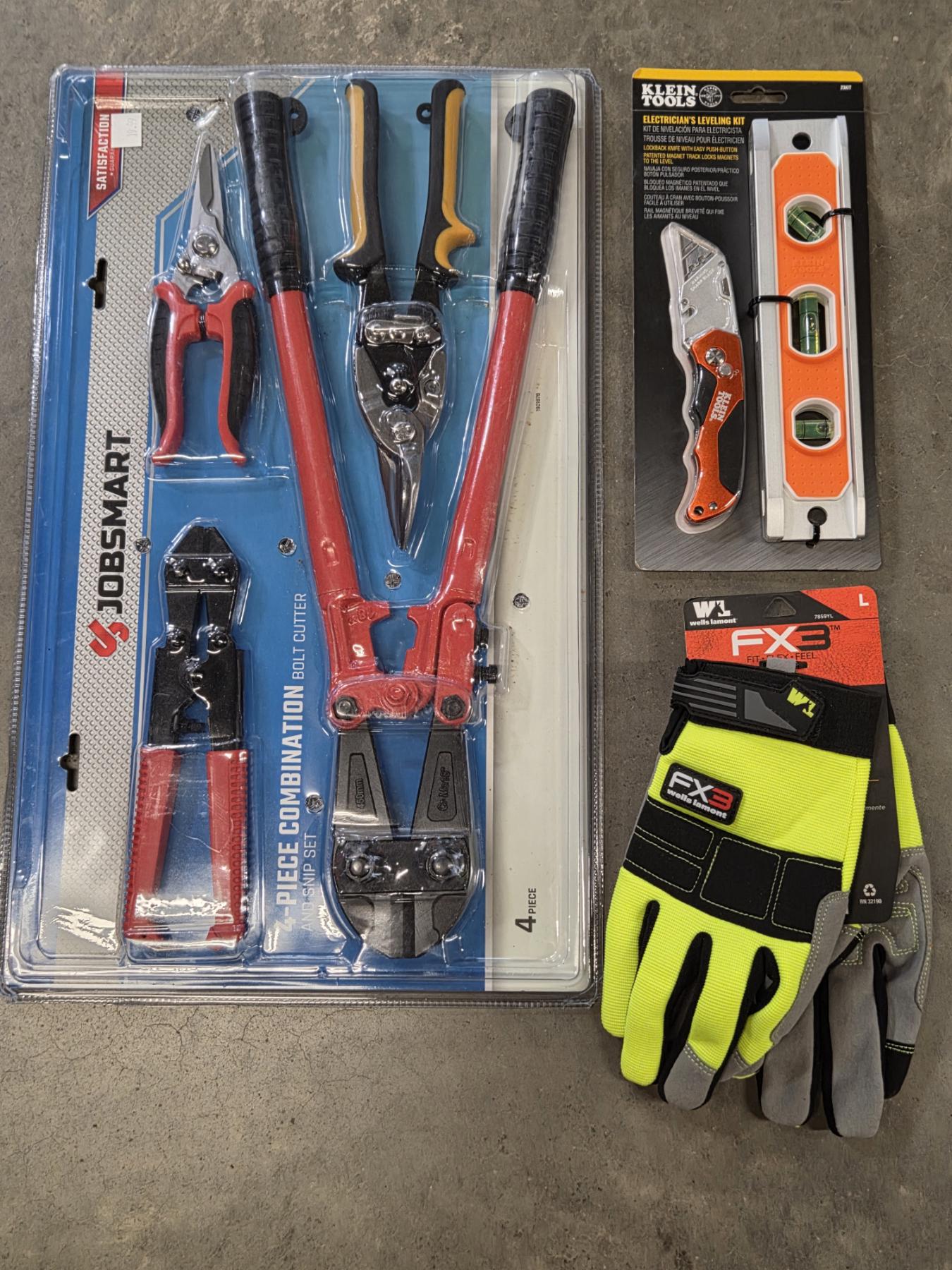 All New- Bolt Cutter/Snip Set, Gloves, Knife & Level