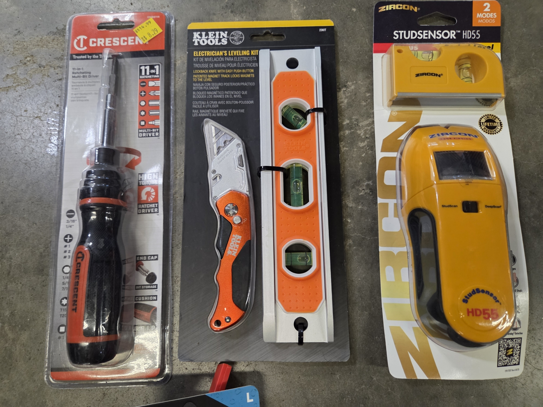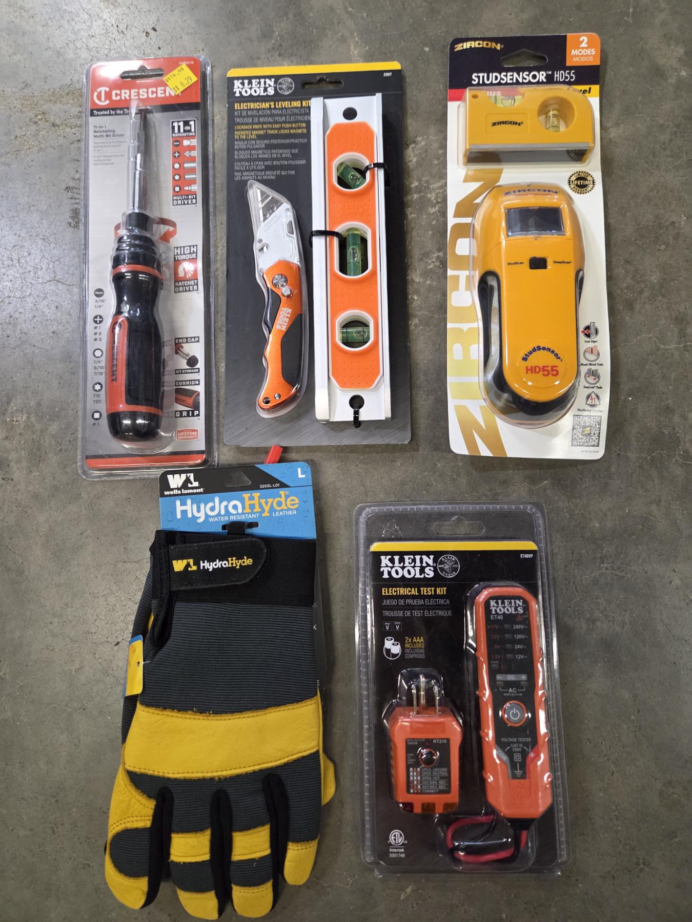 All New- Gloves, Electric Test Kit, Stud Sensor, Knife, Level & Bit Driver Set