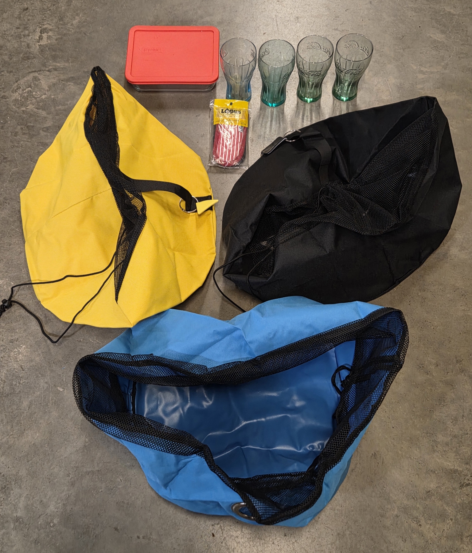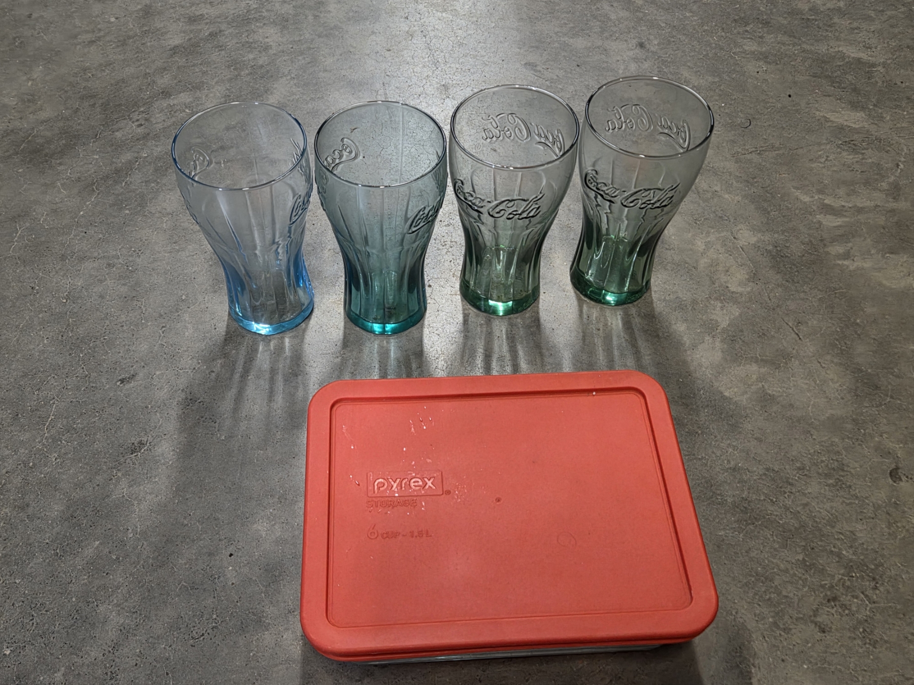 All New -Three 22'' Canvas Storage Bags, 8''x9'' Pyrex Dish With Lid, 4 Coke Glasses & Cast Iron Pan Holders