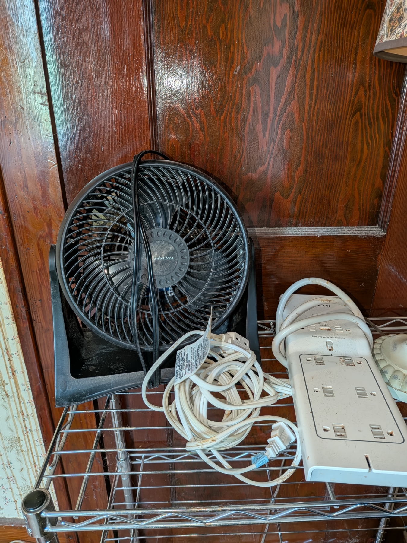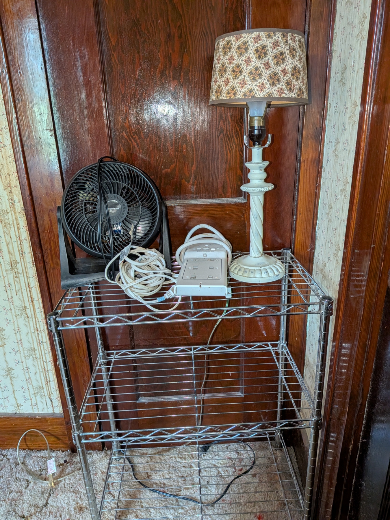Almost New Metal Shelving Unit 23"x30", Lamp, Small Fan, Power Strip & Extension Cord