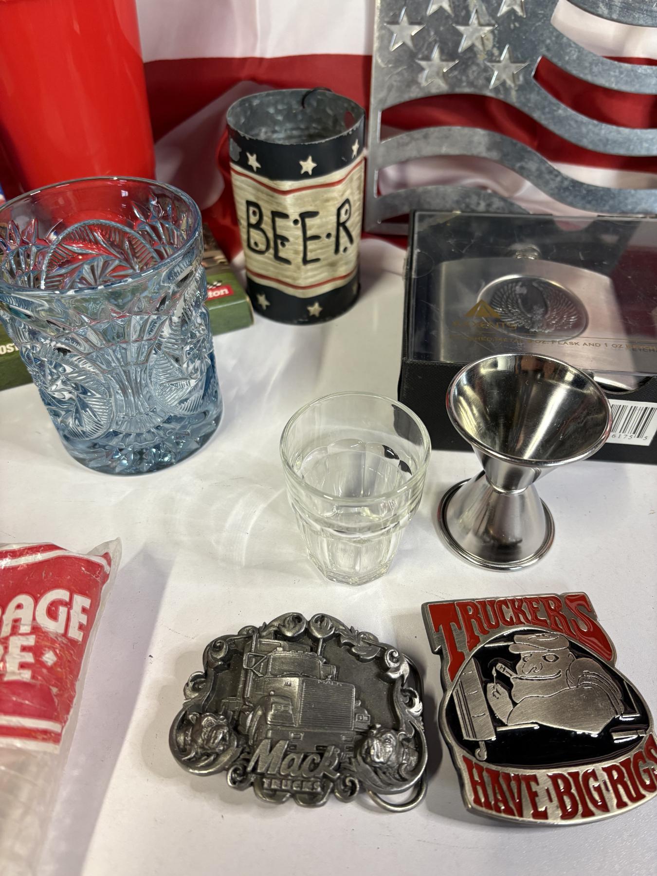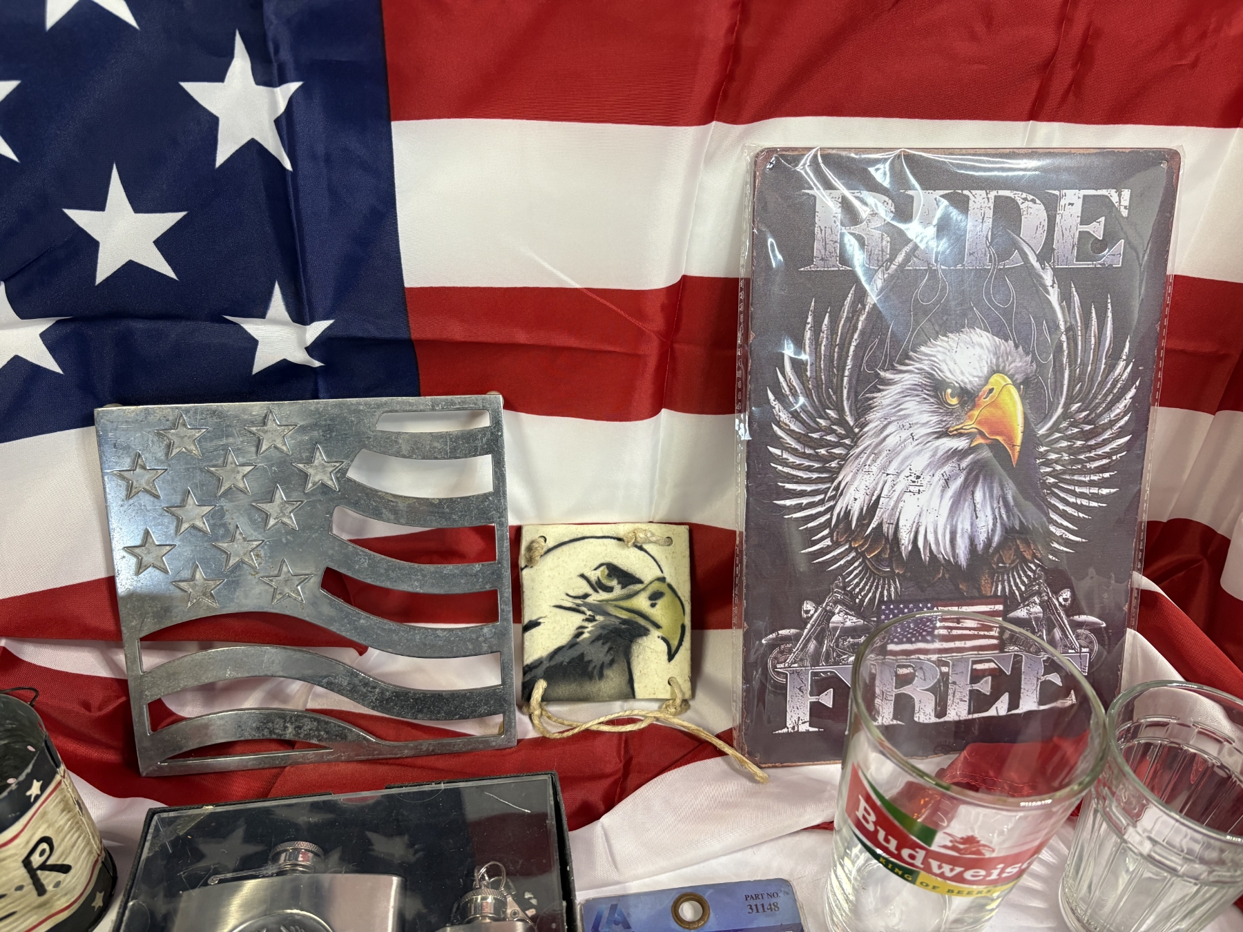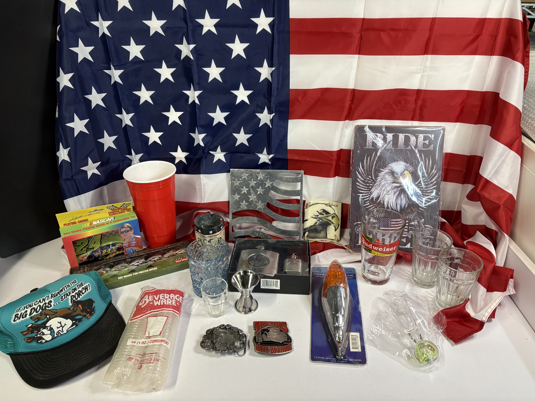 American Flag - Metal American Flag Stand - Ride Free Eagle Metal Poster - Glass Cups - Shot Glasses - Mack Truck Pins - Racing Lighters - Nascar Playing Cards - Hat - Flasks - Eagle Head Pick-up Cab Light