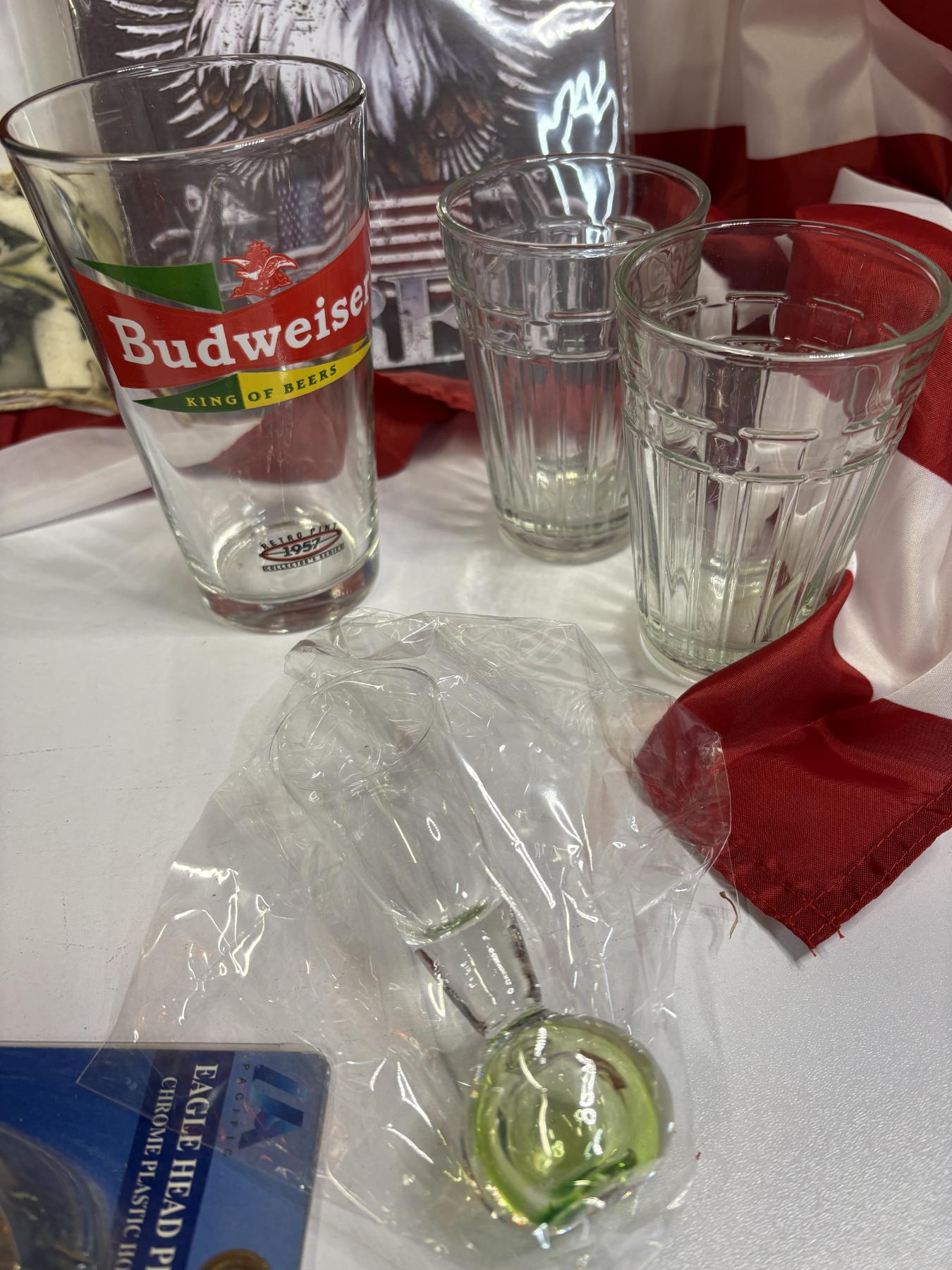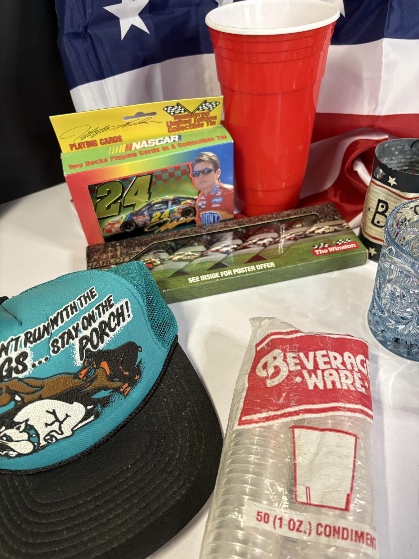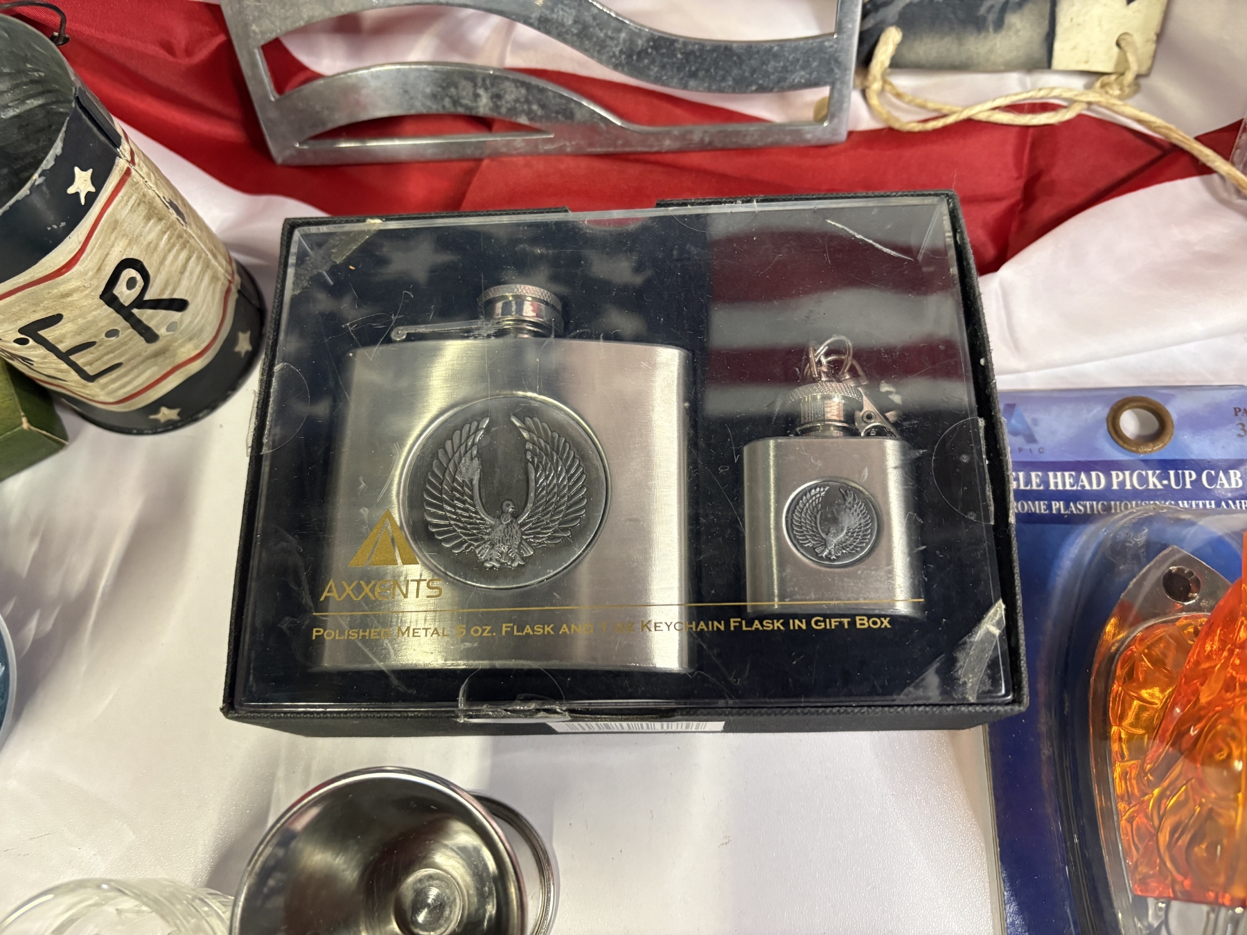 American Flag - Metal American Flag Stand - Ride Free Eagle Metal Poster - Glass Cups - Shot Glasses - Mack Truck Pins - Racing Lighters - Nascar Playing Cards - Hat - Flasks - Eagle Head Pick-up Cab Light