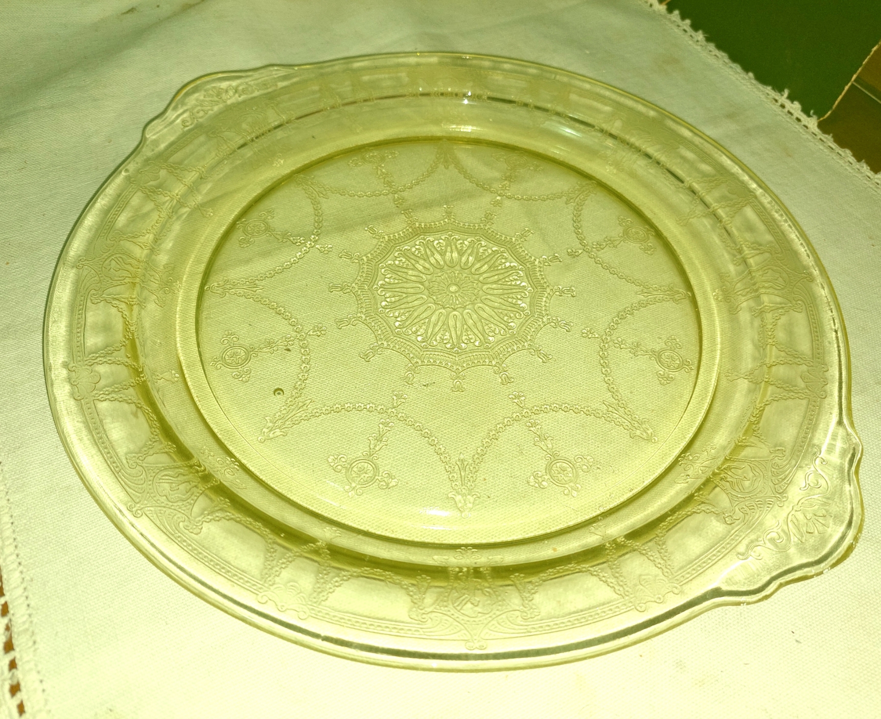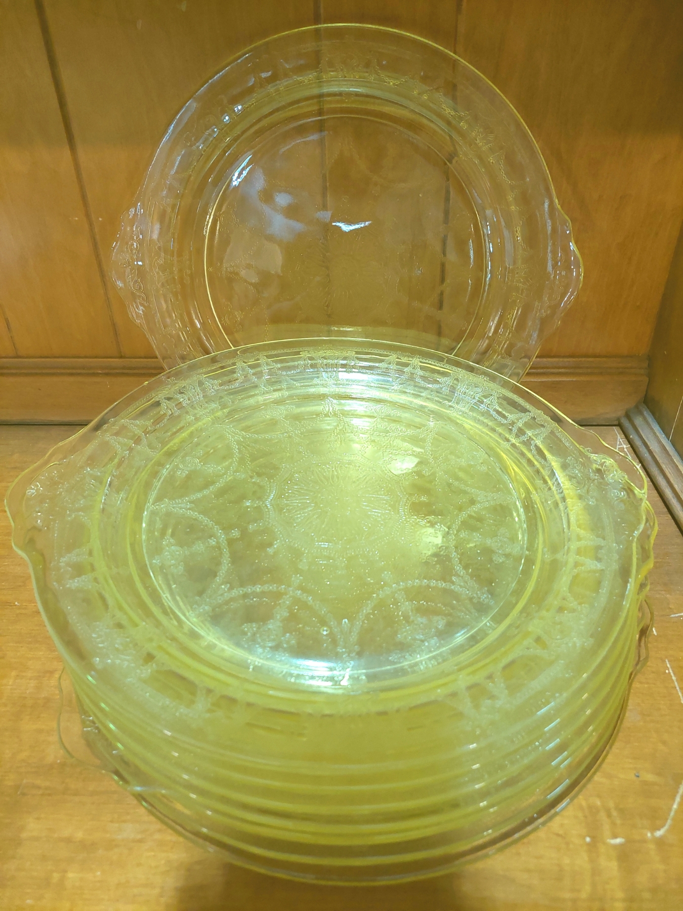 Antique 9 Pcs "Cameo / Ballerina" Depression Glass Cake Plates - Also Known As "Dancing Girl" Made by Anchor Hocking - All In Perfect Condition