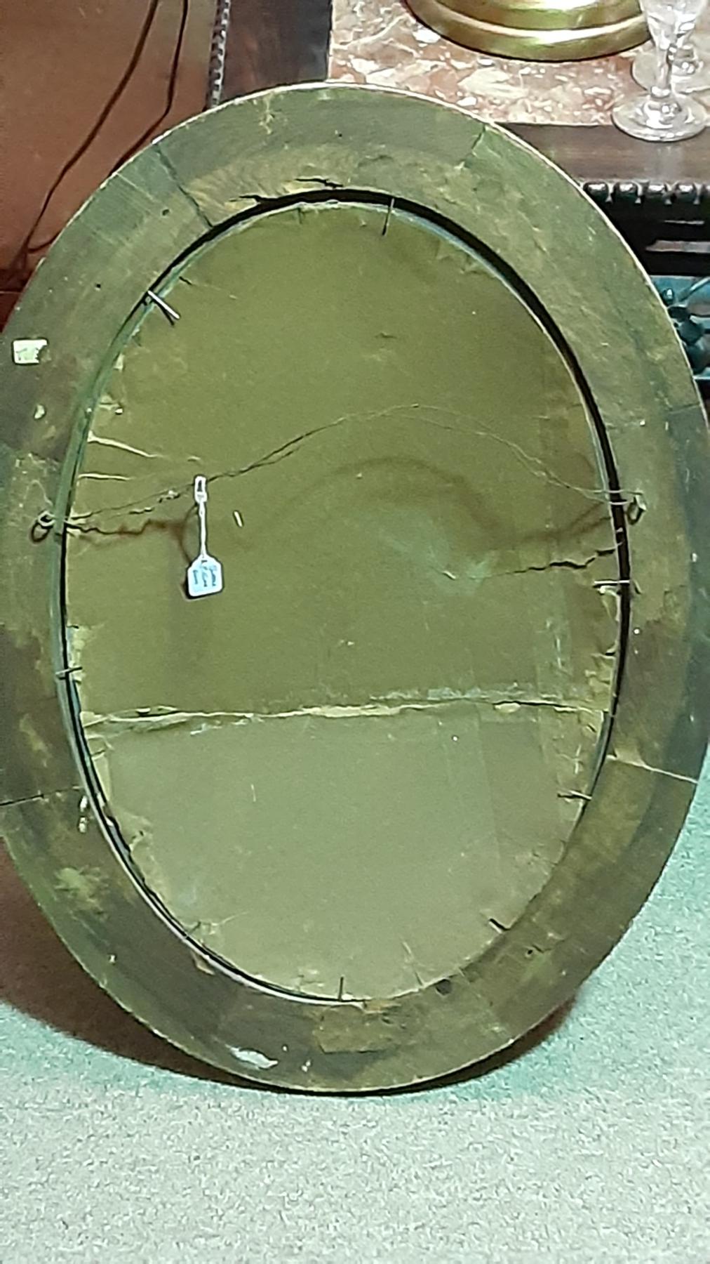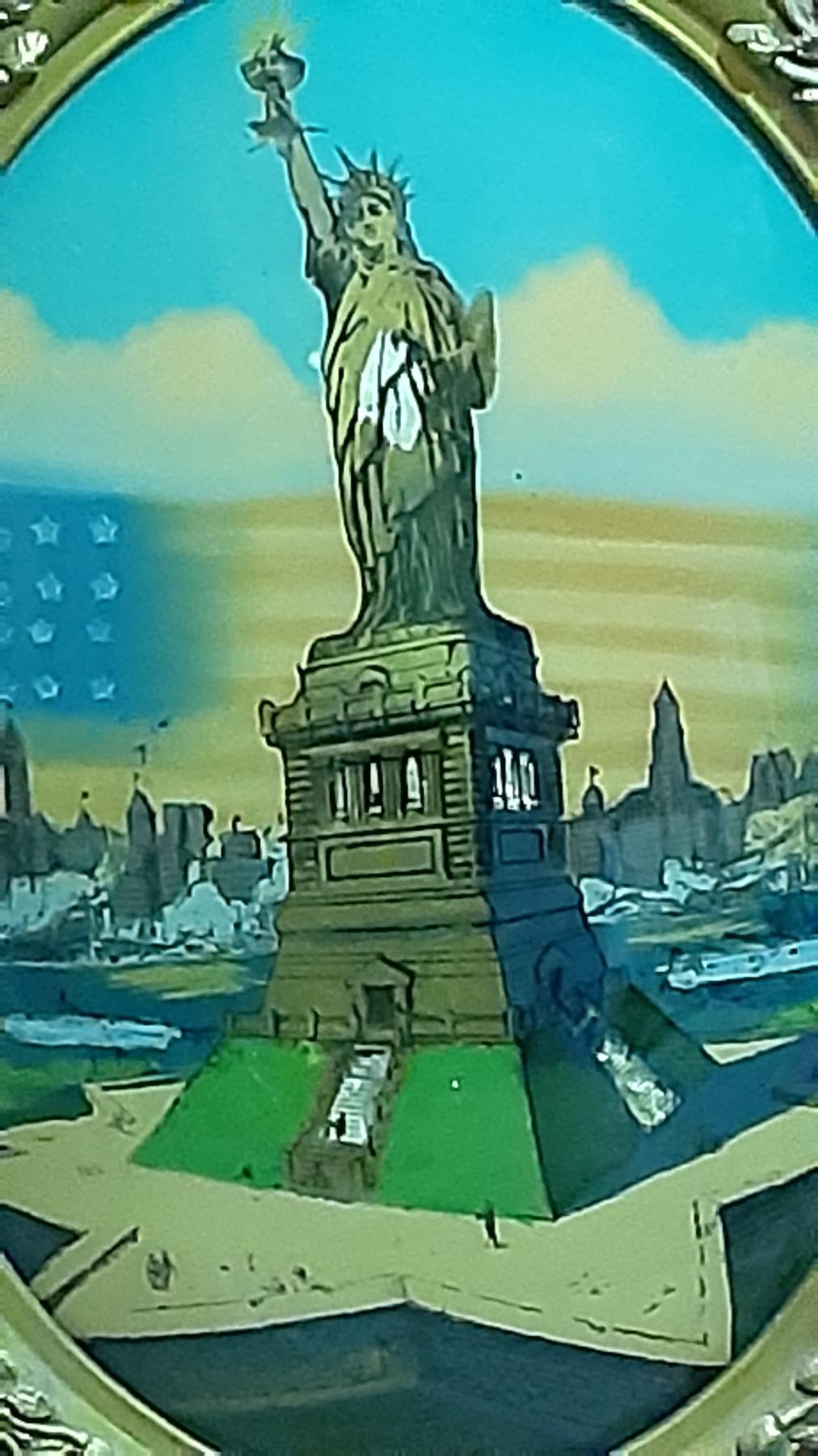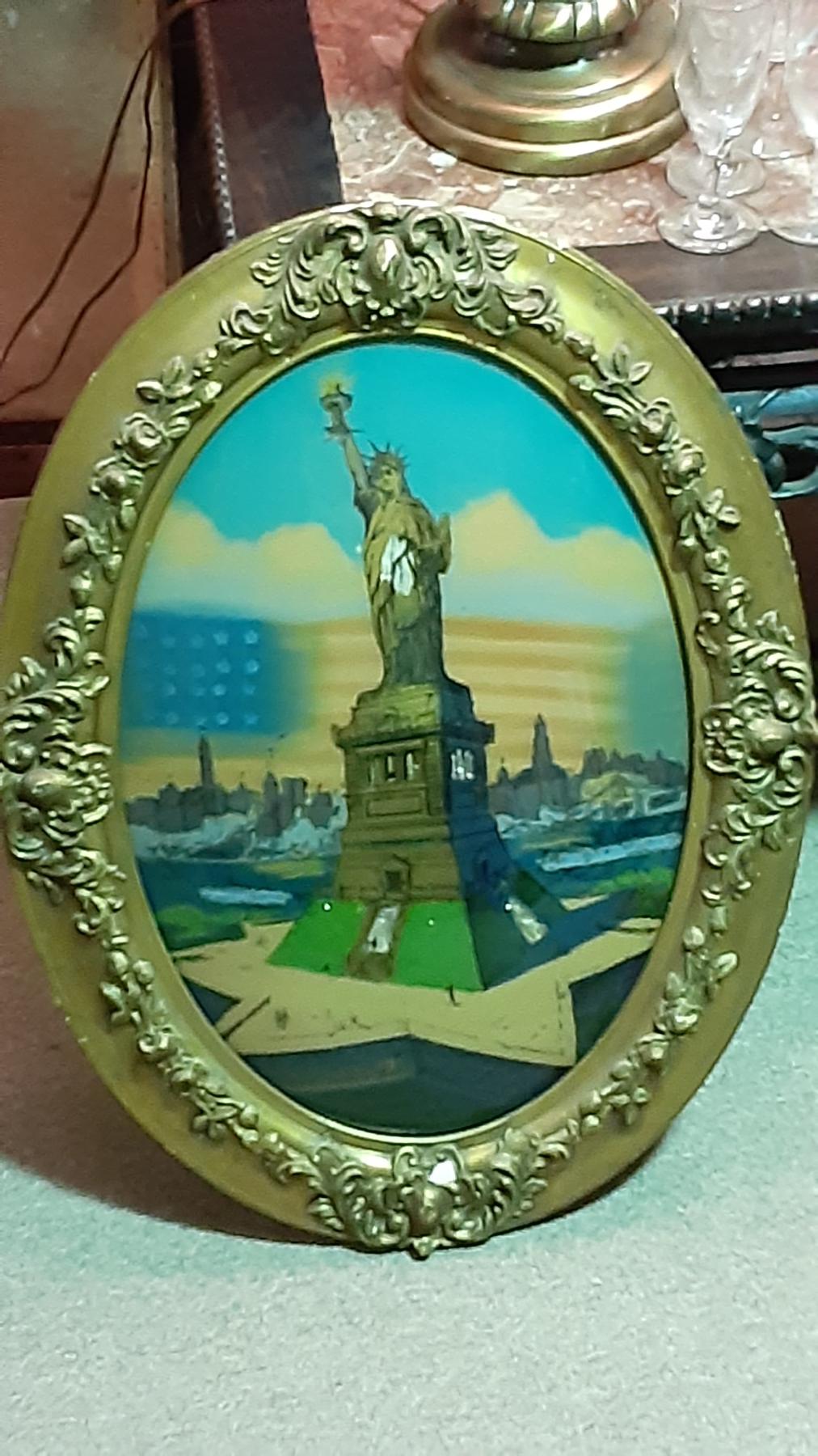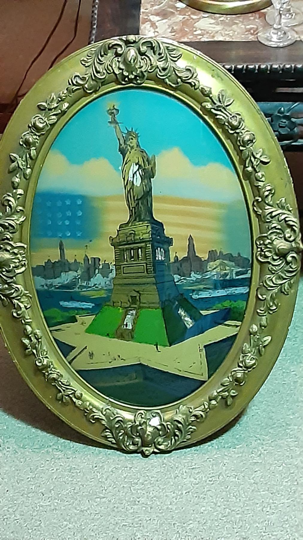 Antique ART - Oval Wood Frame with curved Reverse Painted Glass - Statue Of Liberty Depiction - 25" x 19"