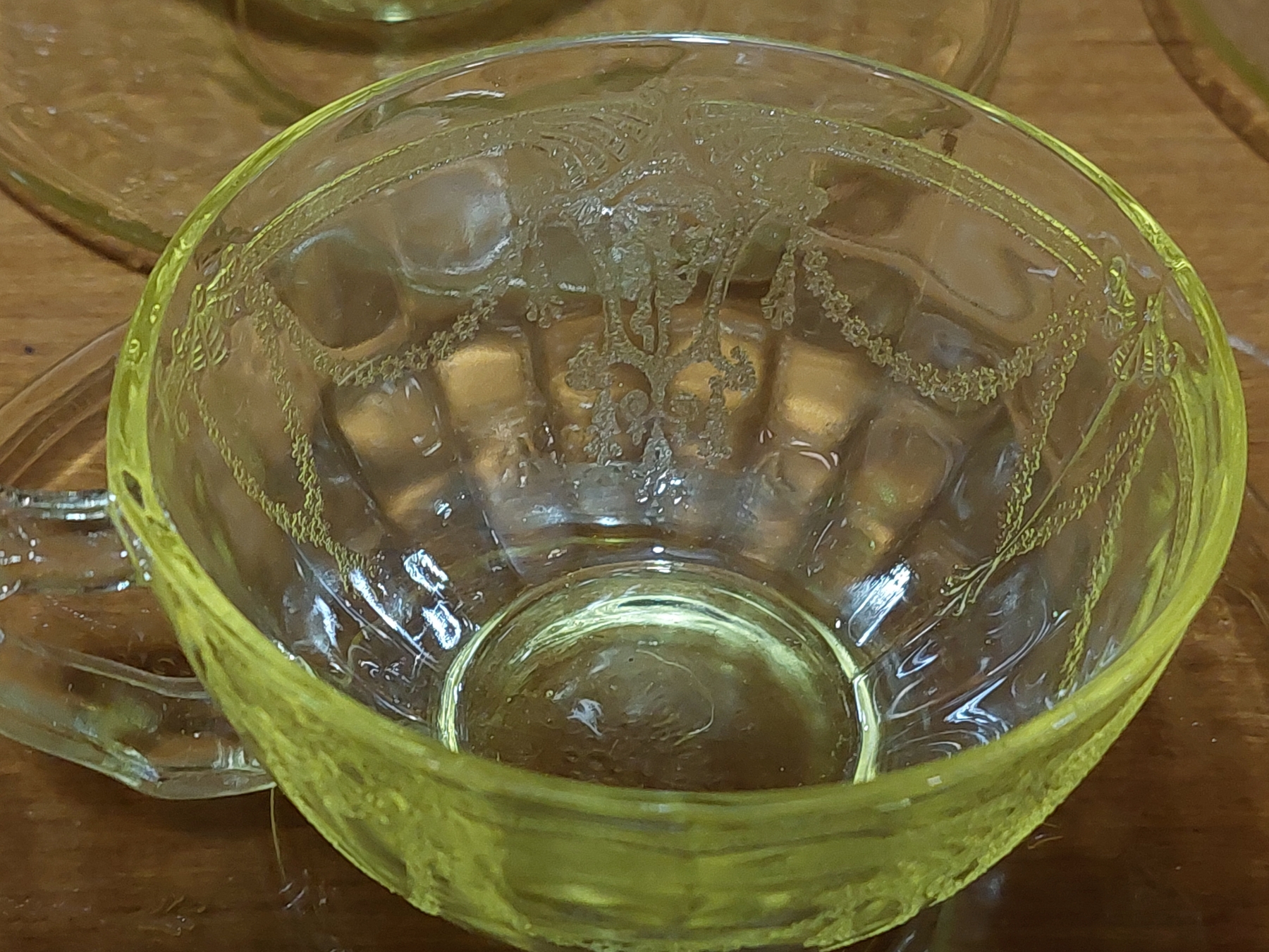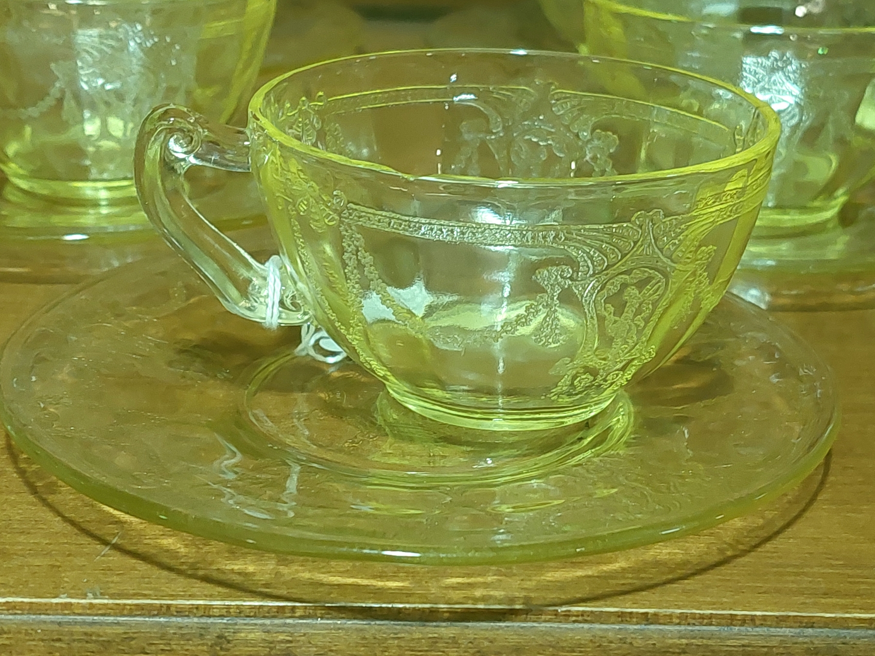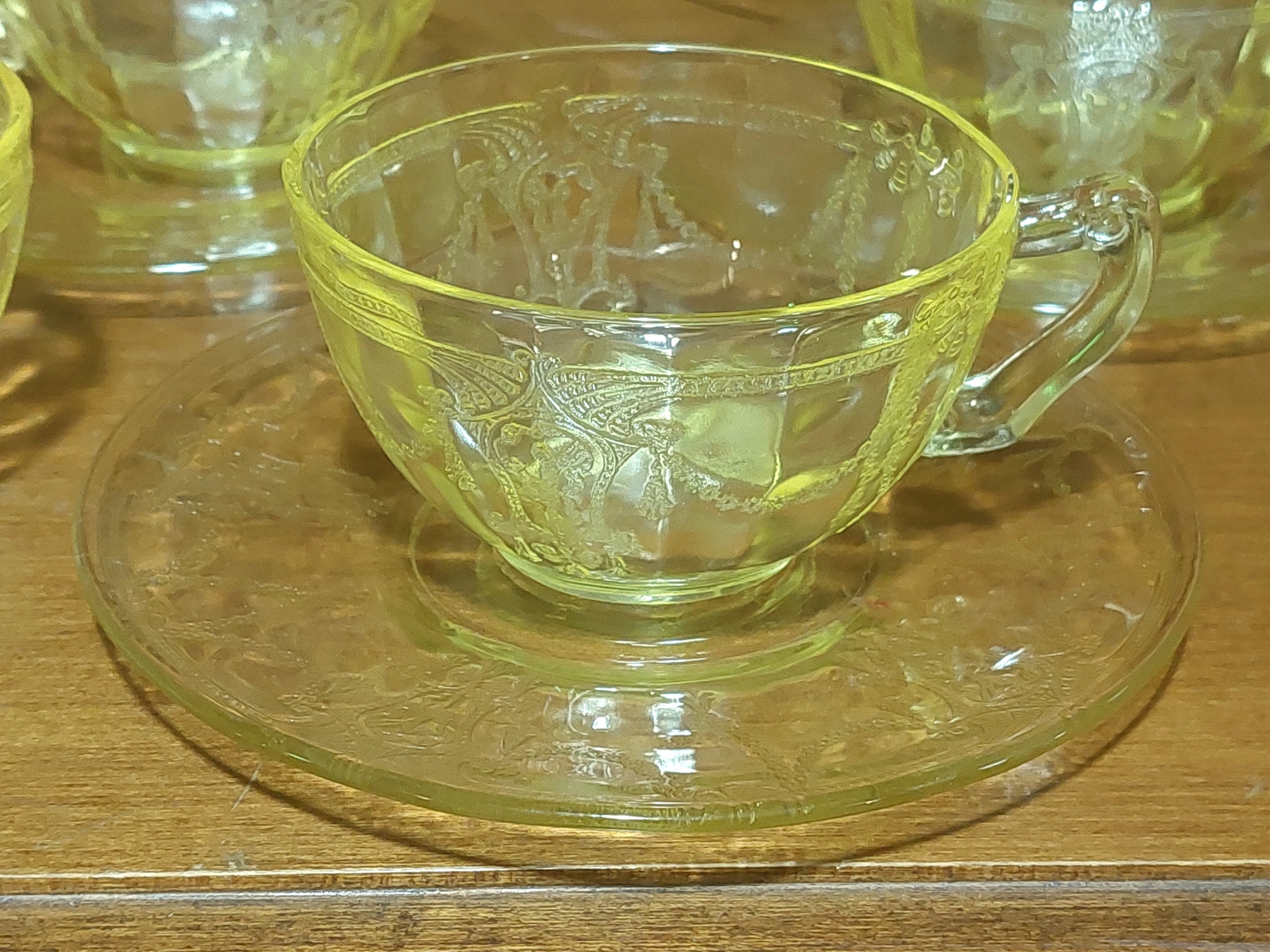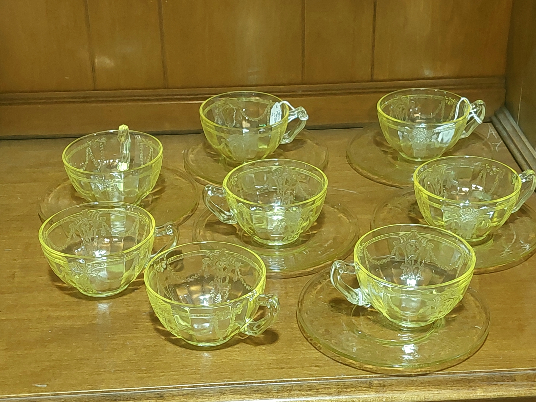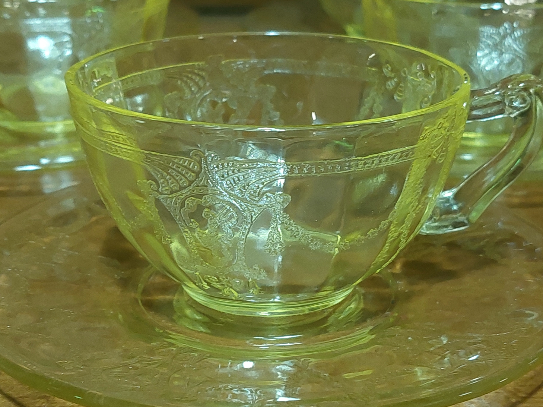 Antique "Cameo / Ballerina" Depression Glass Cups & Saucers Also Known As "Dancing Girl" - 6 Sets Plus 2 Extra Cups - Made by Anchor Hocking - All In Perfect Condition