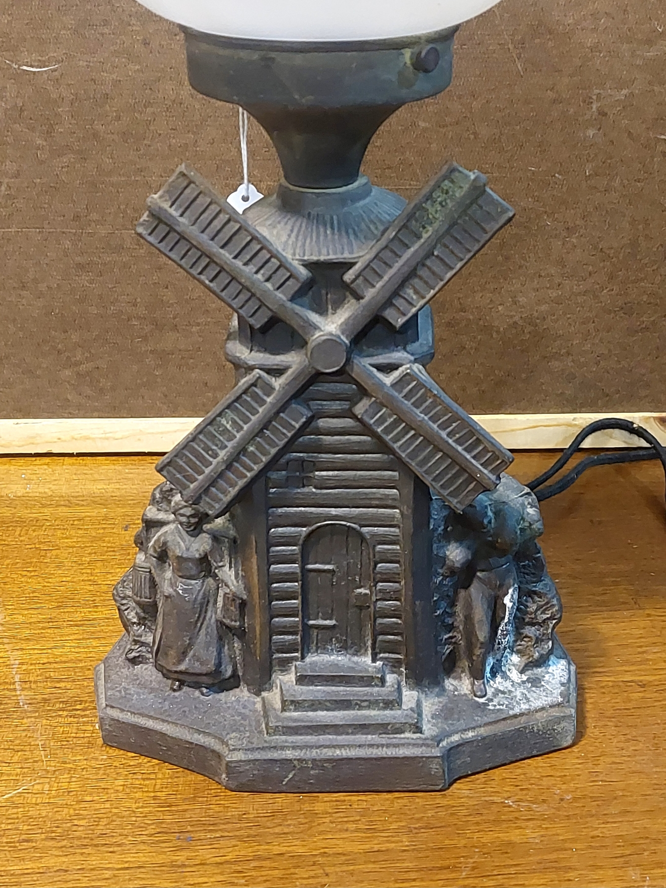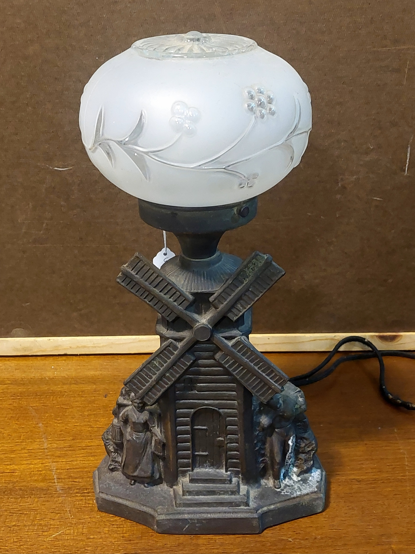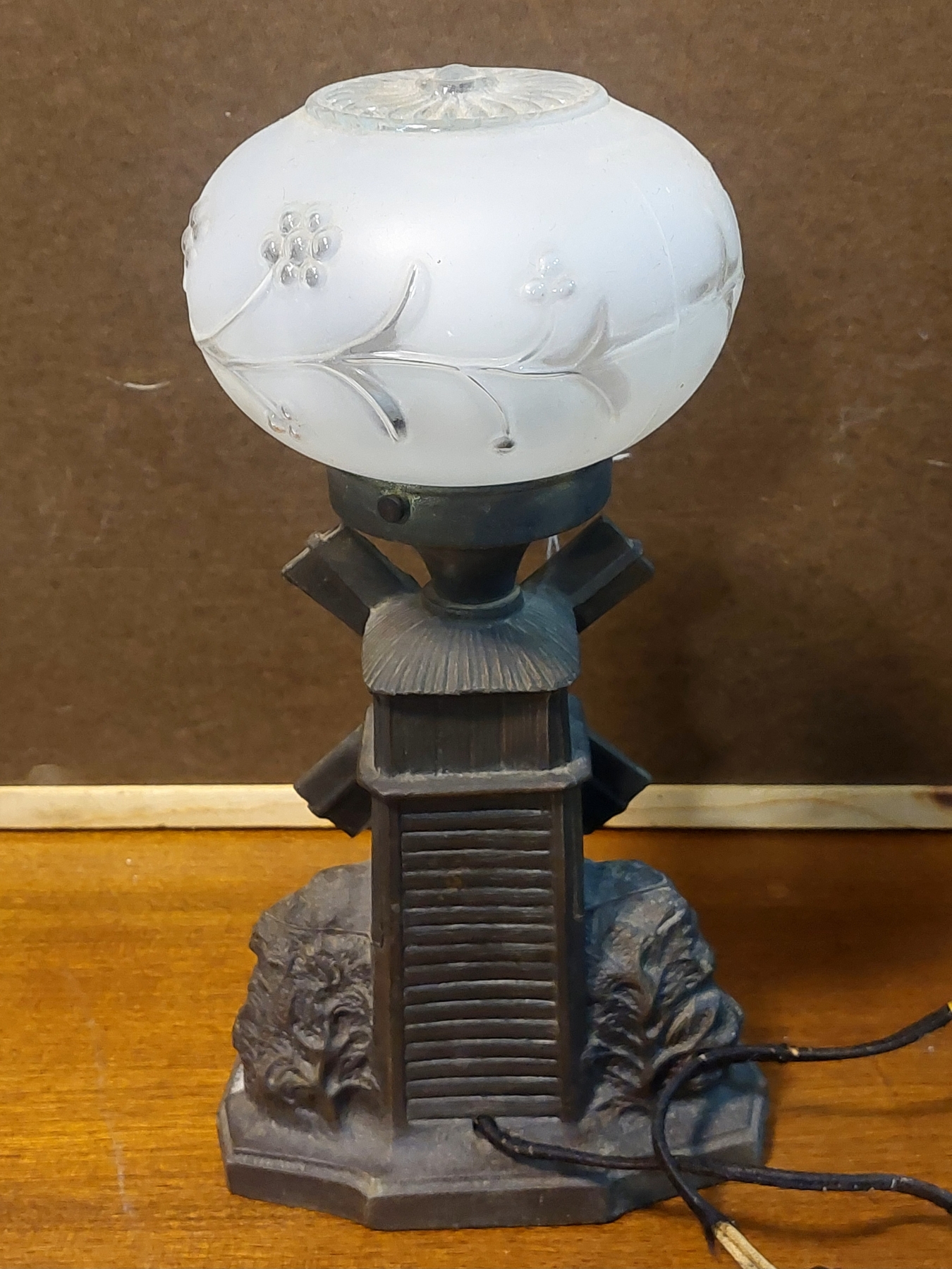 Antique Early ca 1920s Windmill Spelter 14" Tall Table Lamp With Frosted & Etched Globe - Wiring may require upgrade