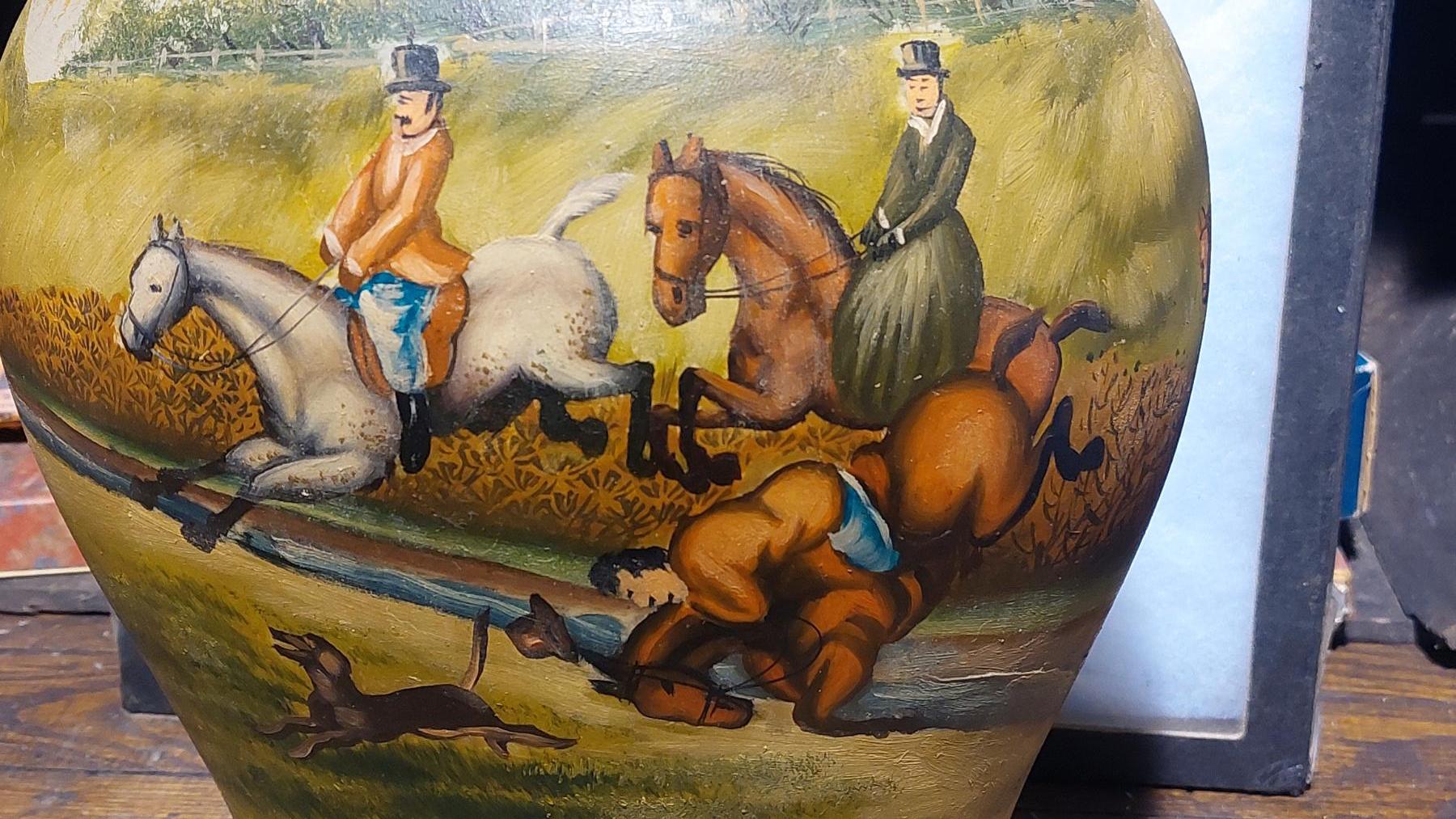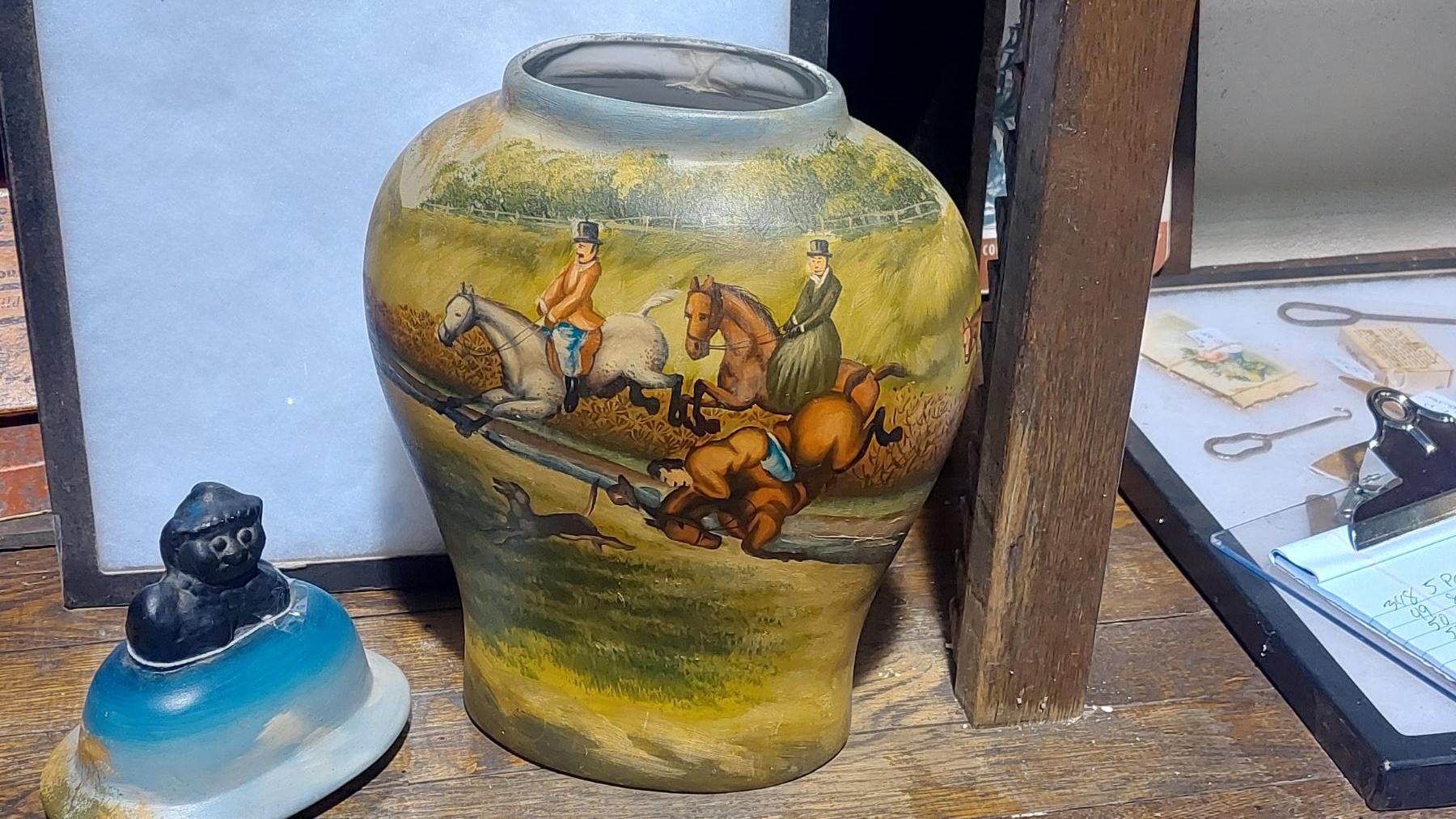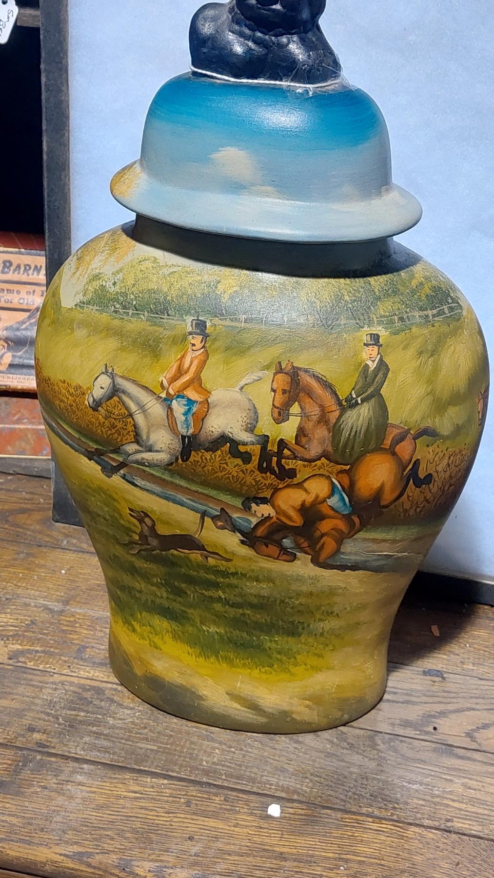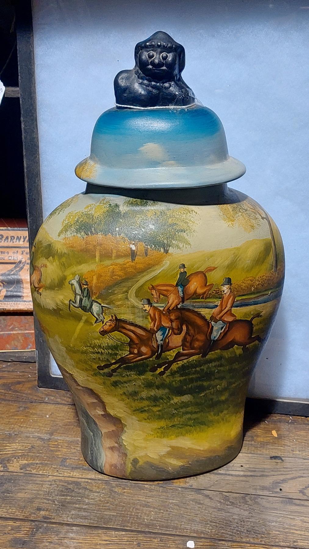 Antique Hand Painted Ceramic Hunting Themed Covered Jar / Vase - See Pics
