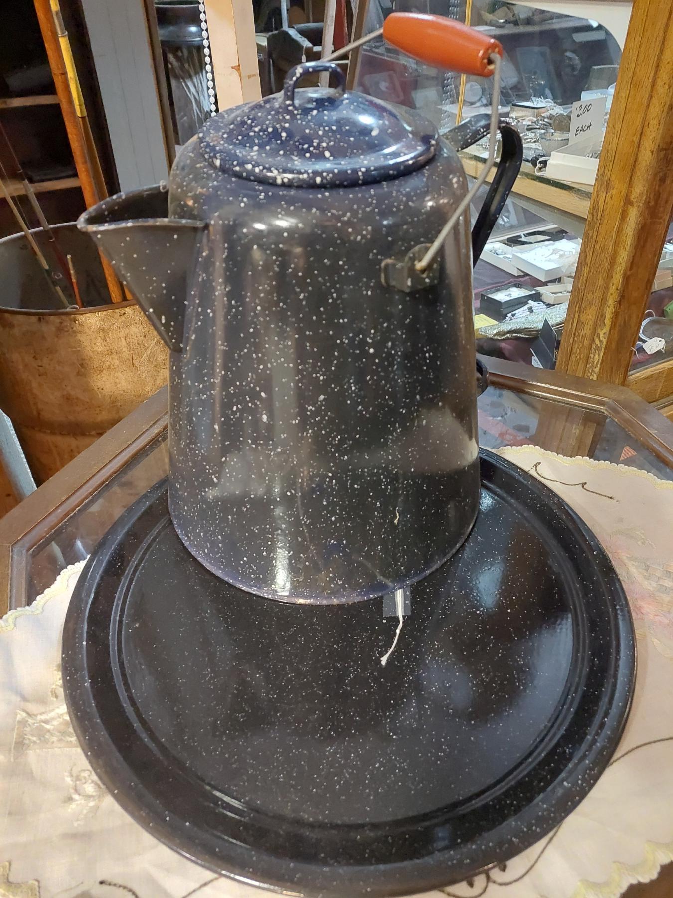 Antique Porcelain Enamel Metal Coffee Pot & Large Charger / Platter - Spatterware