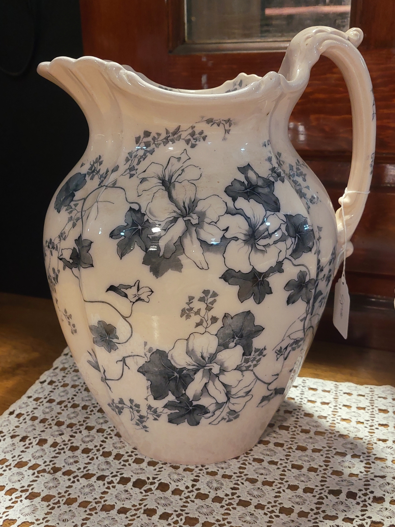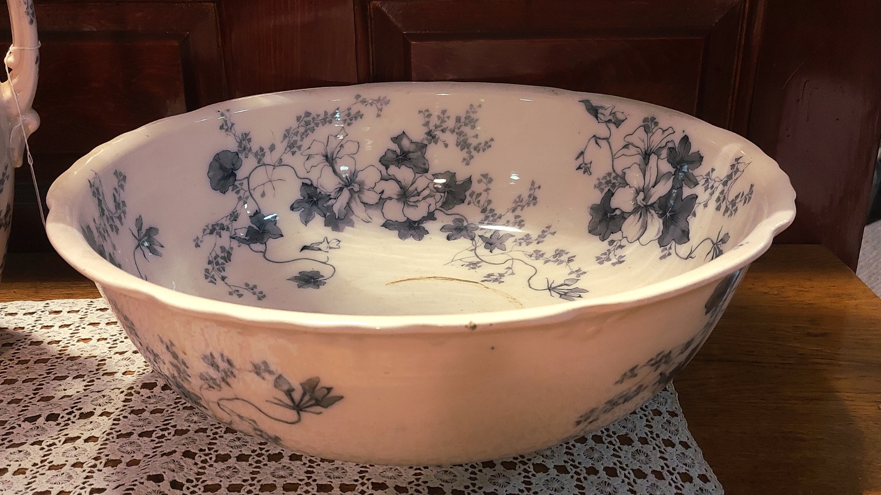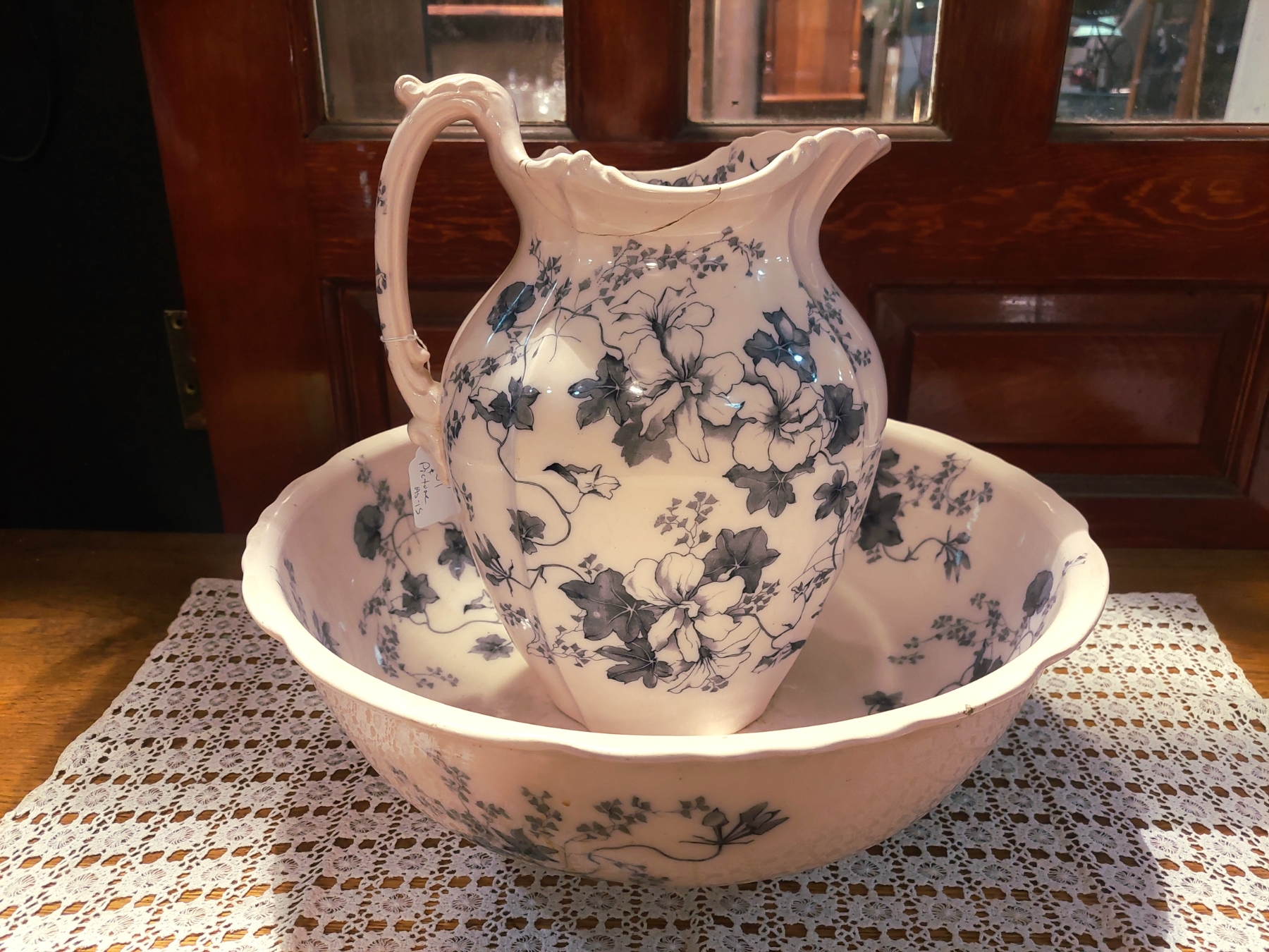 Antique Porcelain Wash Bowl & Pitcher Set - Nice Pink Color With Floral Motif - See Pics "AS IS"