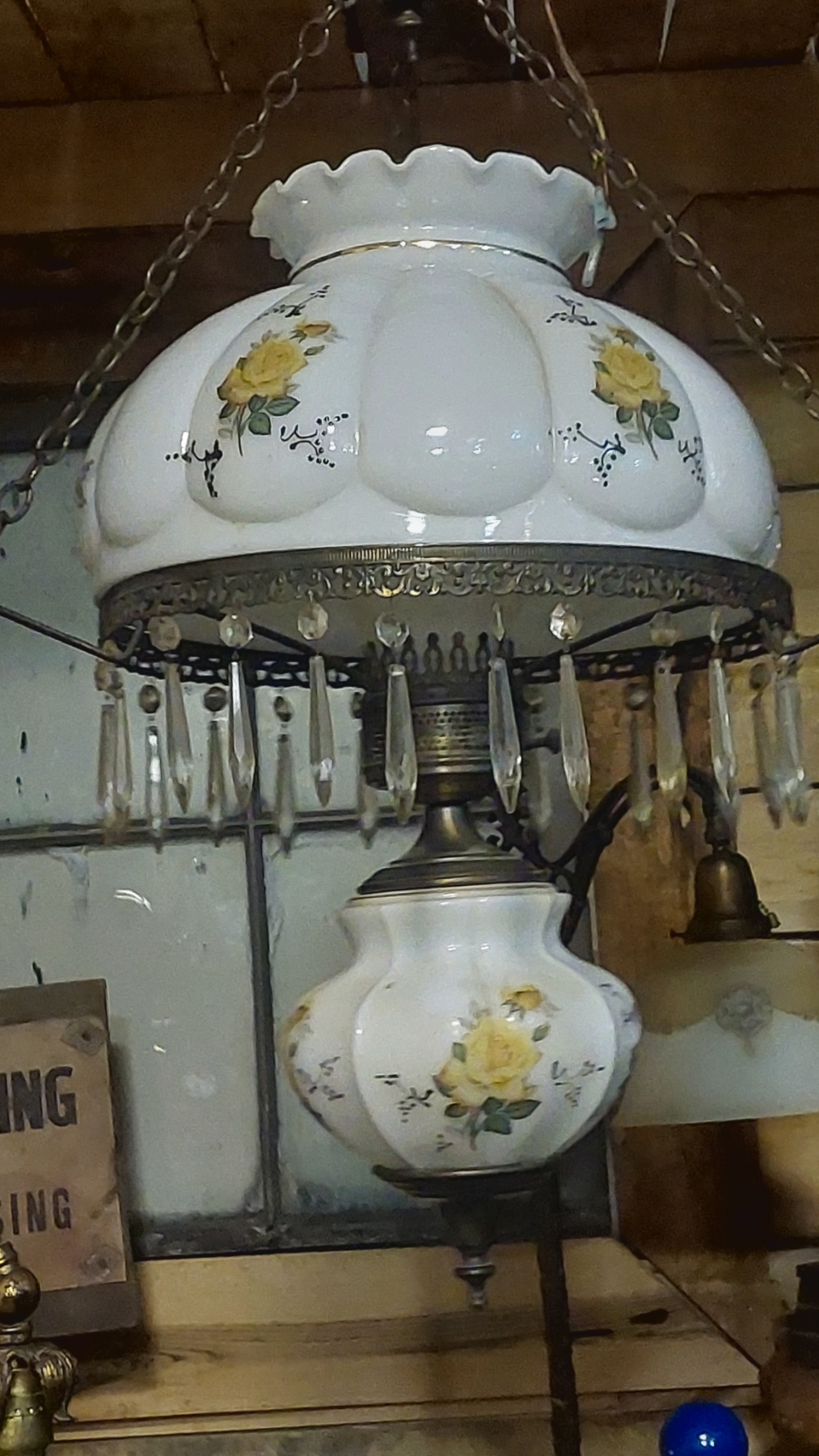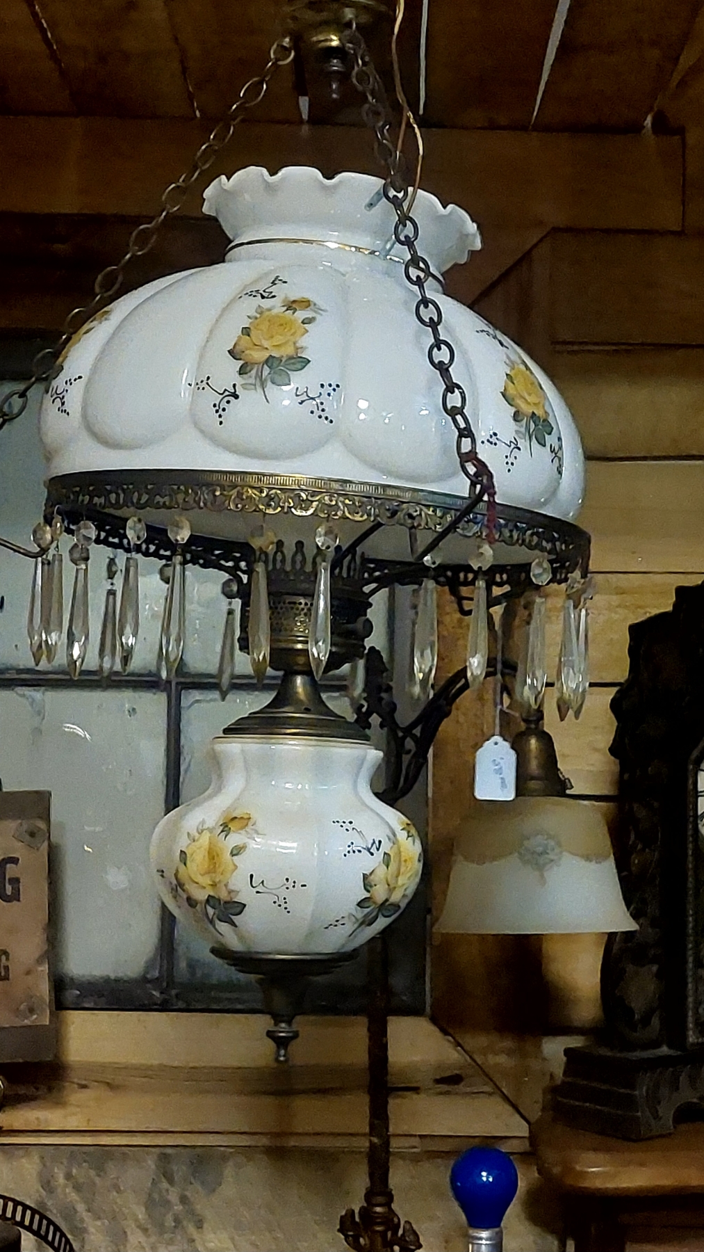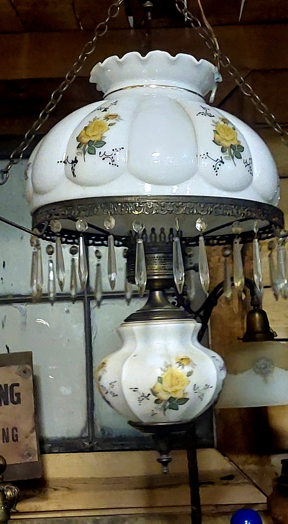 Antique Victorian Hanging Ceiling Candelier / Lamp w / 16" TOS Globe - Electrified - Exc Condition! hand Painted Floral On 'Tam-O-Shanter' Milk Glass Melon Shade Superb Style and Vintage Look.