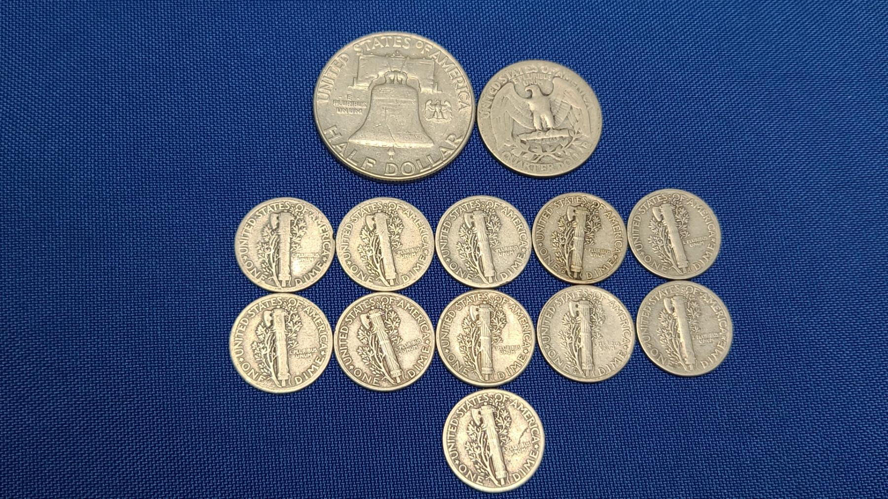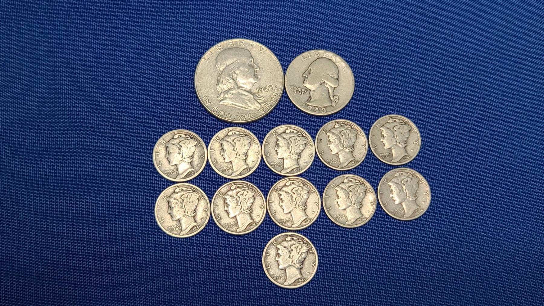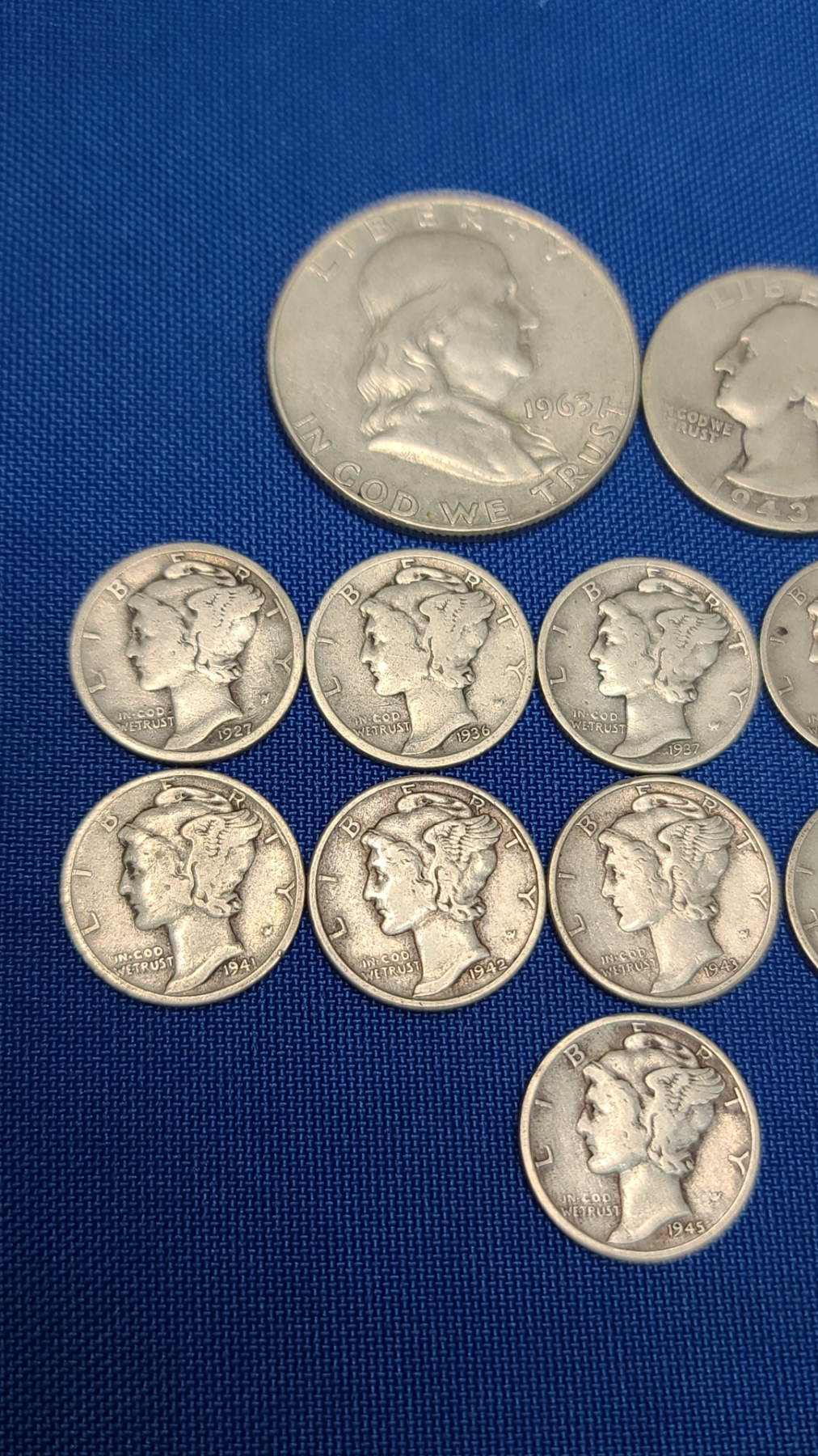Assorted 90% Silver US Coins Including Franklin Half Dollar, Washington Quarters & More -Face Value: $1.85