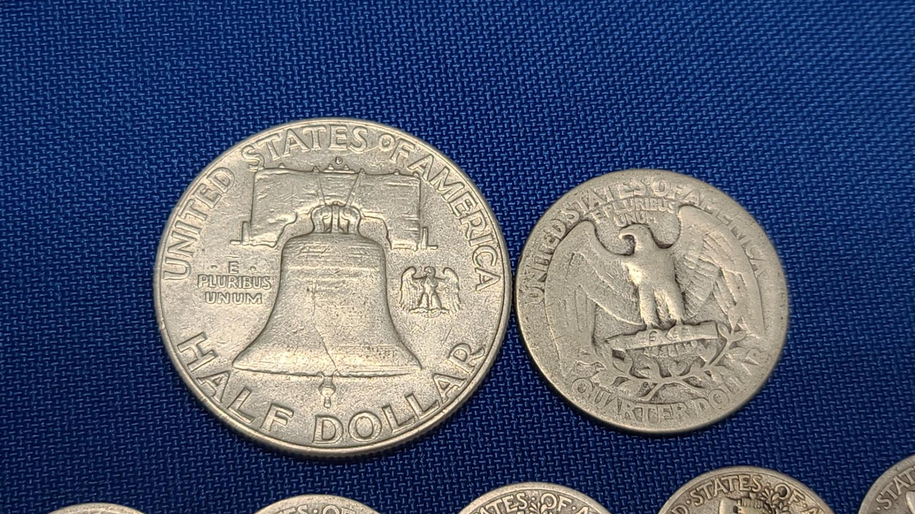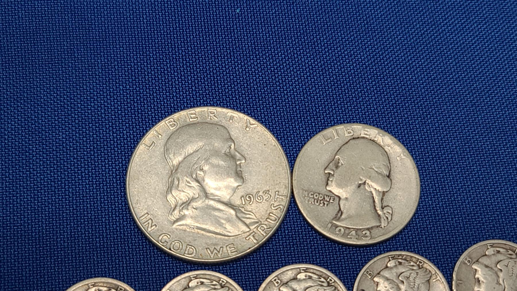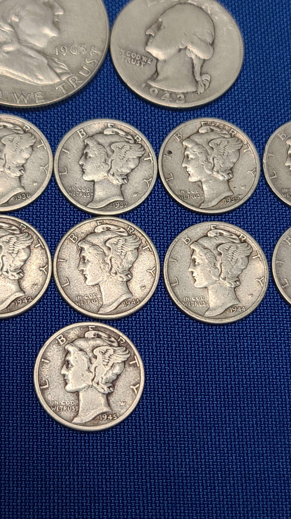 Assorted 90% Silver US Coins Including Franklin Half Dollar, Washington Quarters & More -Face Value: $1.85