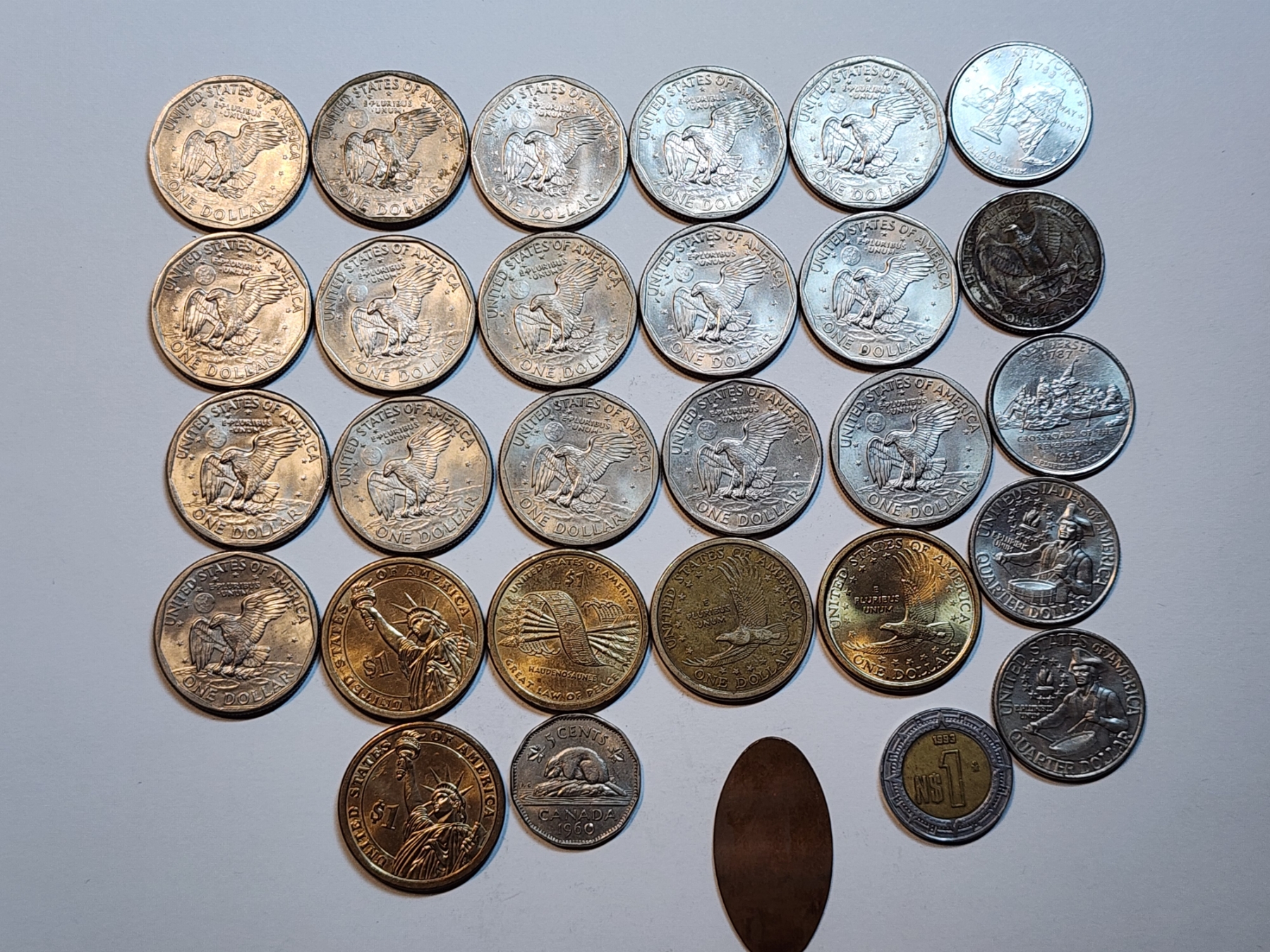 Assorted Coins Including: Susan B. Anthony, Sacagawea Dollars, Quarters, Foreign Coins FV U.S.: $25.25