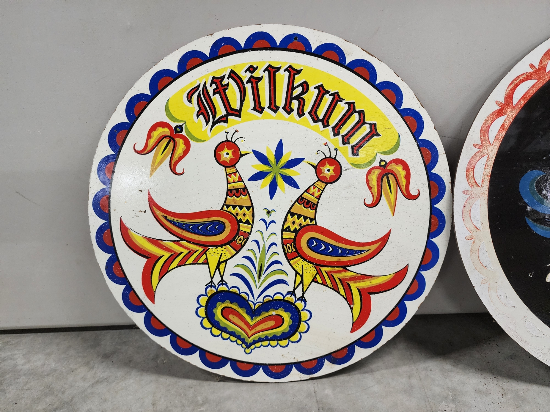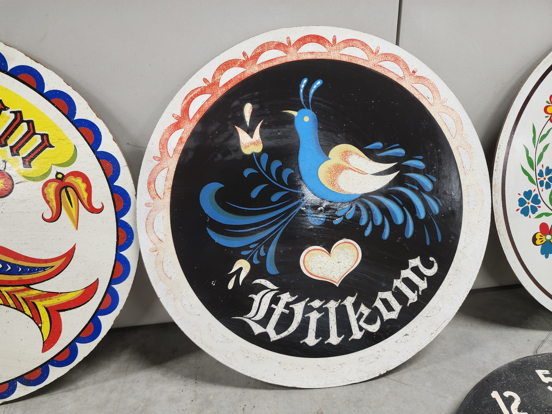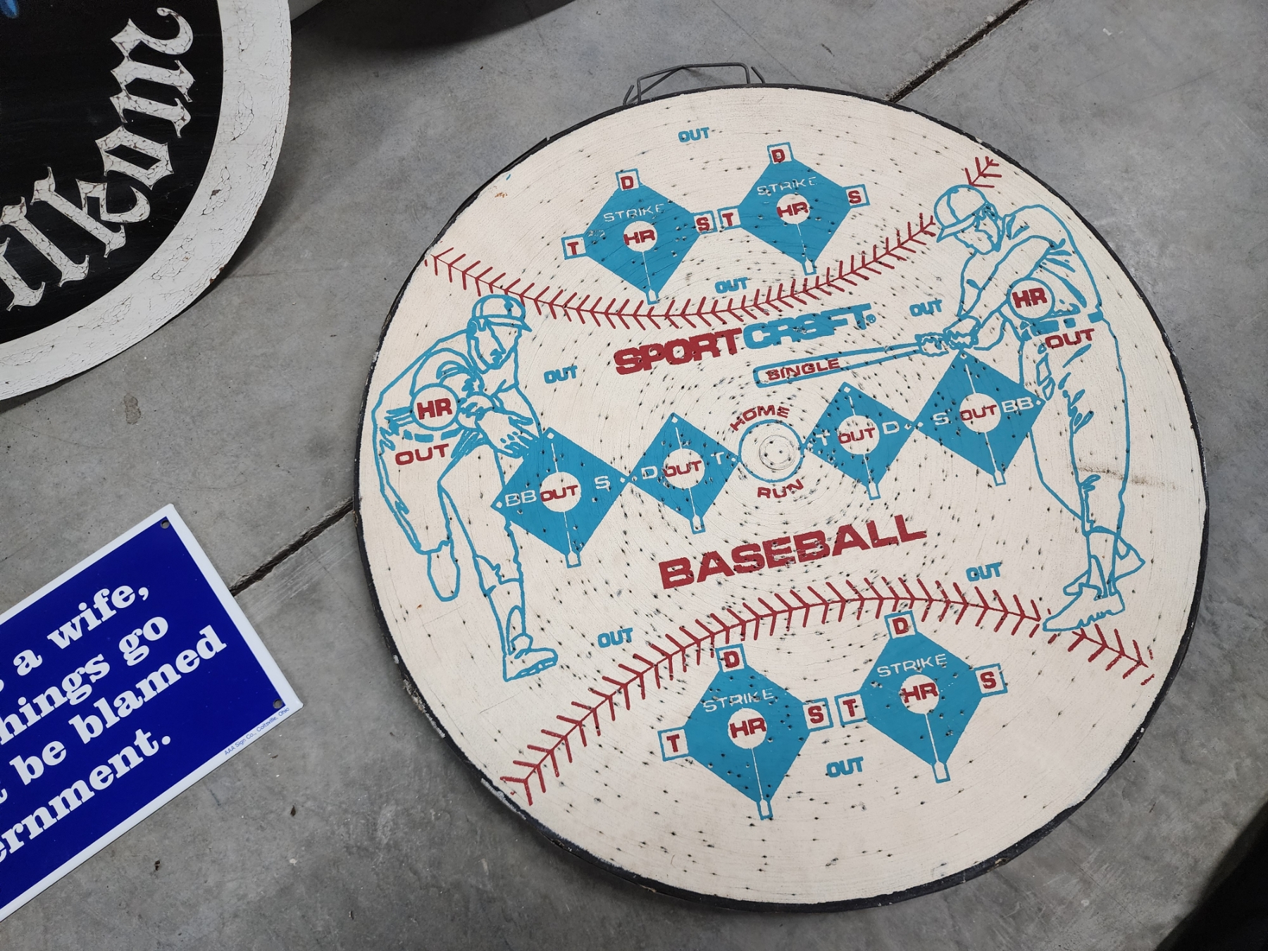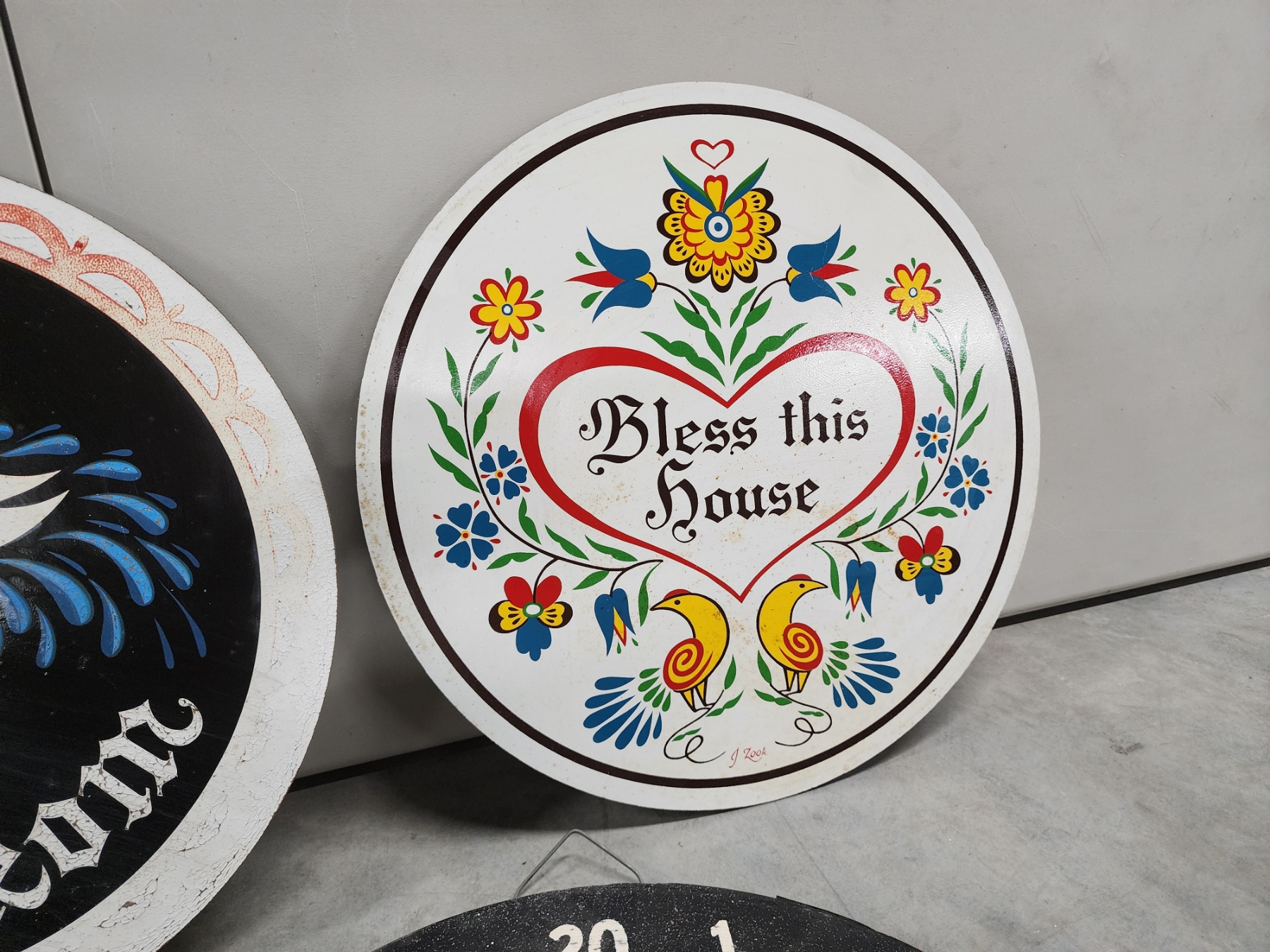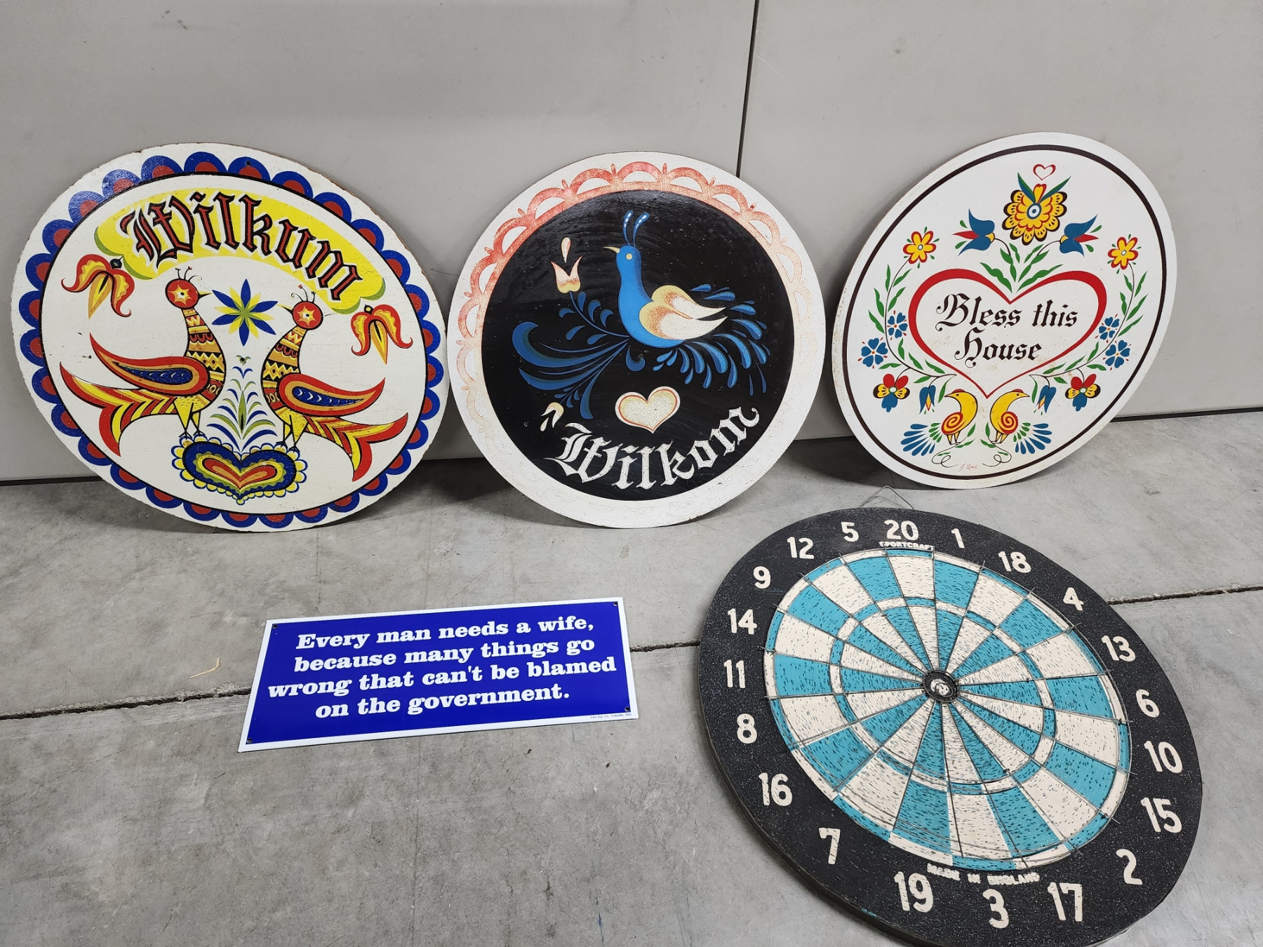 Assorted Decor: 3 Round Colorful Wooden Hex Signs, Dartboard, Text Metal Sign