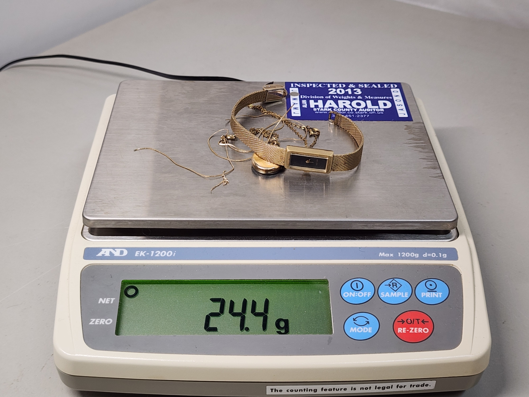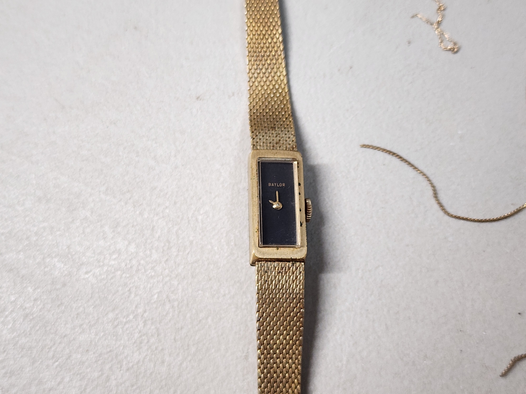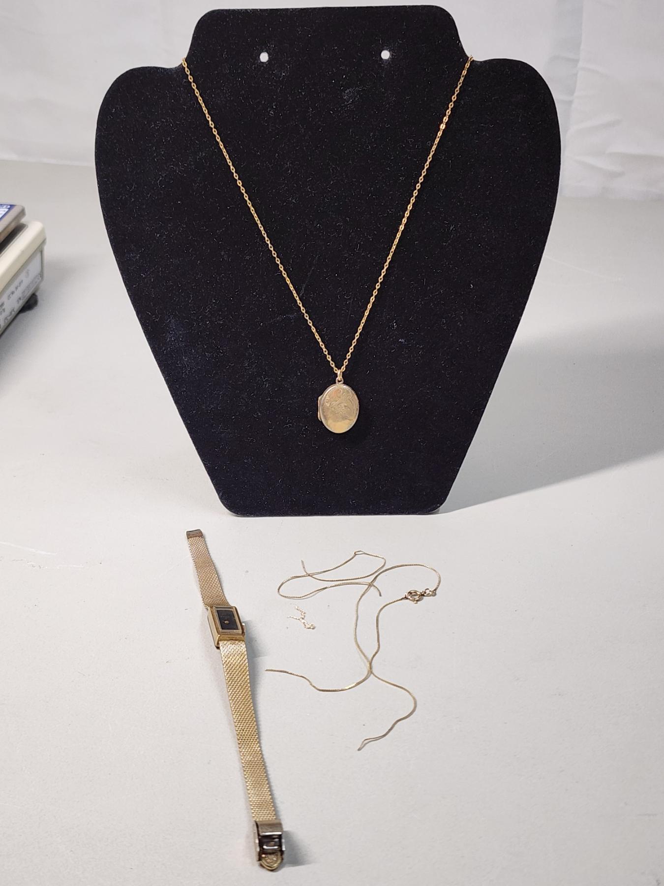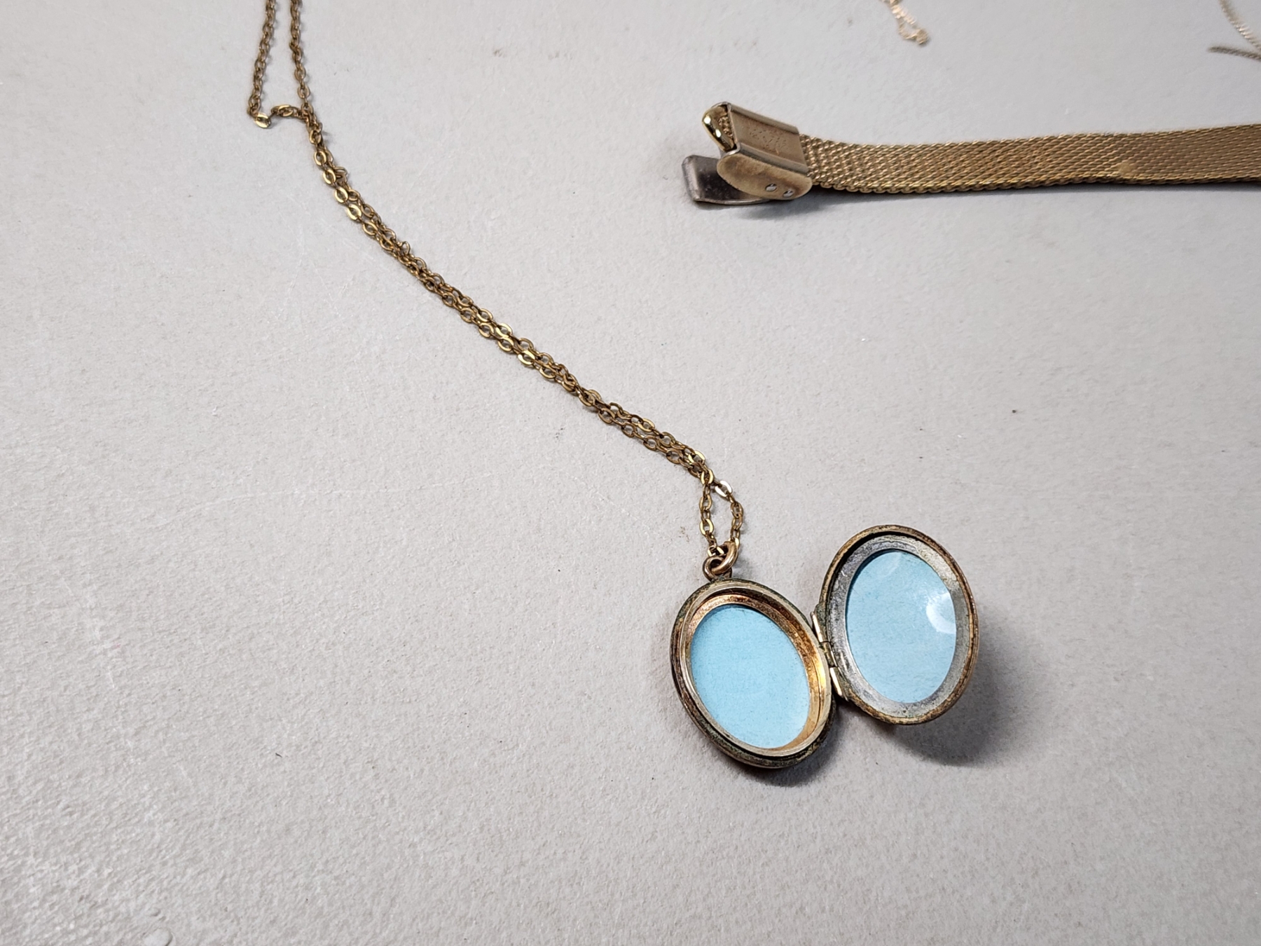 Assorted Gold-Filled Pieces Including Locket Necklace, Baylor Watch, & Chains